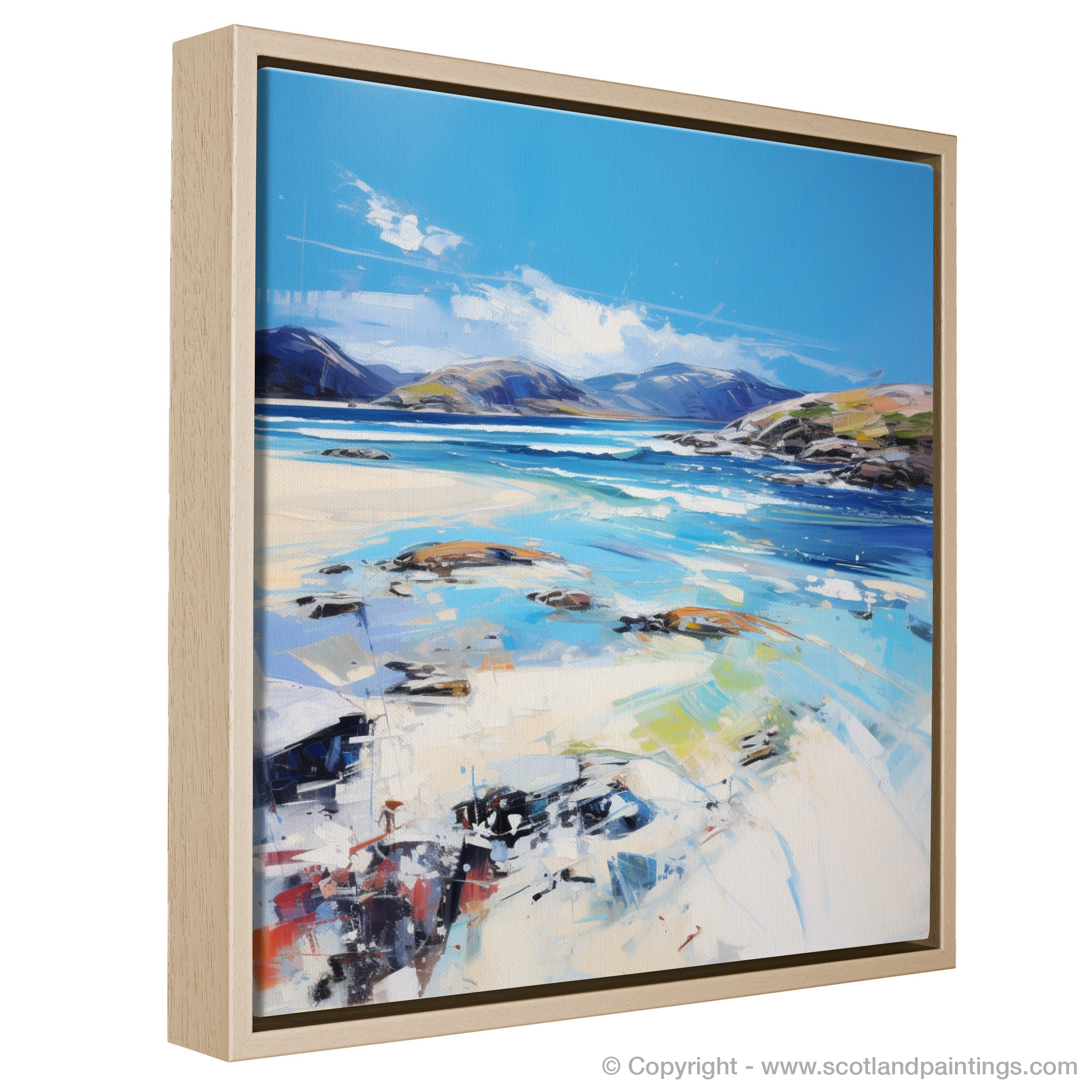 Vivid brushstrokes in a symphony of azure, cobalt, and white evoke the rushing waves as they meet the pristine sands, while hints of amber, beige, and slate portray the rugged beachscape strewn with smooth, weather-worn rocks. The expansive sky, rendered in bold strokes of cerulean and white, reflects a sense of freedom and the unpredictable nature of the Hebridean weather.