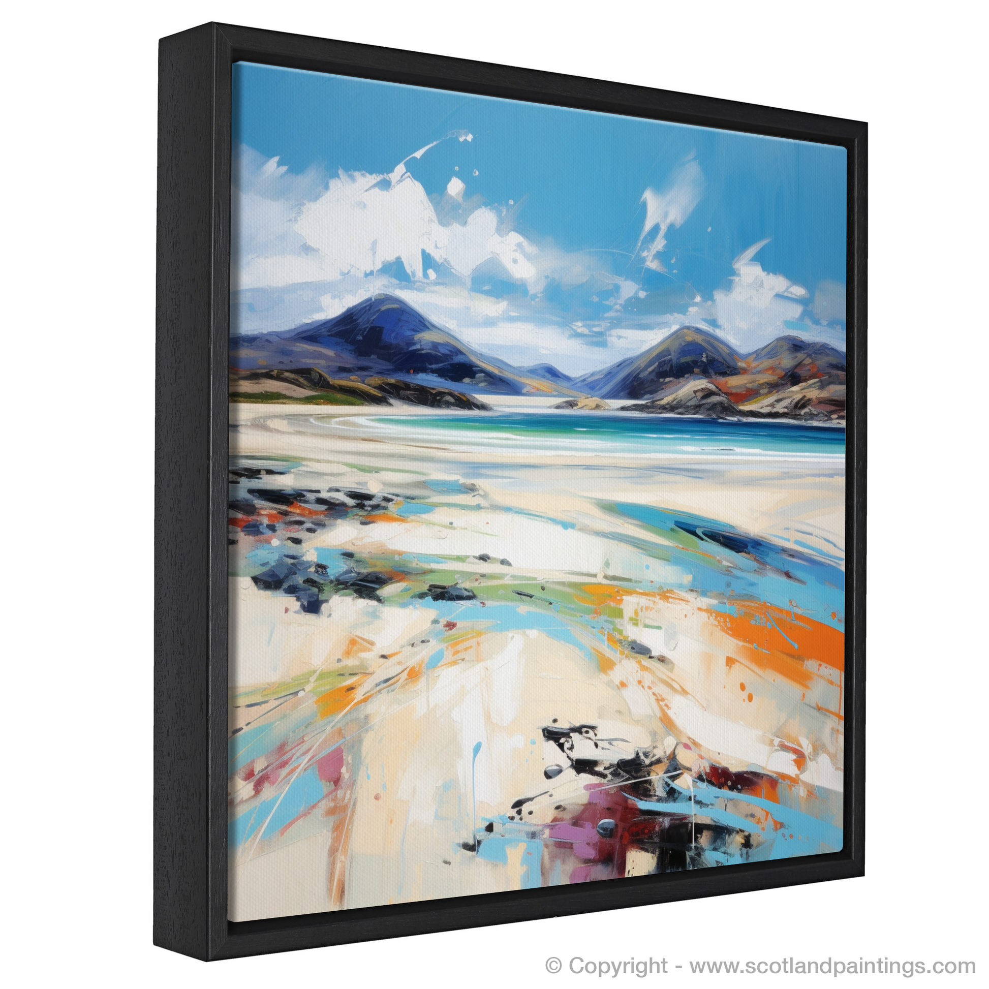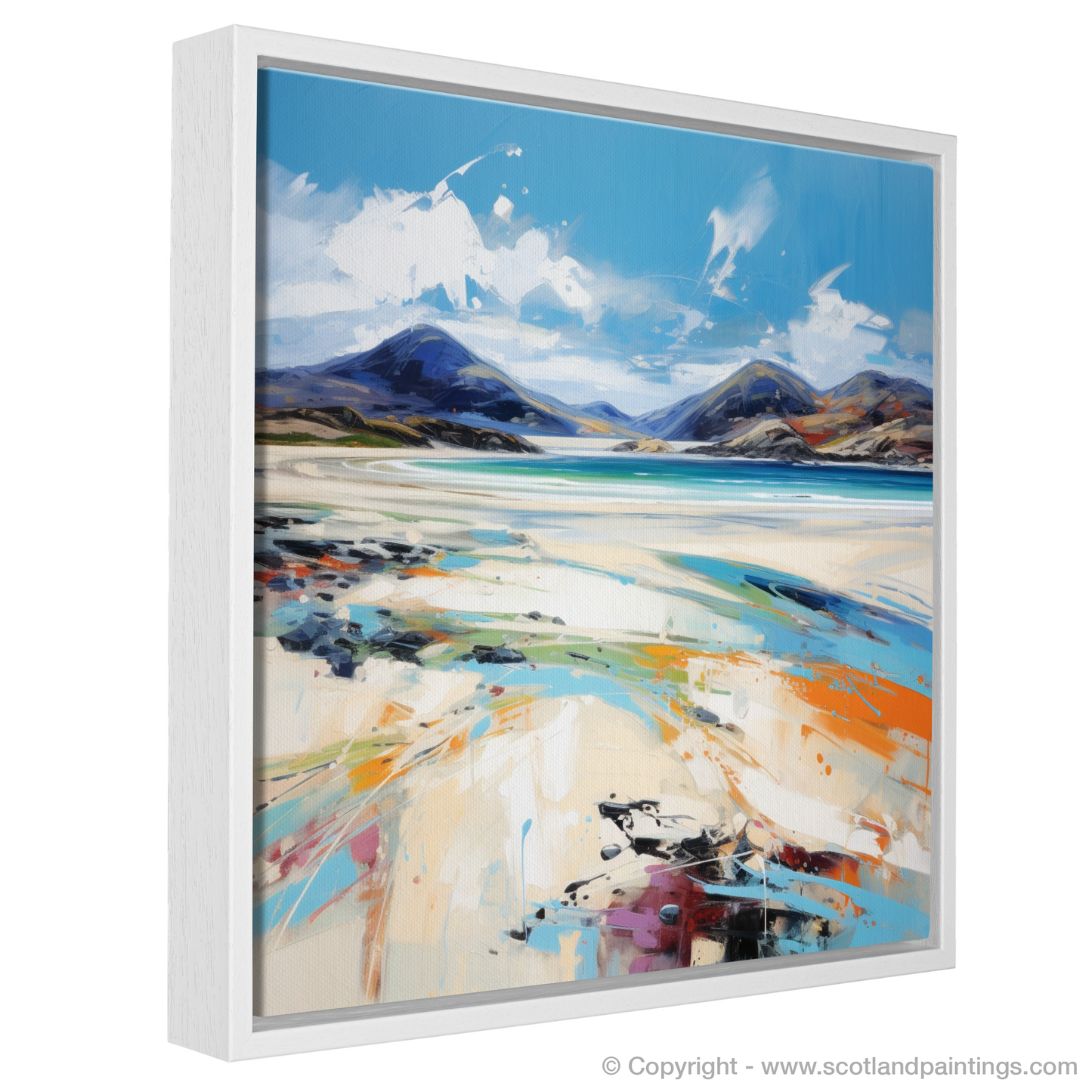 This striking print captures the raw, untamed beauty of Luskentyre Beach on the Isle of Harris with a vibrant expressionistic flair. Rich, impasto strokes of azure and cerulean depict the sweeping skies, while softer, underlying washes of colour suggest the gentle passage of clouds. Below, the expansive beach is rendered with a palette knife's urgency, its white sands shimmering amidst streaks of sage, amber and cool ivory tones.