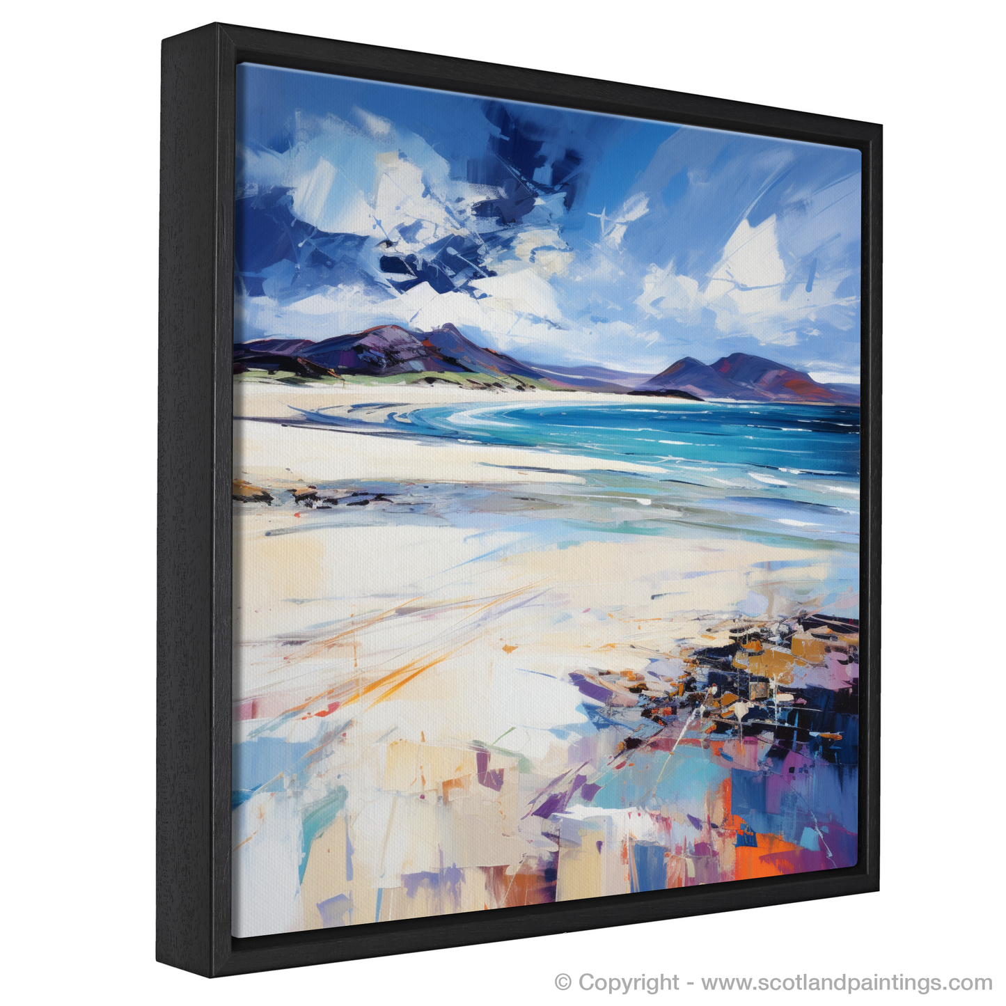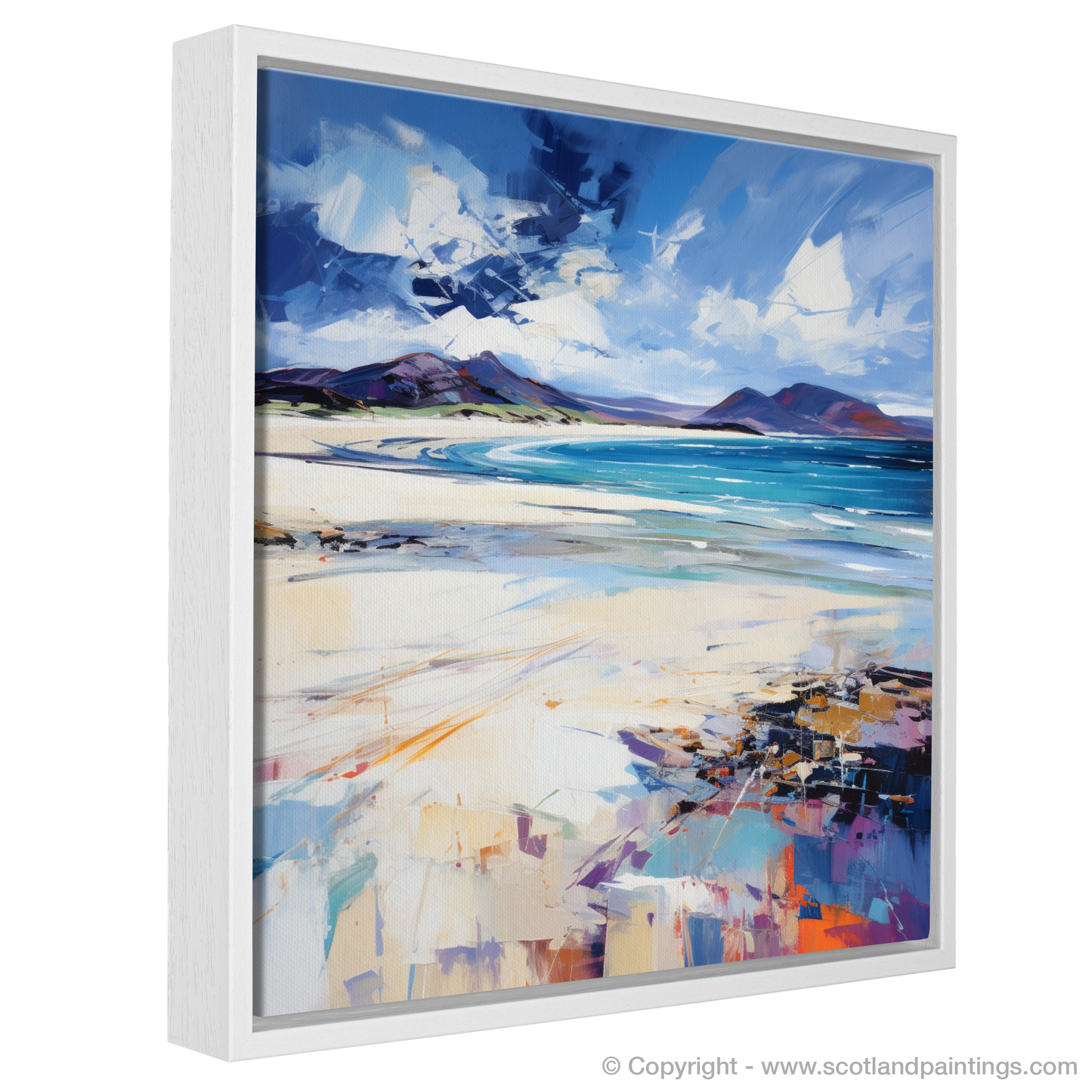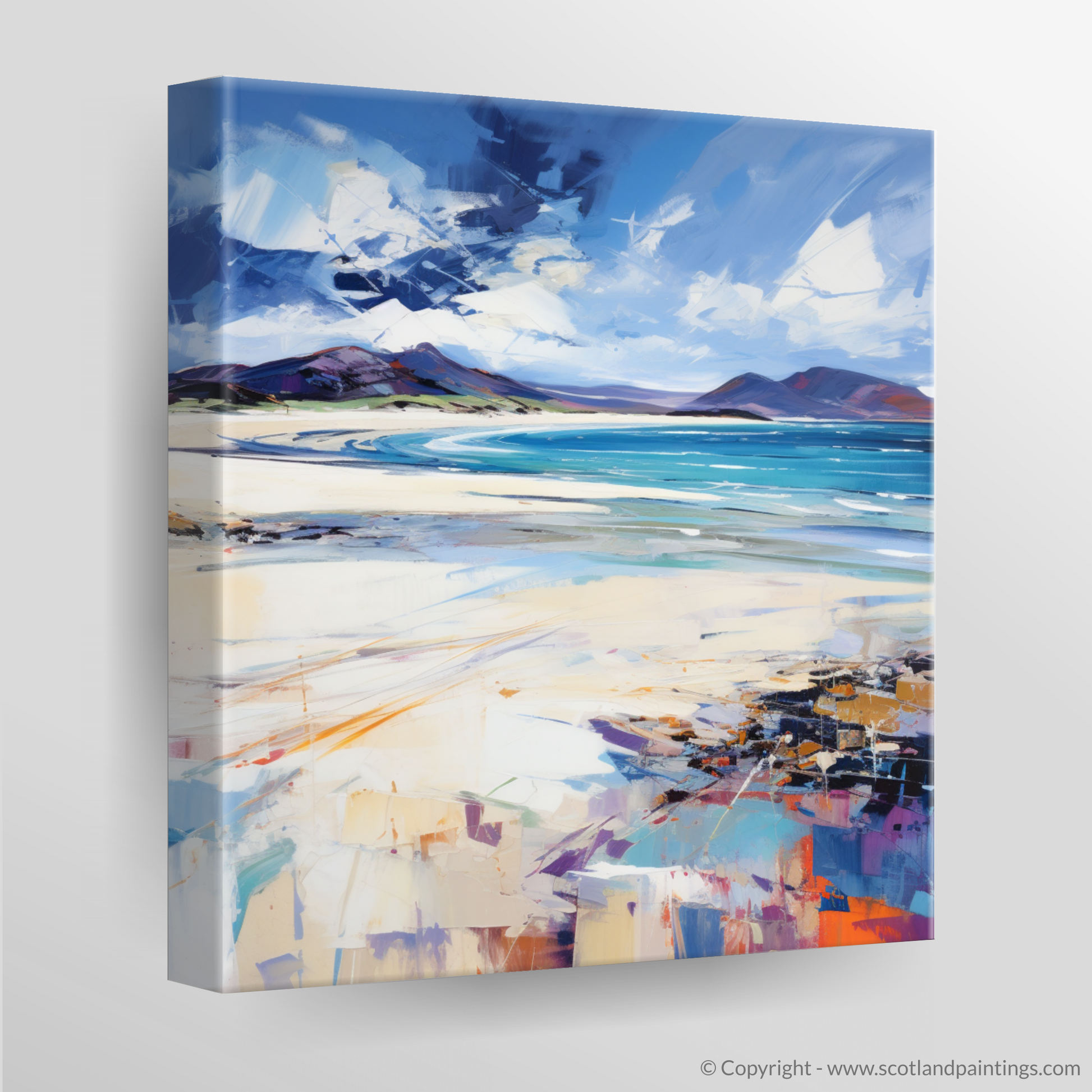 This evocative piece, inspired by the raw beauty of Luskentyre Beach on the Isle of Harris, captures the untamed spirit of Scotland's coastlines. With an expressionist flair, vibrant strokes and bold colours blend to convey the beach's dynamic atmosphere. The canvas is alive with the contrasting elements of nature; deep blues and teals illustrate the water's depth and purity, while the sweeping brushwork in the sky suggests movement, like clouds racing overhead on a brisk day.