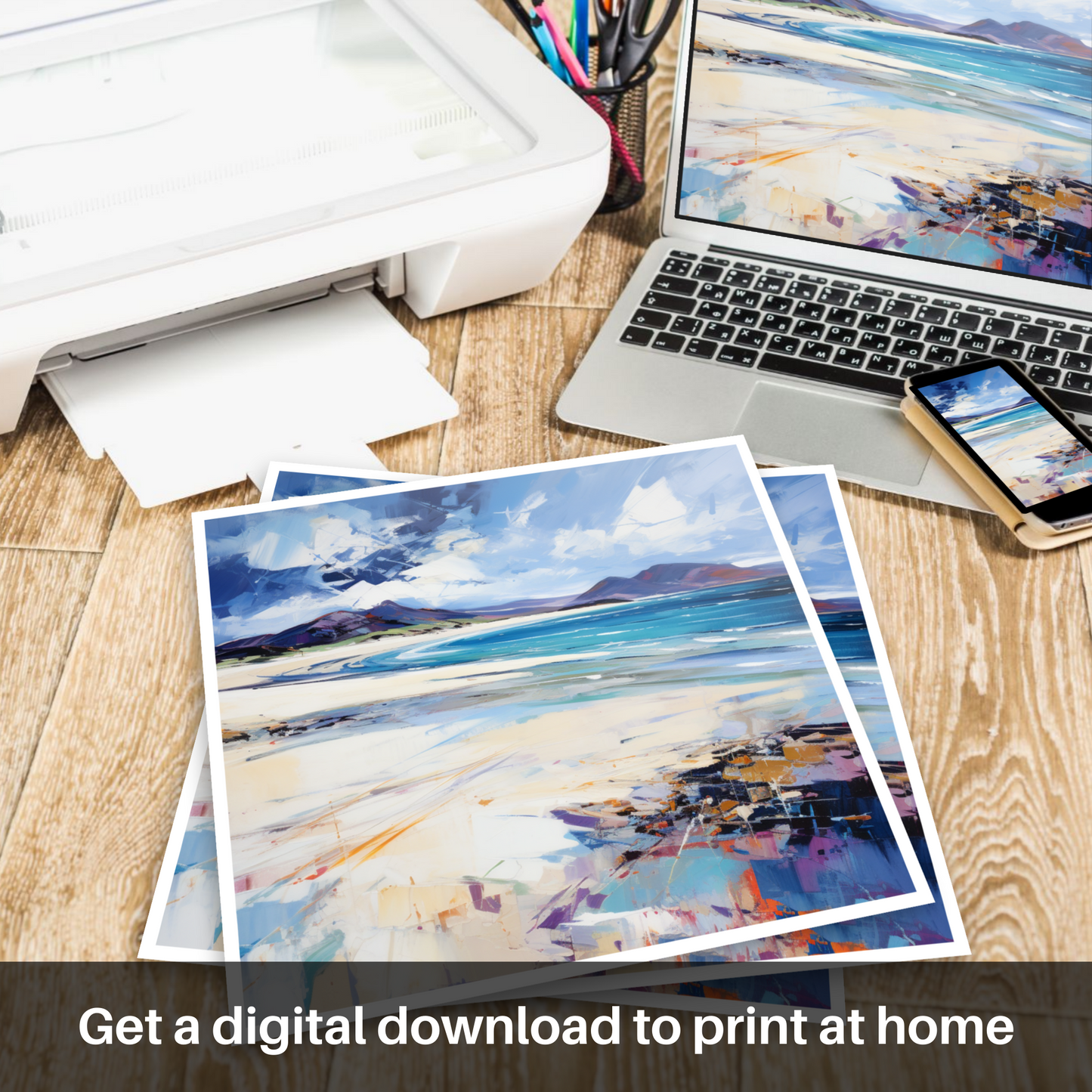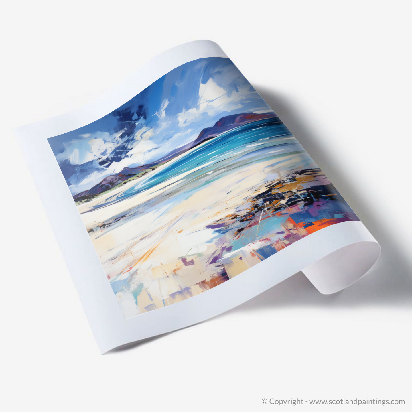 This print is an abstract interpretation where the interplay of light and shadow, combined with the textured application of paint, creates a lively and immersive seaside landscape. It is at once a testament to the expressionist style and a tribute to the dramatic vistas of the Scottish beaches. Each print offers an opportunity to bring the wild, untamed essence of Scotland's natural beauty into your space.