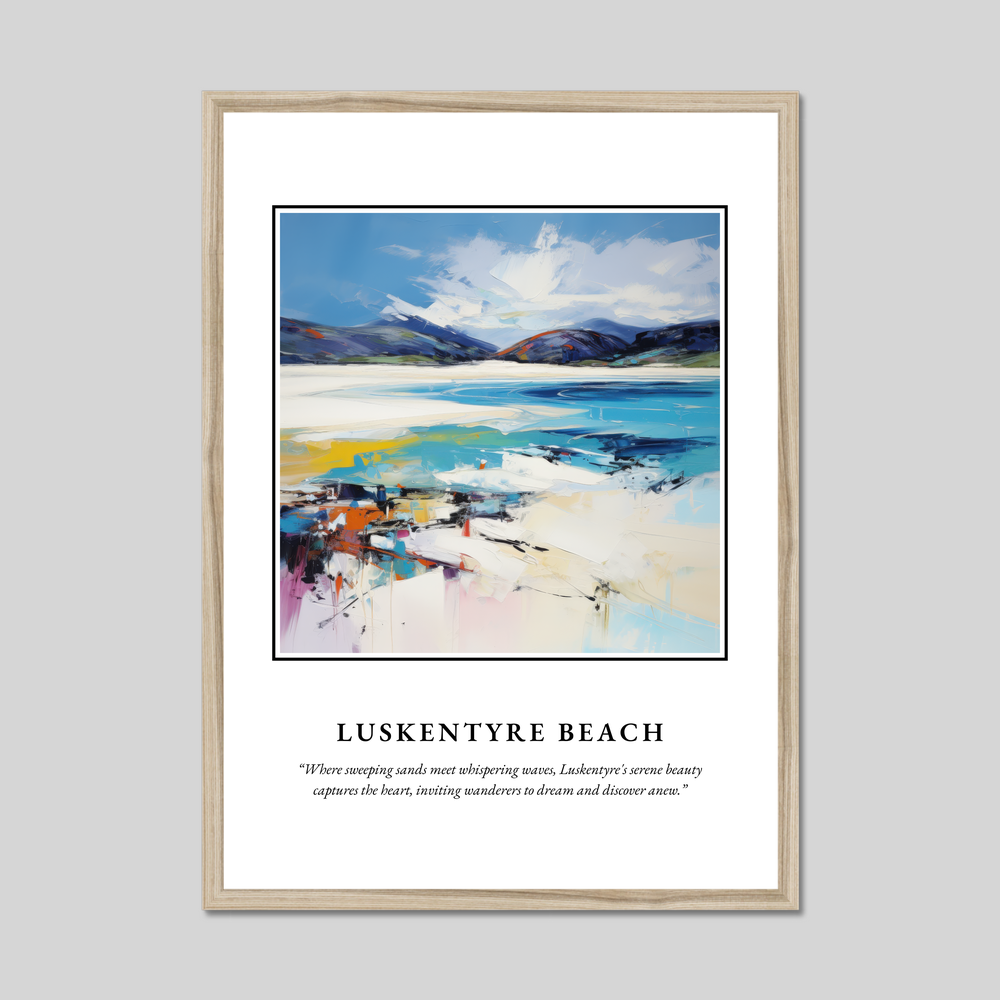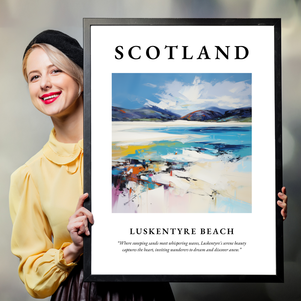 The poster boldly features the word “SCOTLAND” in big, bold lettering, leading your eye to the vibrant expressionist painting of Luskentyre Beach. The painting vividly captures the sweeping sands and whispering waves that define this serene seascape. Energetic brushstrokes merge to represent the dynamic interplay of land, sea, and sky, with a kaleidoscope of colours that echo the natural beauty and wild essence of the beach. Below, a quote beautifully encapsulates the spirit of the scene: “Where sweeping sands meet whispering waves, Luskentyre's serene beauty captures the heart, inviting wanderers to dream and discover anew.”