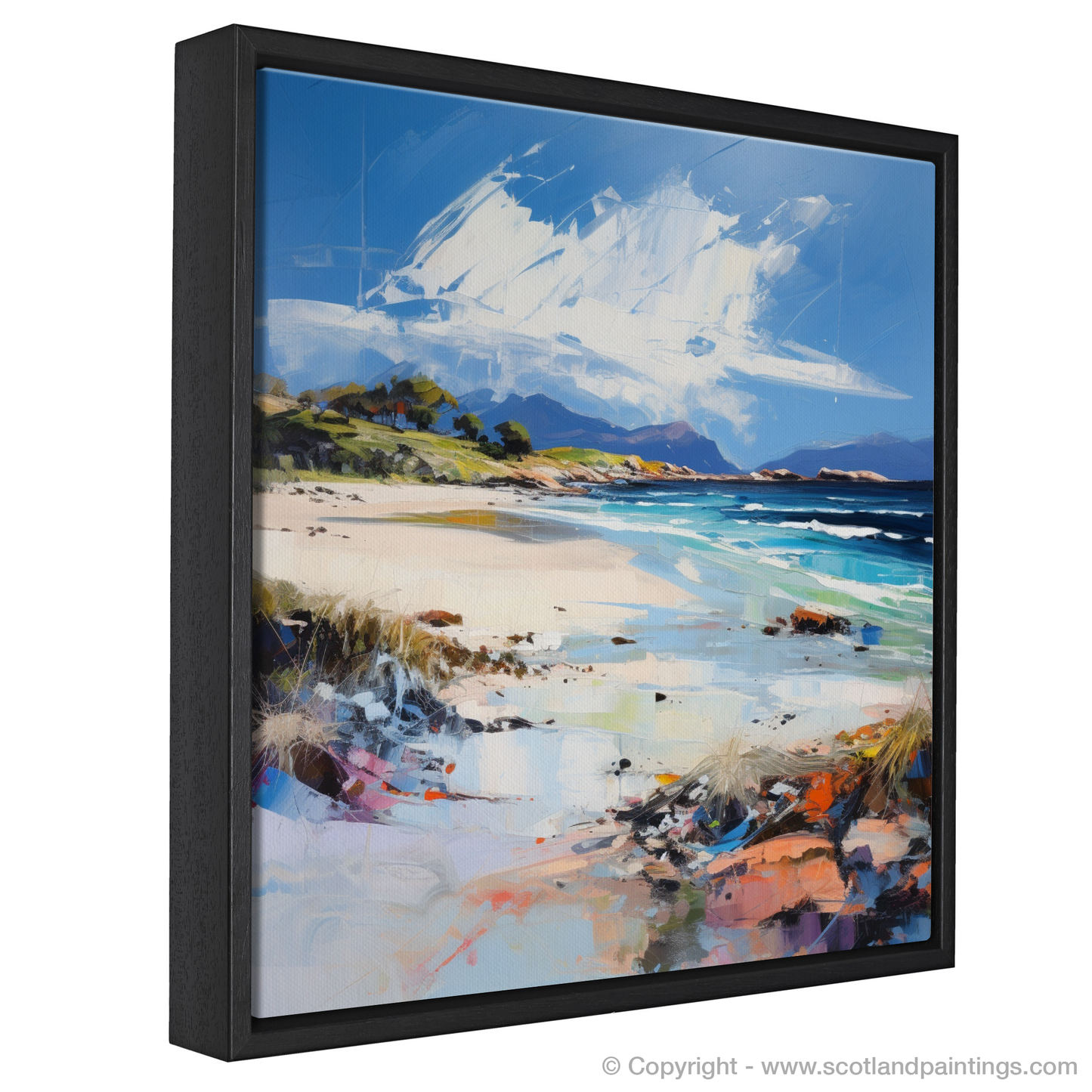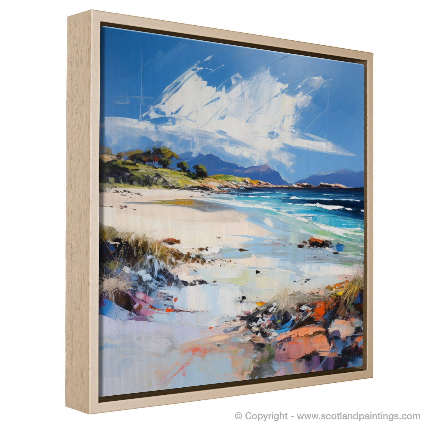 This depiction of Camusdarach Beach is not merely a visual representation but an emotional interpretation, inviting viewers to explore the interplay of light, color, and form. Each print promises to infuse any space with the essence of Scotland's coastal splendour, offering a piece of its soul-stirring beauty to all who gaze upon it.