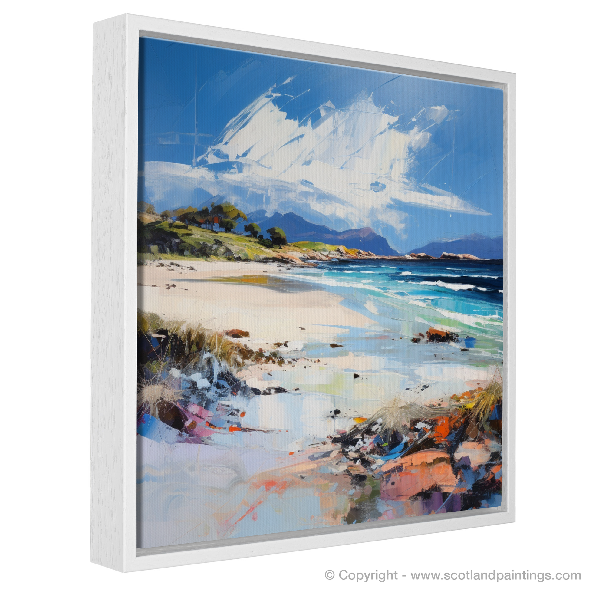 Captured through the evocative strokes of Expressionism, this print presents a vibrant interpretation of Camusdarach Beach in Arisaig, a locale renowned for its arresting natural beauty. The artwork brims with dynamism, as brisk applications of paint convey the wild essence of the Scottish coast. Vivid blues and turquoises depict the clear waters that caress the sandy shores, while dashes of white and azure suggest an expansive, mesmerising sky overhead.