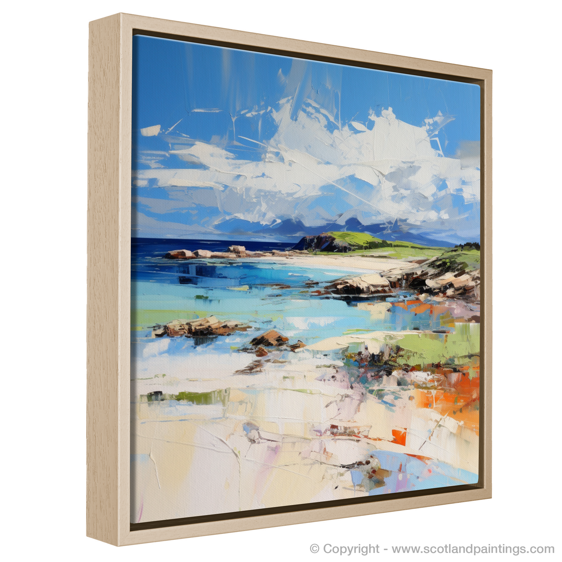 This captivating piece is a vibrant expression of Camusdarach Beach, one of Scotland's most picturesque coastal gems. The artwork exudes a dynamic energy, typical of the Expressionist style, where bold brushstrokes and an evocative use of colour are utilised to convey the emotional experience of the landscape rather than a precise likeness.