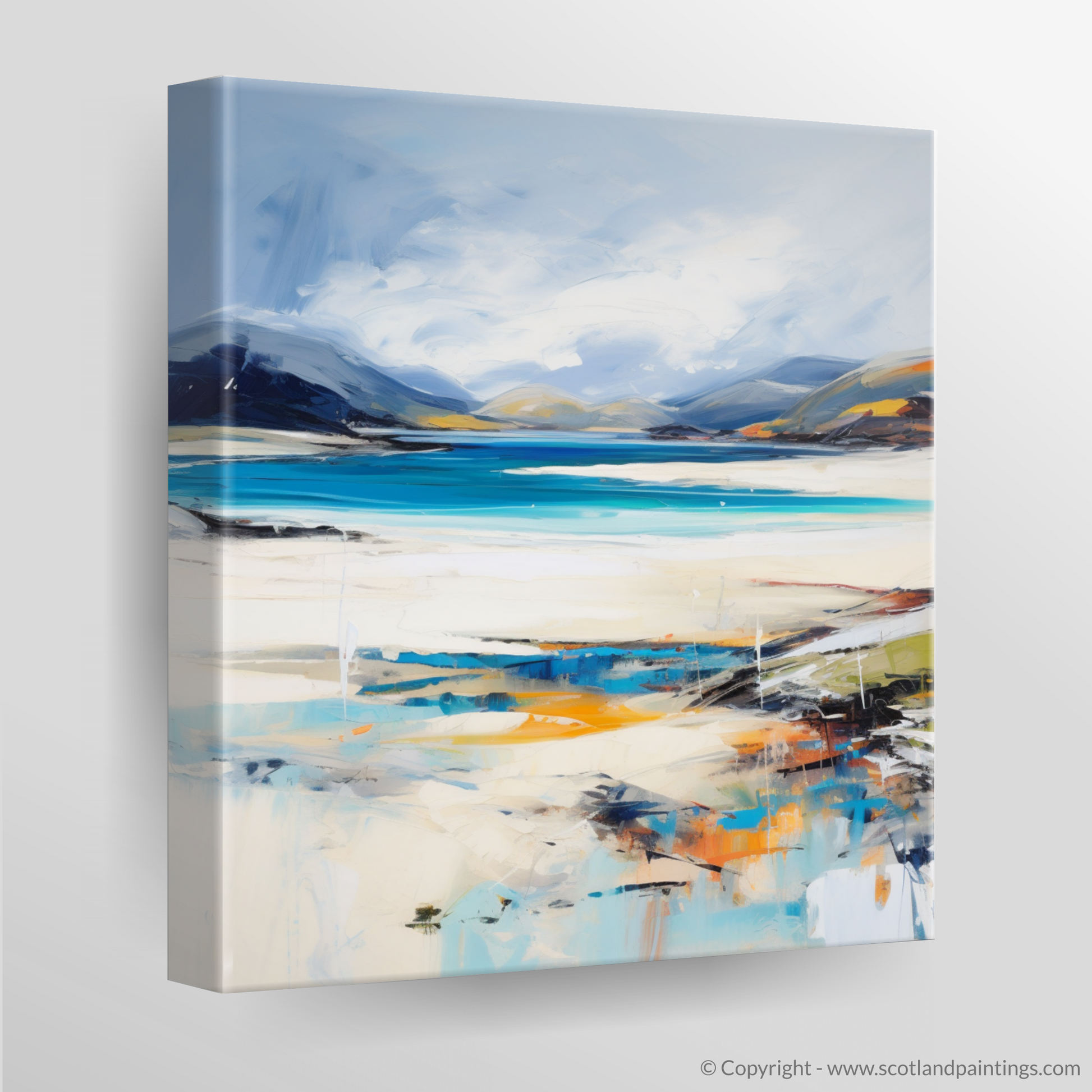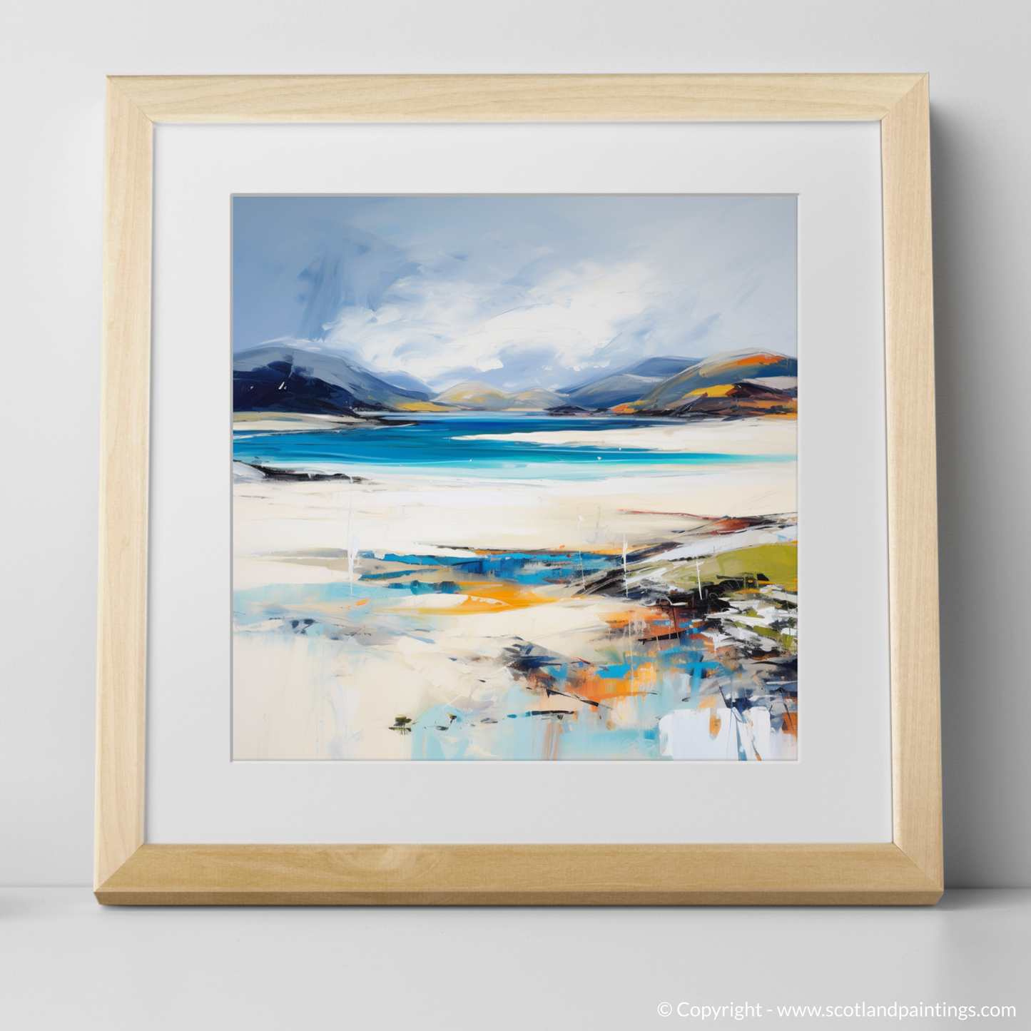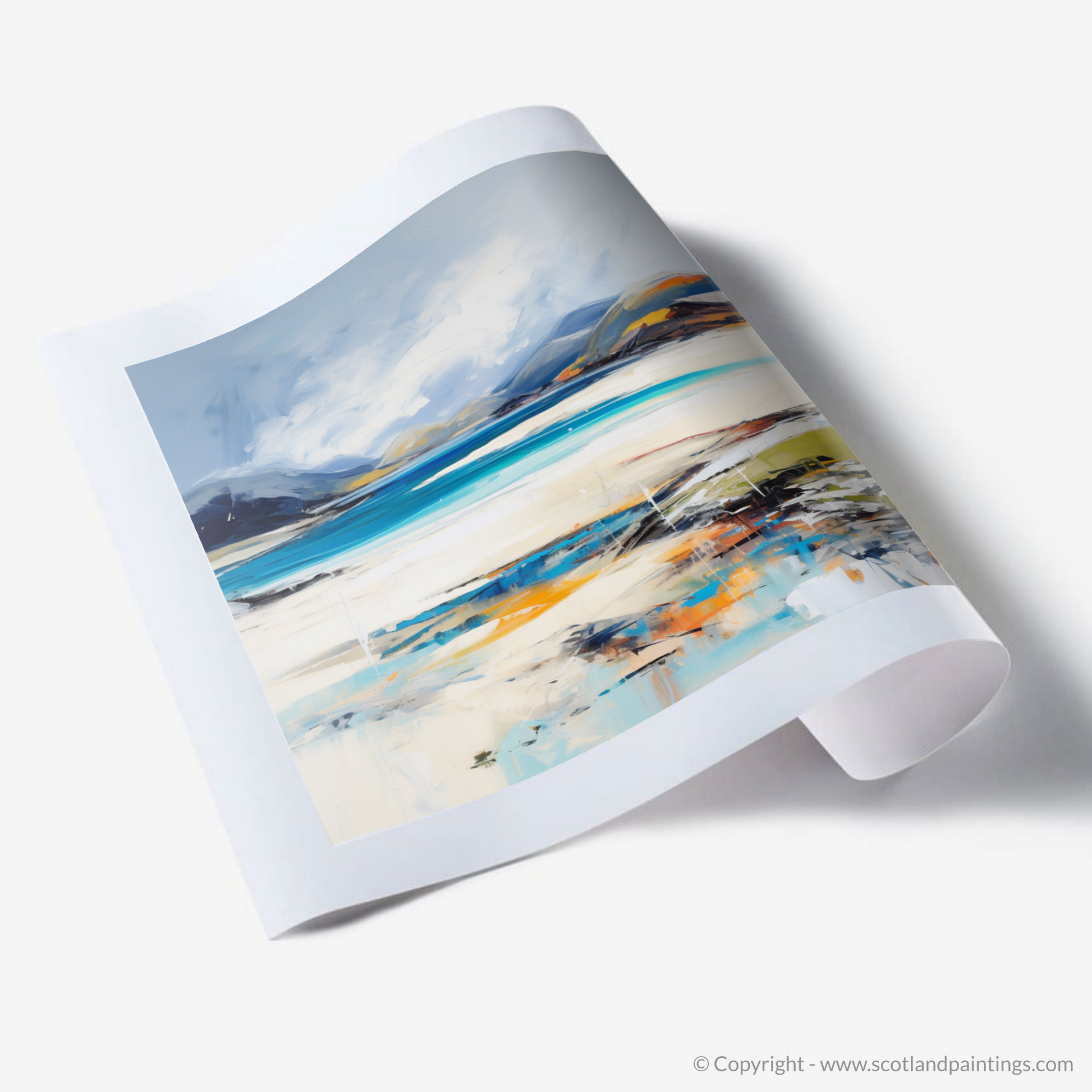 Capturing the raw, untamed beauty of Luskentyre Beach on the Isle of Harris, this stirring print invites viewers into a mesmerising landscape shaped by bold brushstrokes and a vivid colour palette. Evocative of the famed white sands and turquoise waters that define this Scottish paradise, the artwork reflects the dynamic interplay of natural light and the rugged coastal terrain.