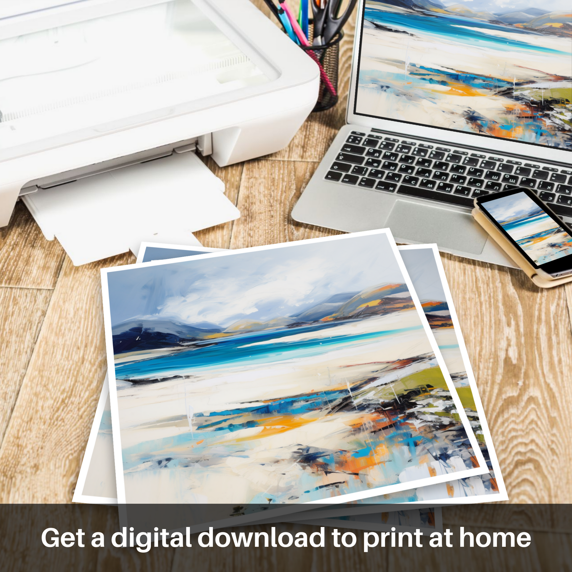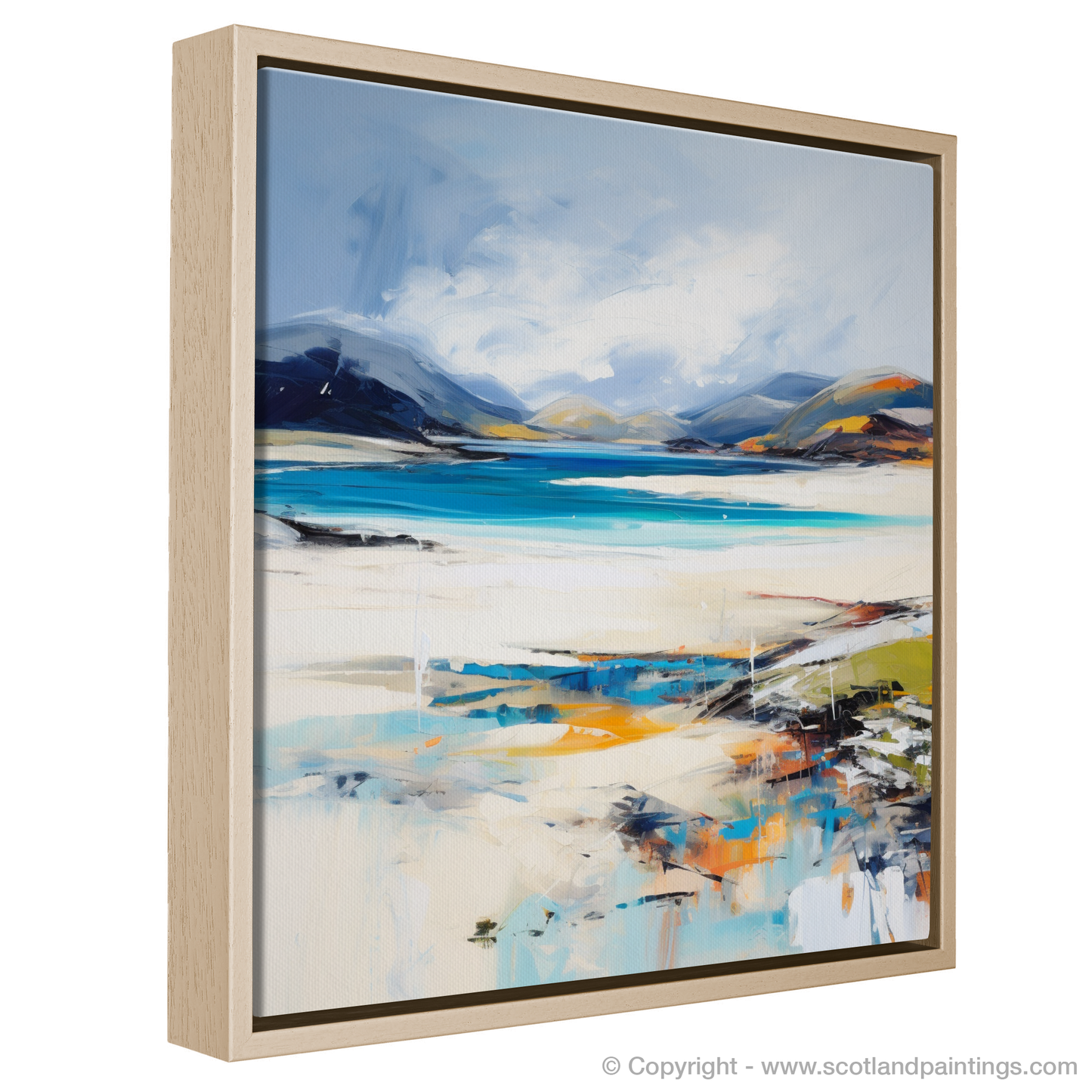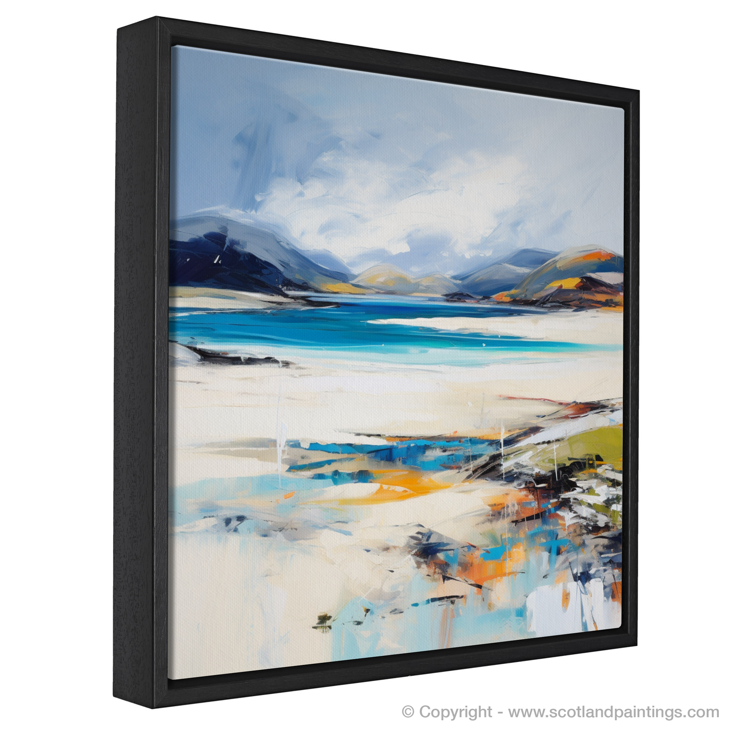 Capturing the raw, untamed beauty of Luskentyre Beach on the Isle of Harris, this stirring print invites viewers into a mesmerising landscape shaped by bold brushstrokes and a vivid colour palette. Evocative of the famed white sands and turquoise waters that define this Scottish paradise, the artwork reflects the dynamic interplay of natural light and the rugged coastal terrain.