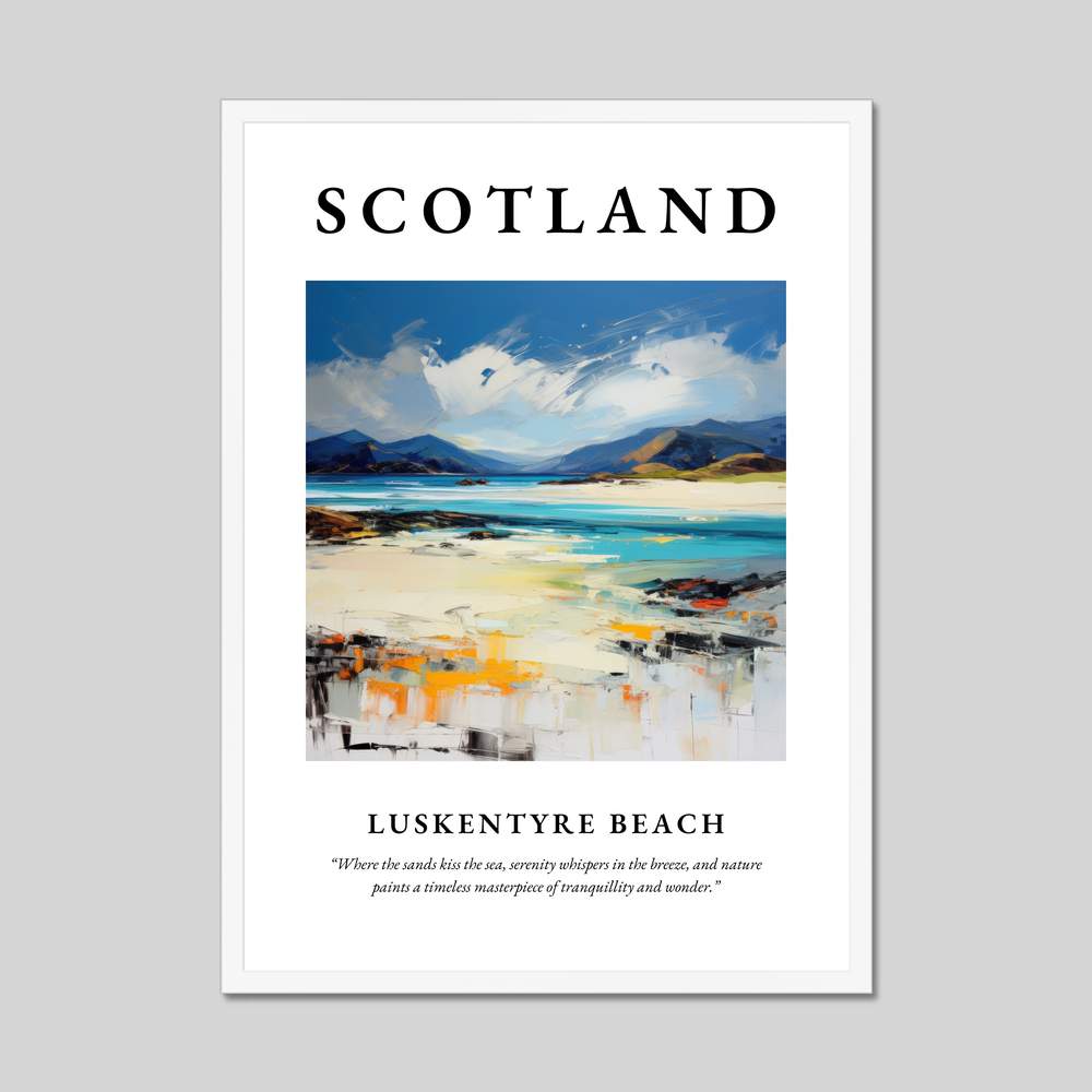 Dominating the top of the layout, the word “SCOTLAND” is emblazoned in big bold lettering, inviting you to embark on a visual journey. Below, an expressive painting of Luskentyre Beach comes to life in an iconic Expressionism style. The vibrant brushstrokes and rich hues capture the essence of this famed beach, with its turquoise waters gliding into golden sands. The painting exudes a sense of movement and emotion, making it a perfect piece for art lovers who appreciate the unique charm of Expressionism.