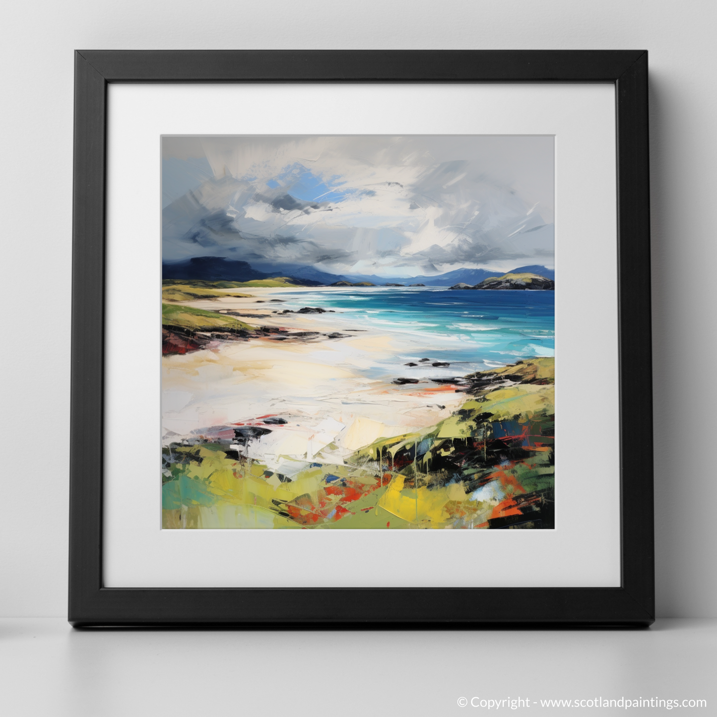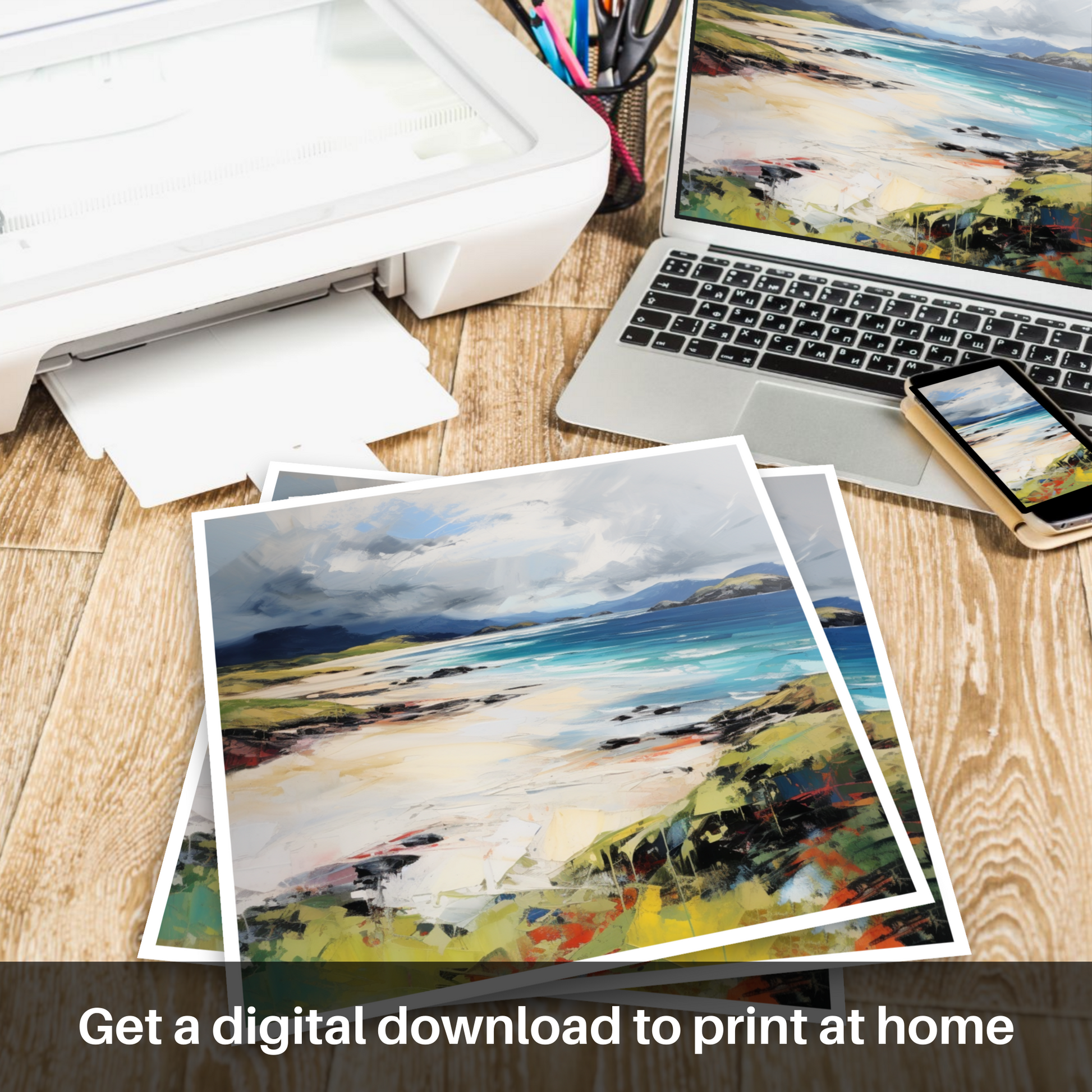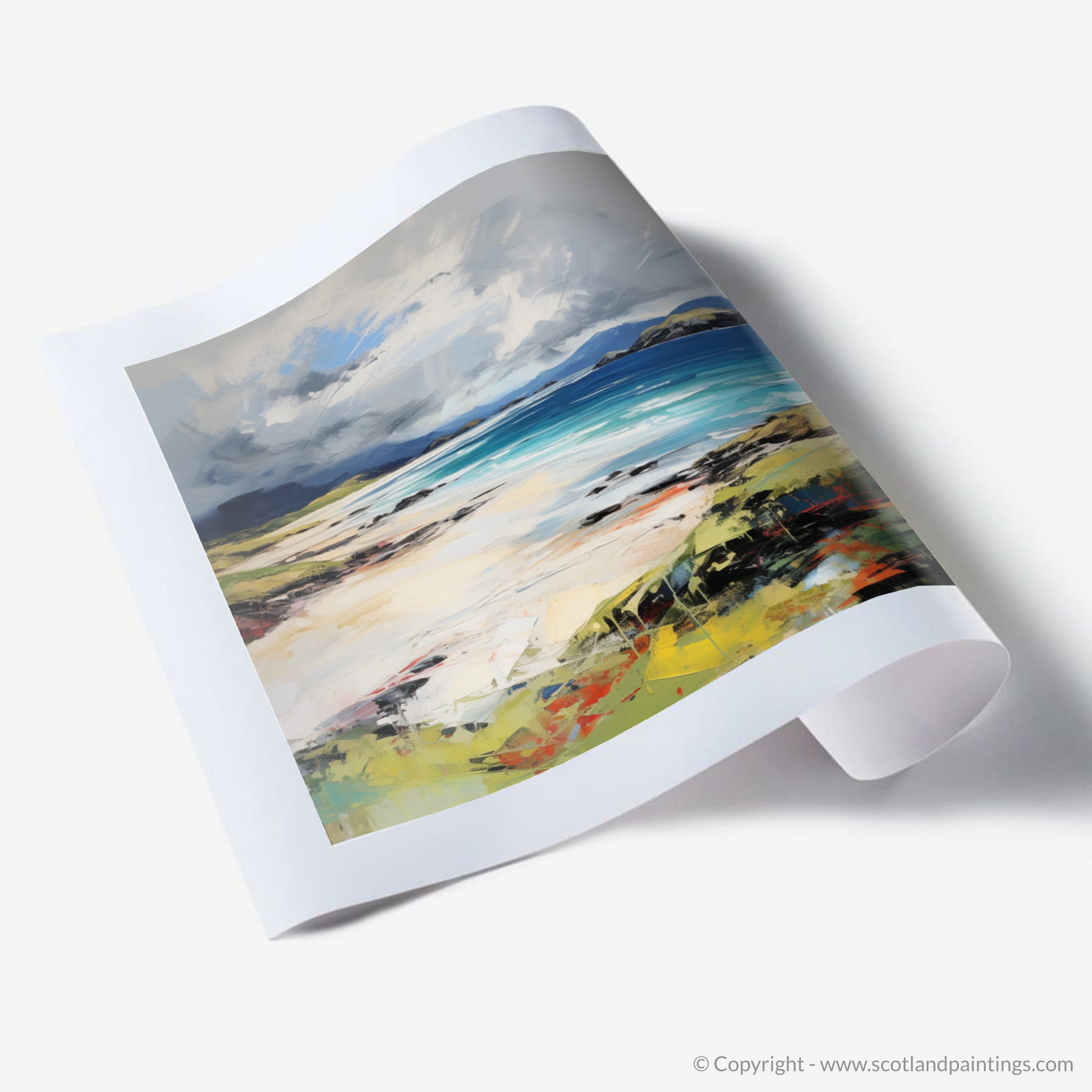 Capture the wild spirit of the Scottish coastline with this evocative print, inspired by the stunning vista of Camusdarach Beach in Arisaig. Rendered in a bold expressionist style, this piece conveys the untamed beauty of this cherished locale through vigorous brushstrokes and a vivid palette.