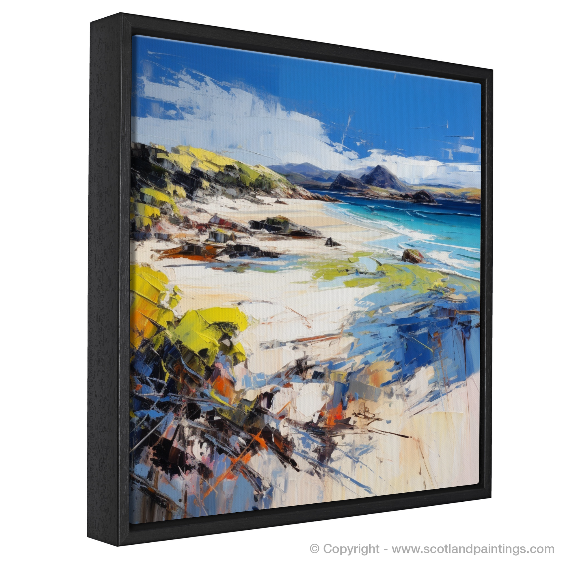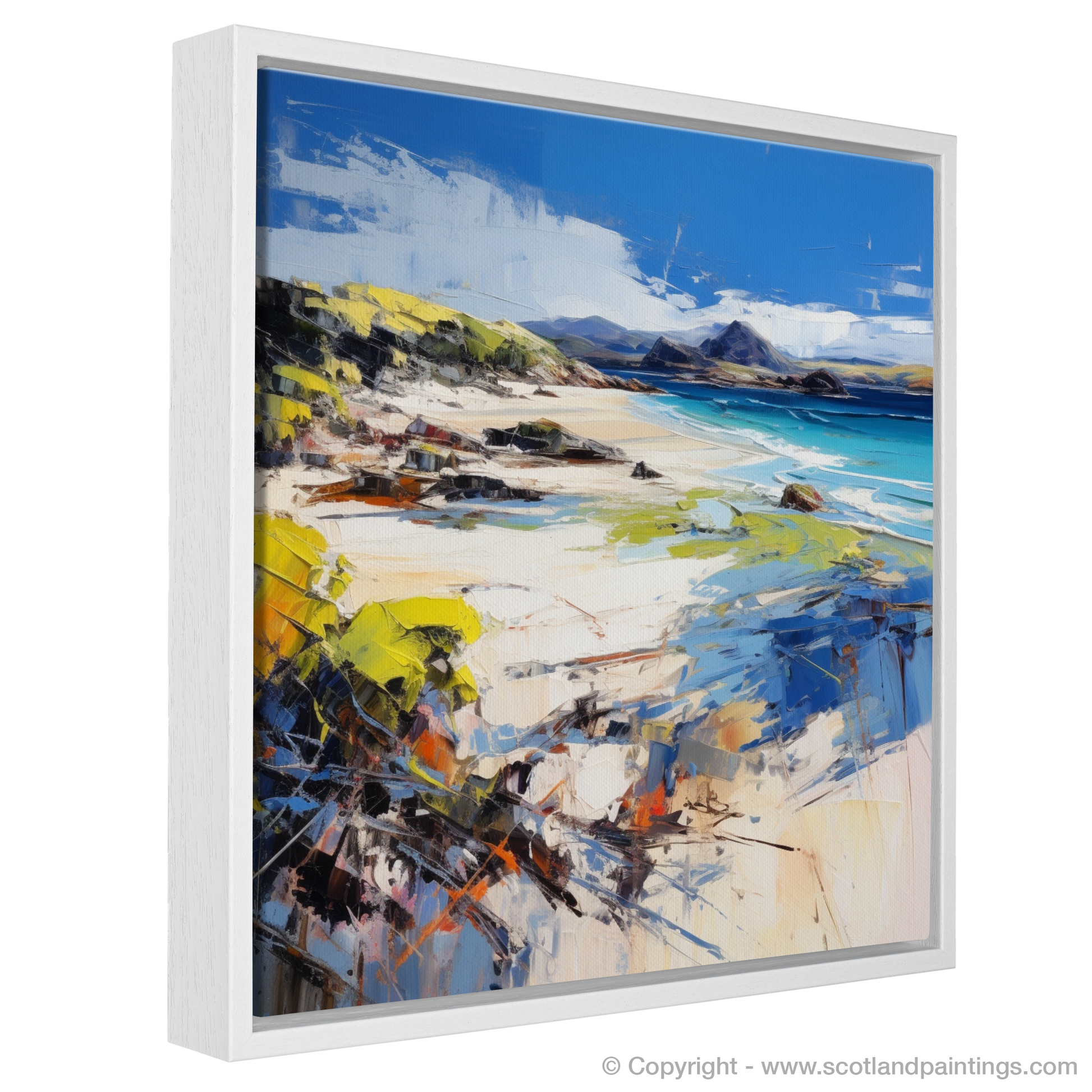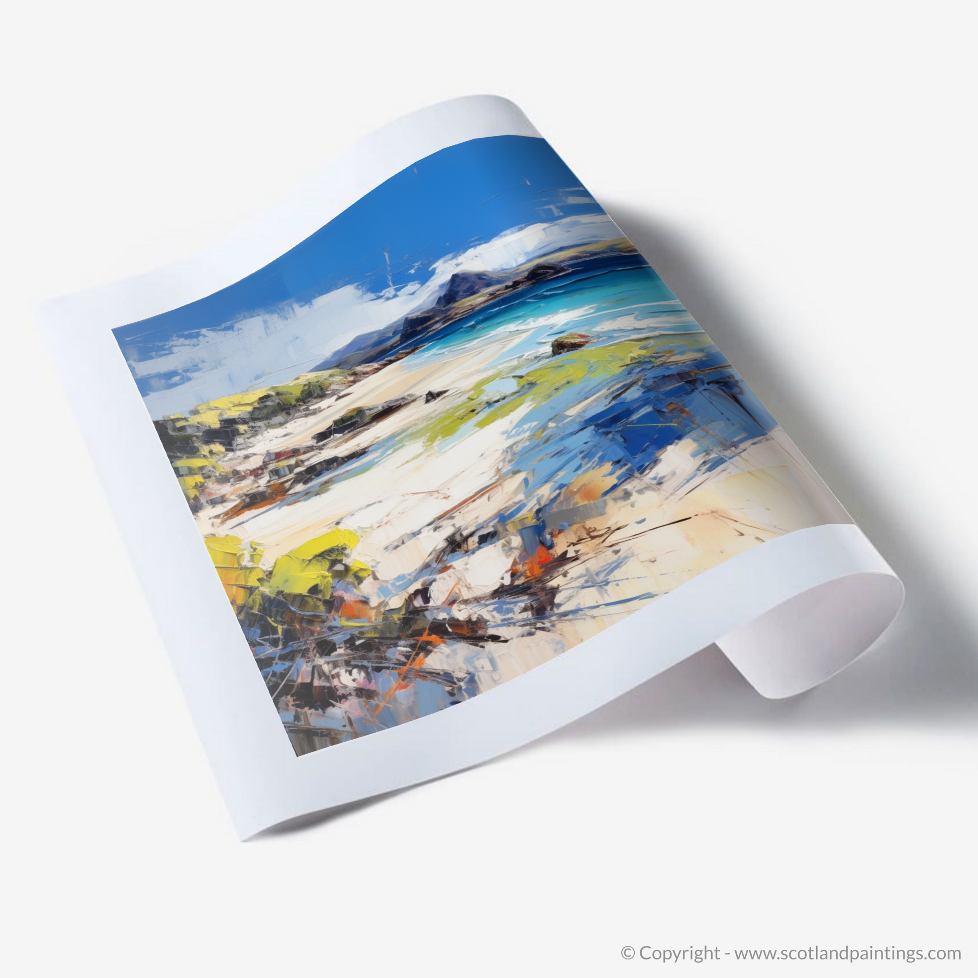 Capturing the wild beauty of Camusdarach Beach, Arisaig, this evocative print transports the viewer to the rugged charm of Scotland's shoreline. Through a masterful use of colour and swift brushstrokes, the piece conveys the windswept serenity of this coastal haven, known for its panoramic vistas and crystal-clear waters.