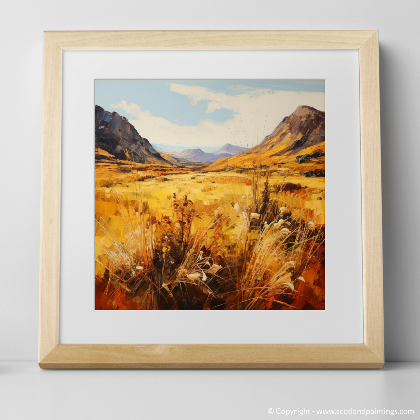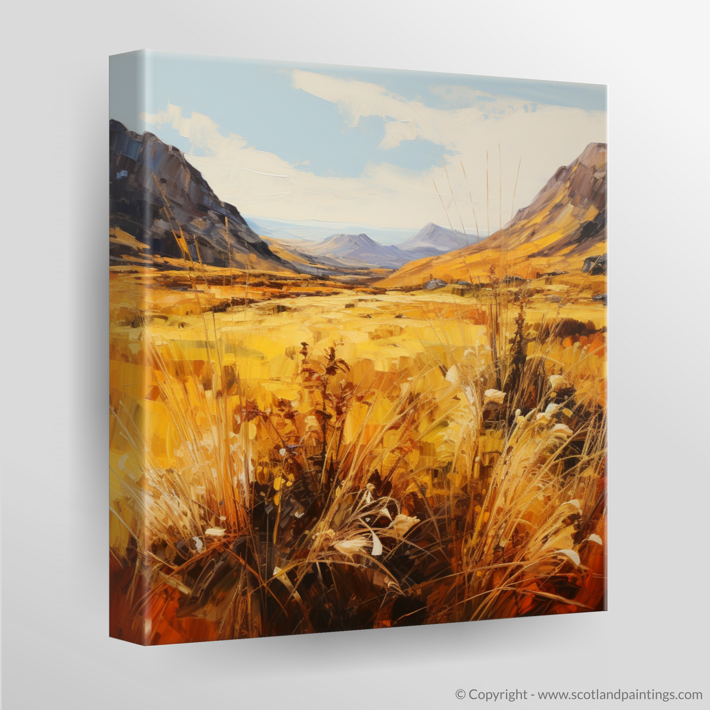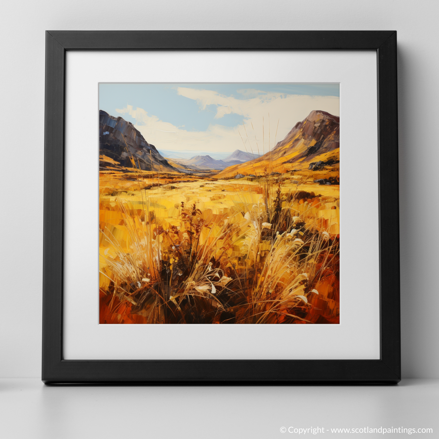 Captured within this evocative piece is the essence of Glencoe's untamed beauty, translated through the fervent strokes of expressionist flair. The artwork beckons the viewer into a landscape ablaze with the golden hues of bracken under a vast sky, sweeping across the canvas with a harmonious blend of warm tones and dynamic contrasts.