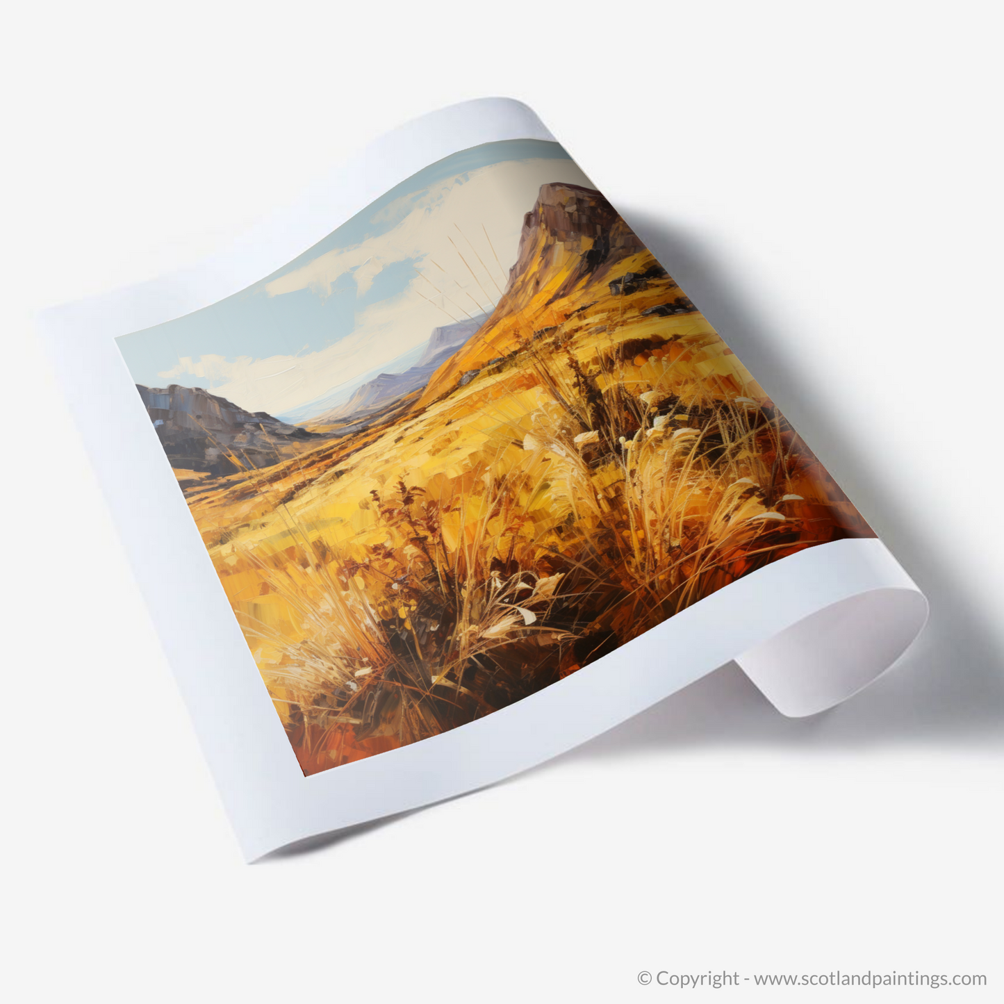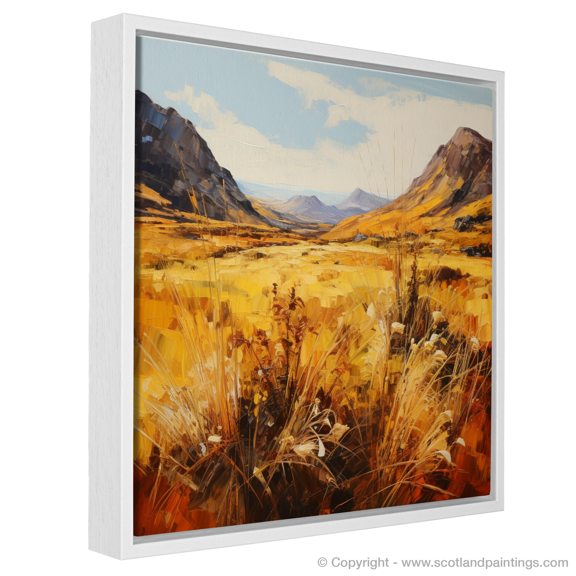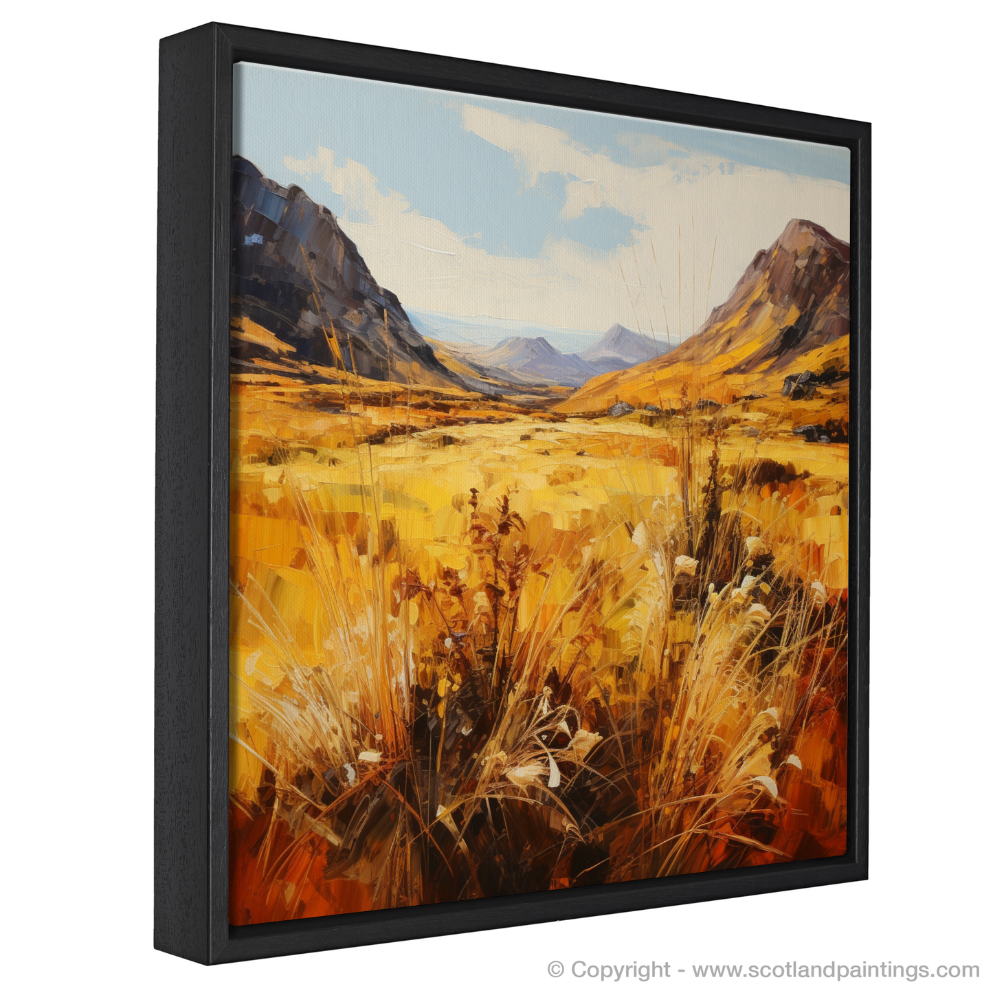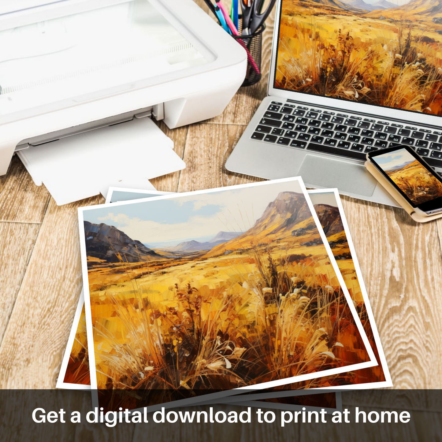 Captured within this evocative piece is the essence of Glencoe's untamed beauty, translated through the fervent strokes of expressionist flair. The artwork beckons the viewer into a landscape ablaze with the golden hues of bracken under a vast sky, sweeping across the canvas with a harmonious blend of warm tones and dynamic contrasts.