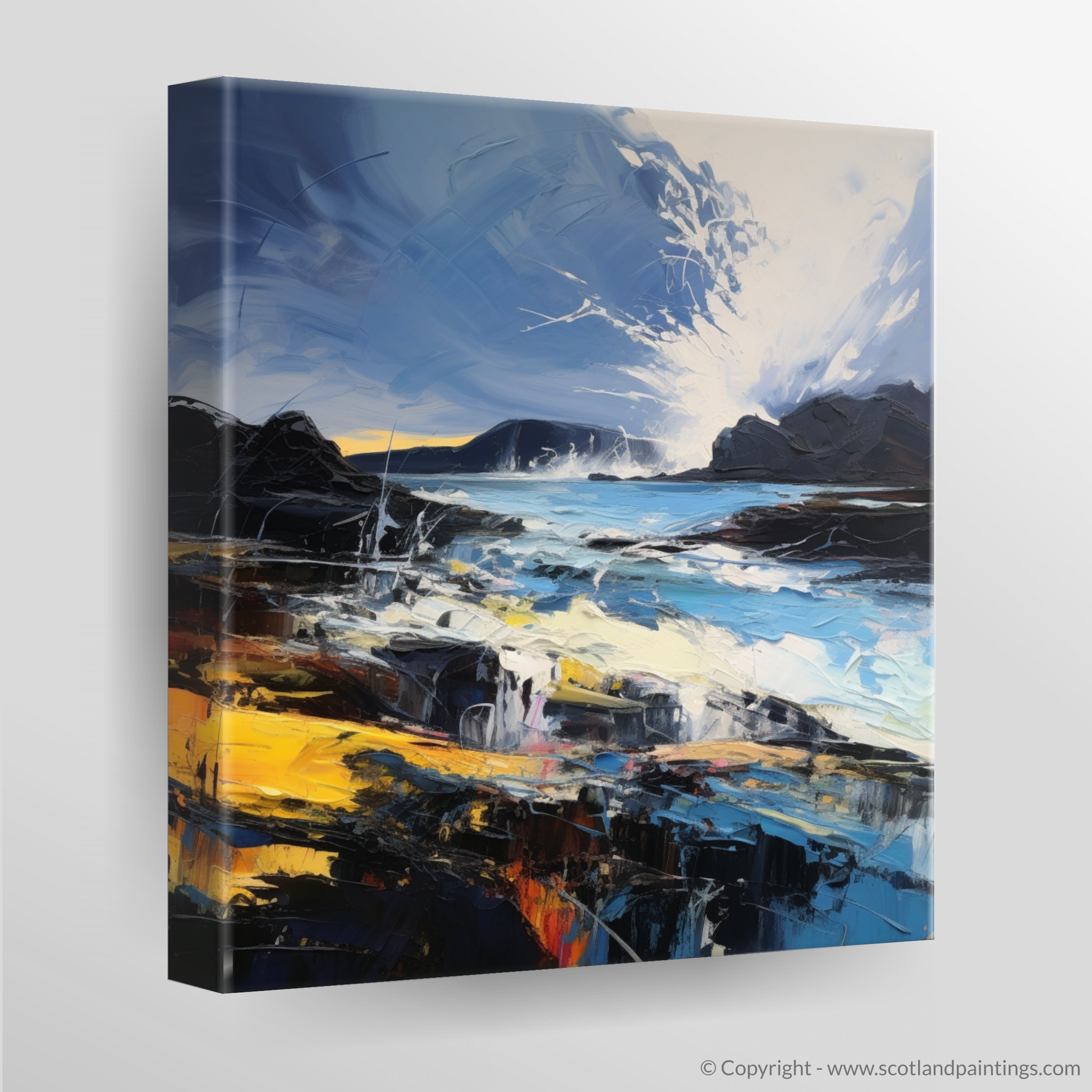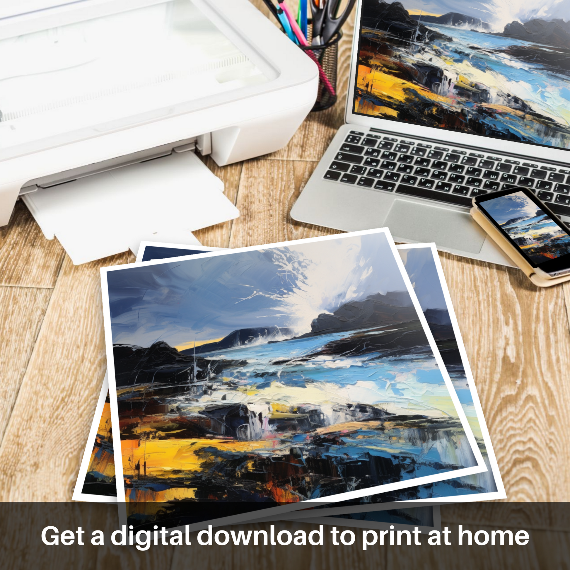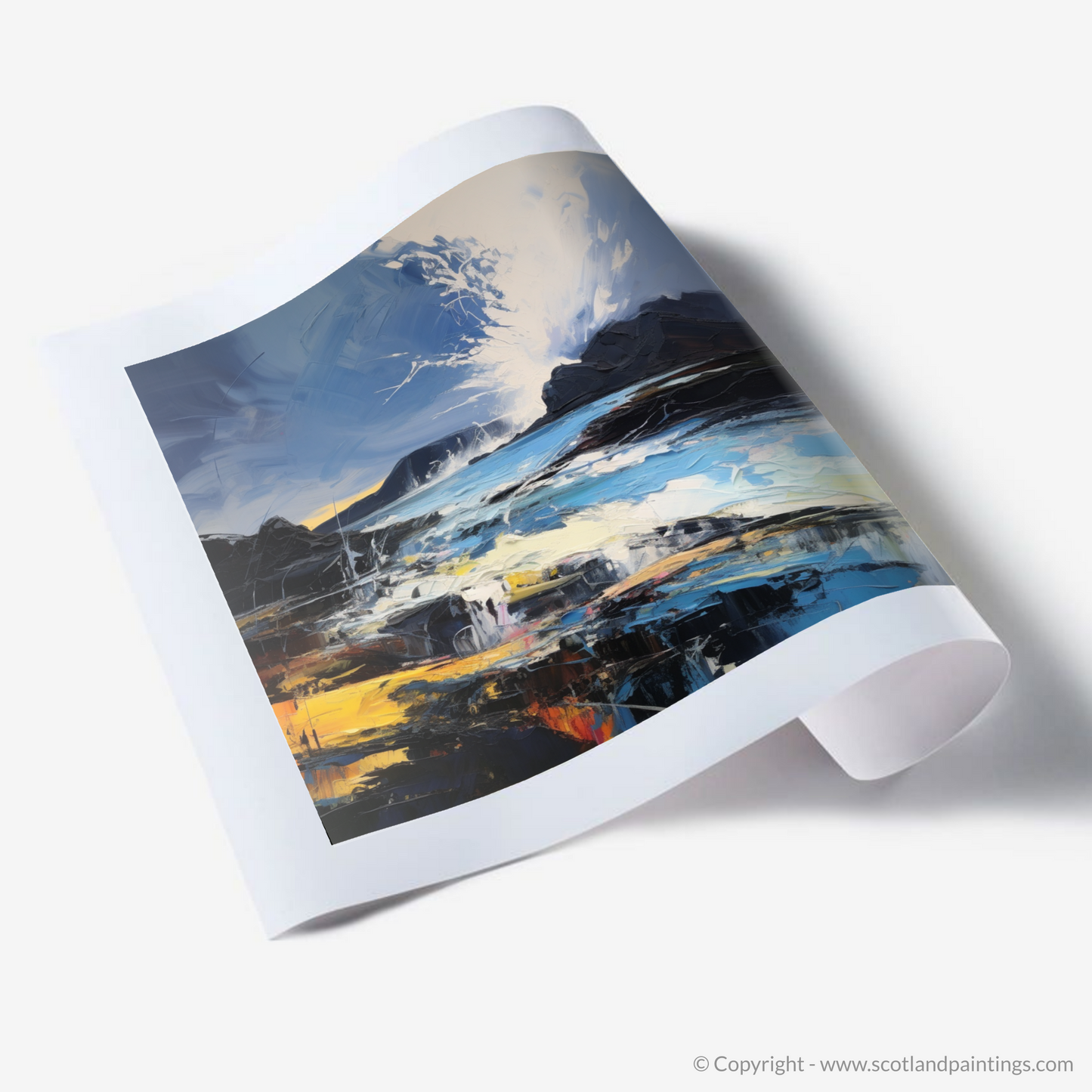 Exuding the turbulent beauty of Scotland's coastal landscapes, this captivating print is a homage to the wild, arresting scenery of Ardalanish Bay. Boasting a tempestuous sky, the artwork is a symphony of deep, brooding blues and stark whites that swirl together, depicting the storm's formidable energy. Below, the sea reflects this dramatic dance with strokes of lighter blue, interrupted by the white foam of cresting waves—a testament to the bay's untamed nature.