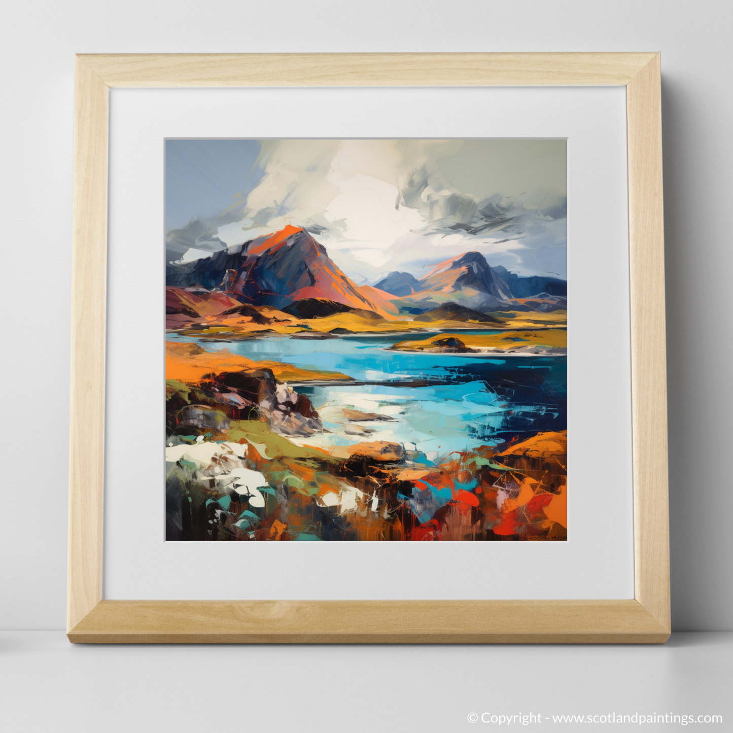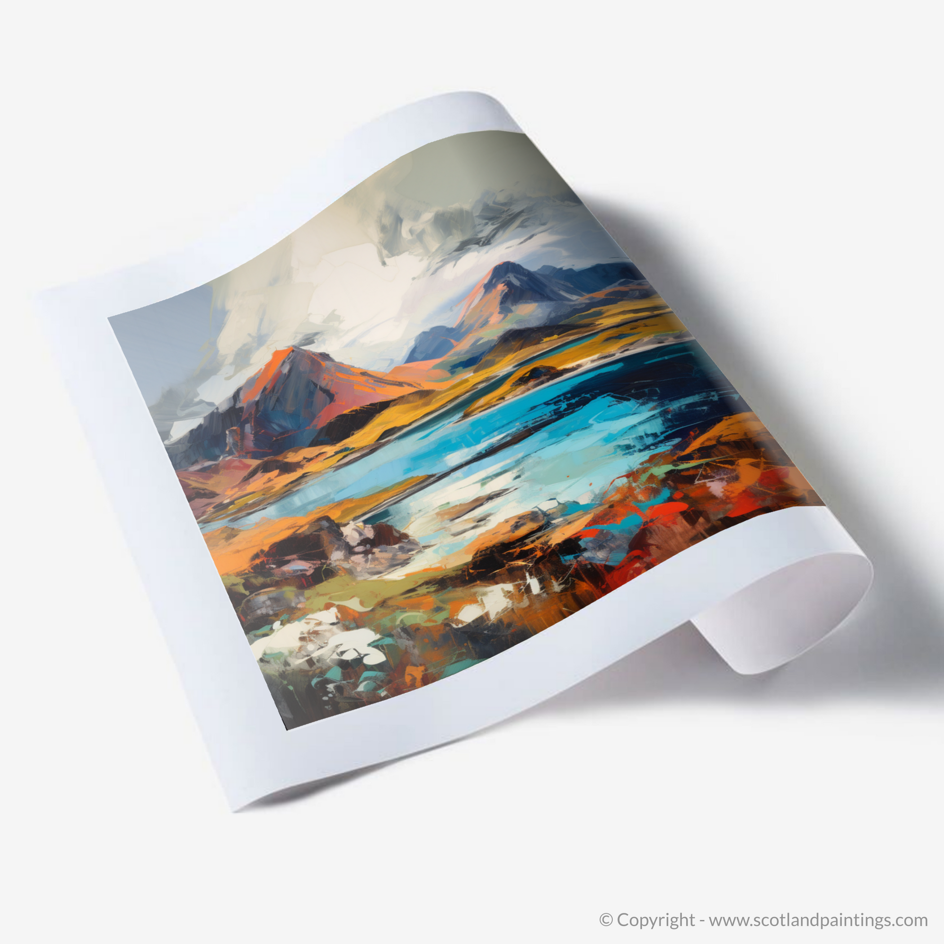 This exquisite print captures the raw beauty and rugged landscapes of the Isle of Rum, part of Scotland's breathtaking Inner Hebrides. Drawing upon the evocative power of Expressionism, the artwork invites the viewer into a world where emotion and mood preside over realistic depiction. Swaths of vibrant colours sweep across the canvas, rendering the island's natural features with bold, sweeping brushstrokes that convey movement and energy.
