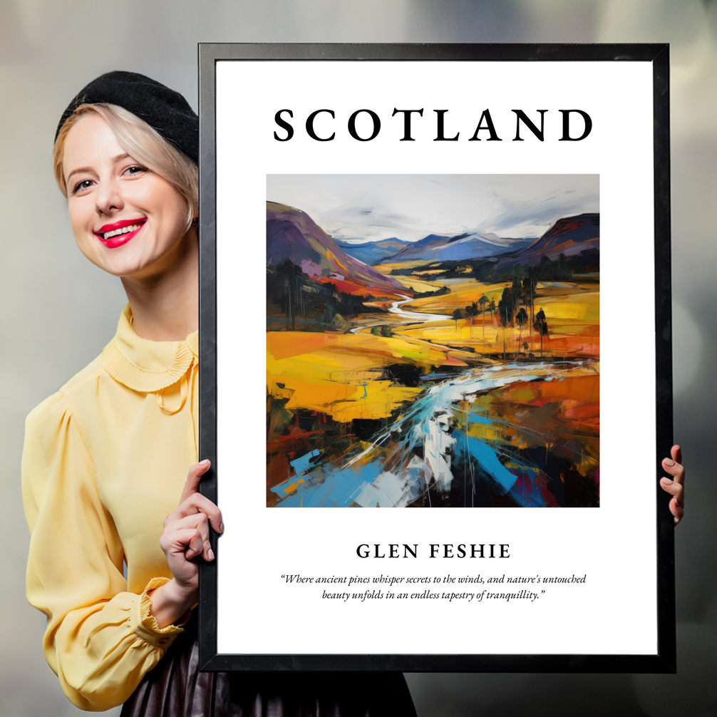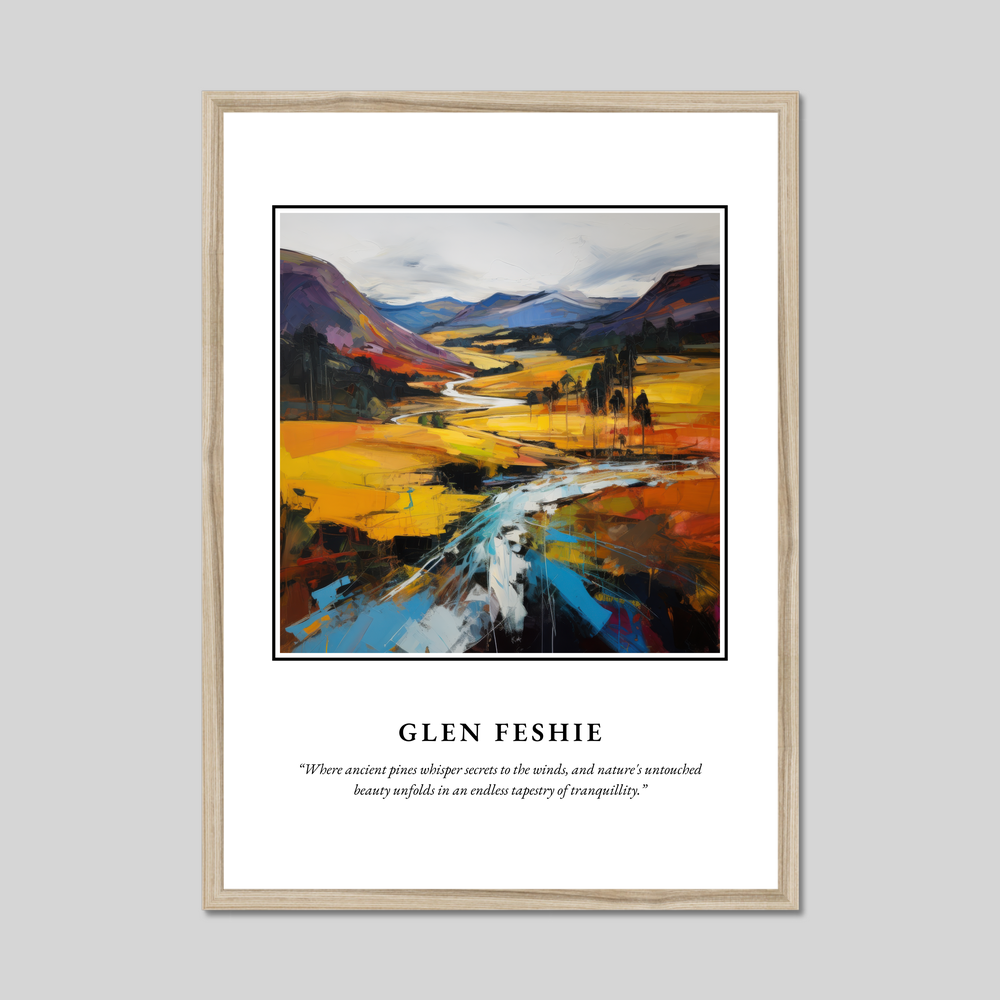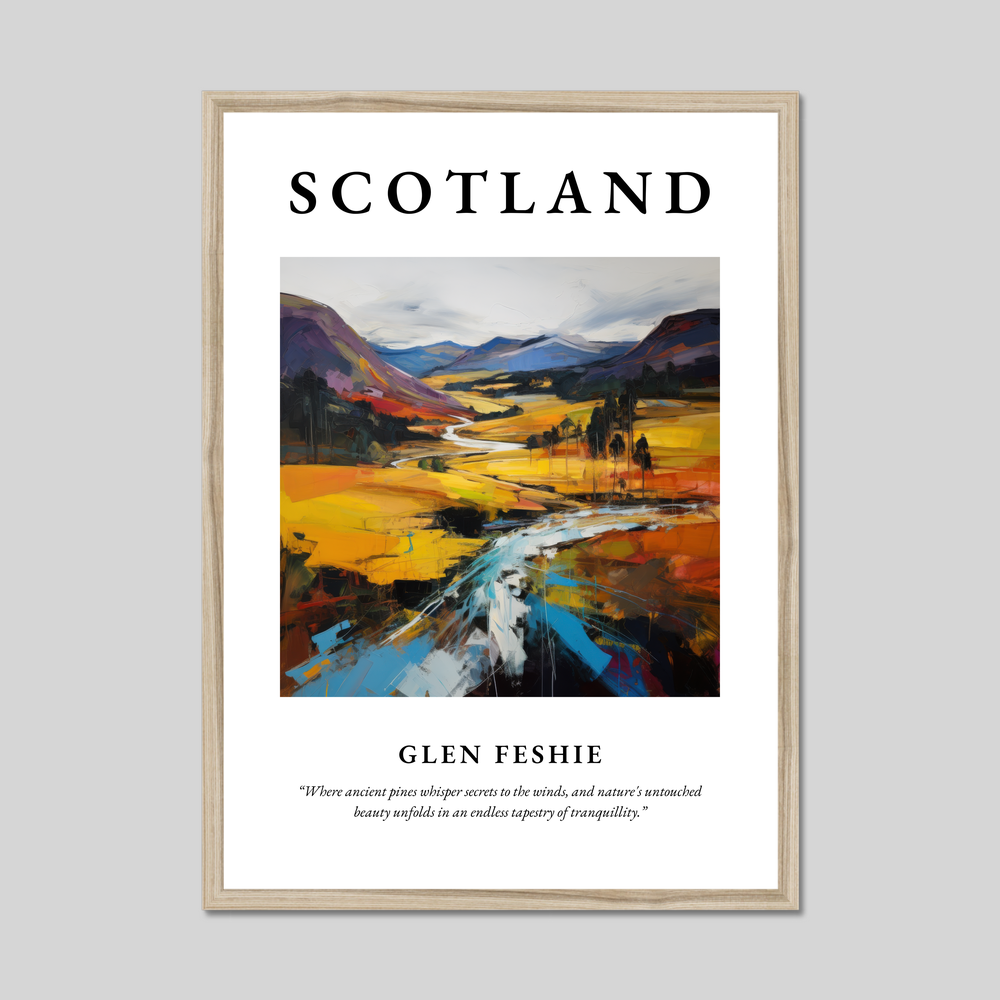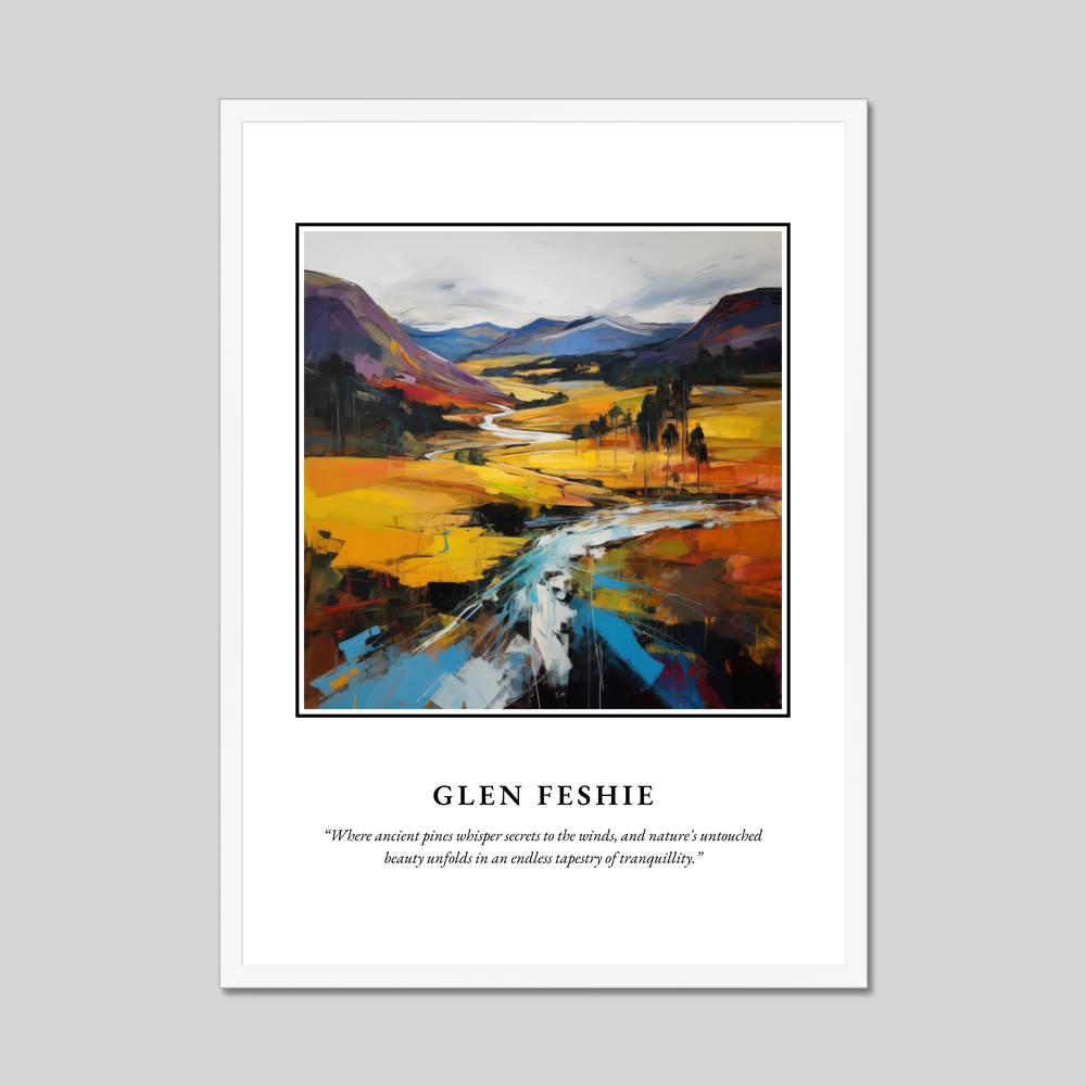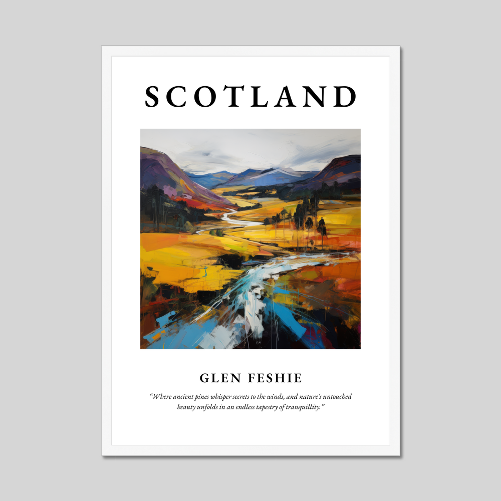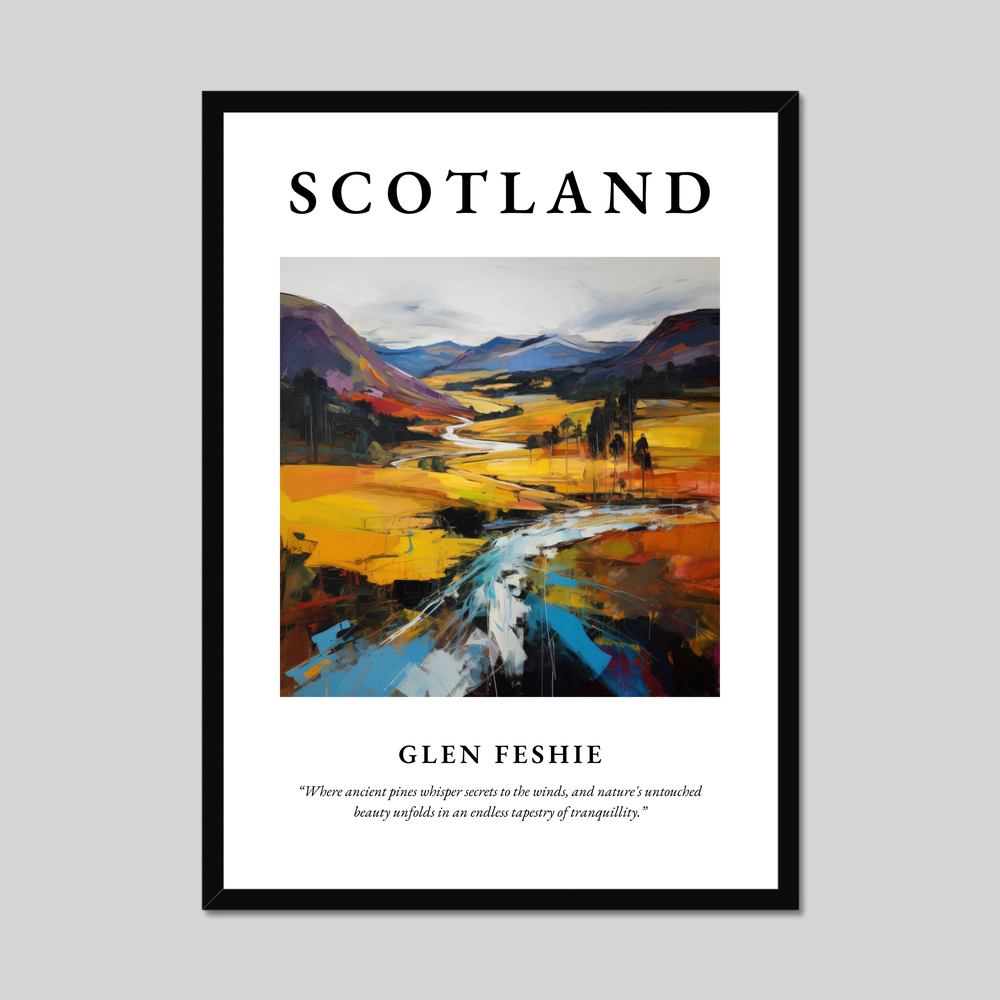 Historically, Glen Feshie has been a place of inspiration and solitude. It remains a pristine example of Scotland's rugged beauty, featuring ancient forests, meandering rivers, and towering peaks. This framed poster serves as a reminder of the glen’s mystical allure, a perfect piece for those who yearn to bring a bit of Scotland’s wild charm into their home.