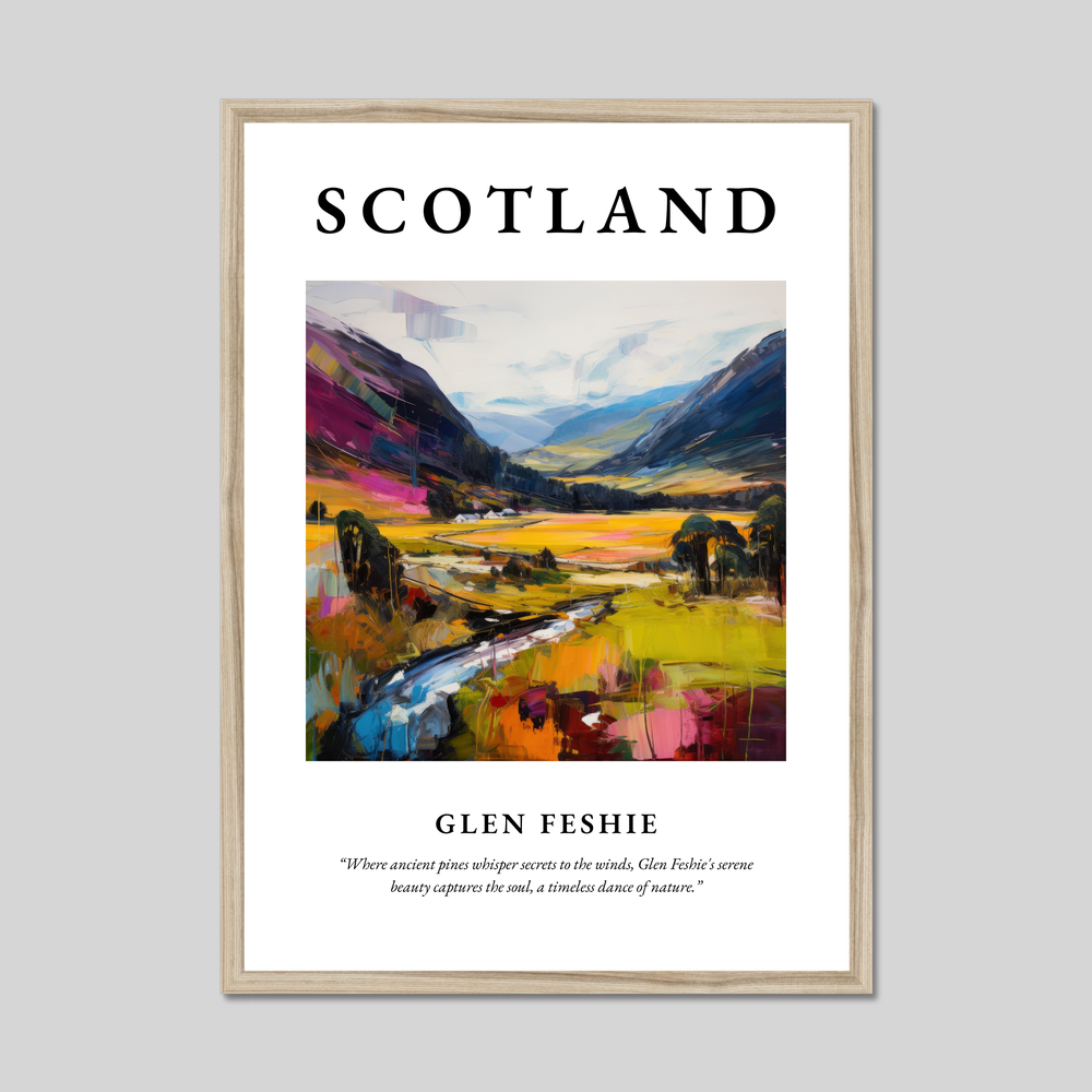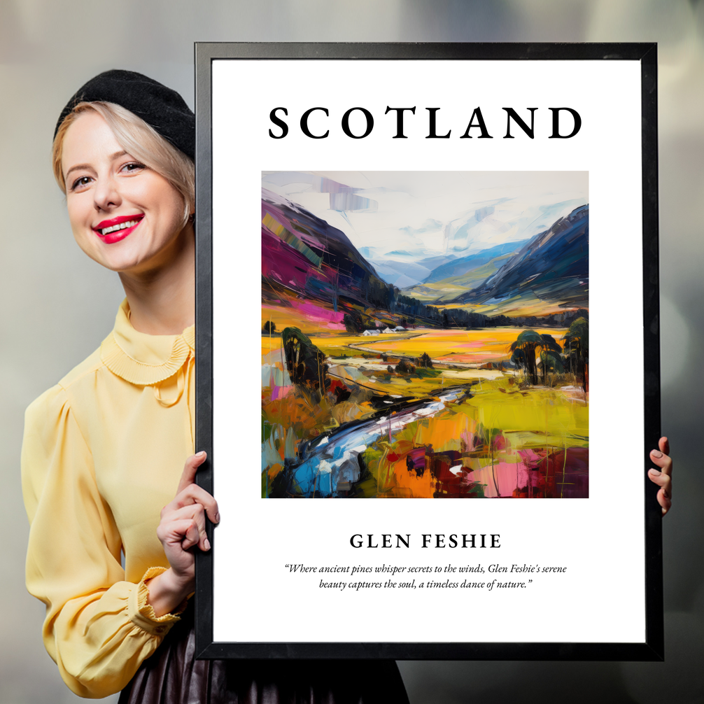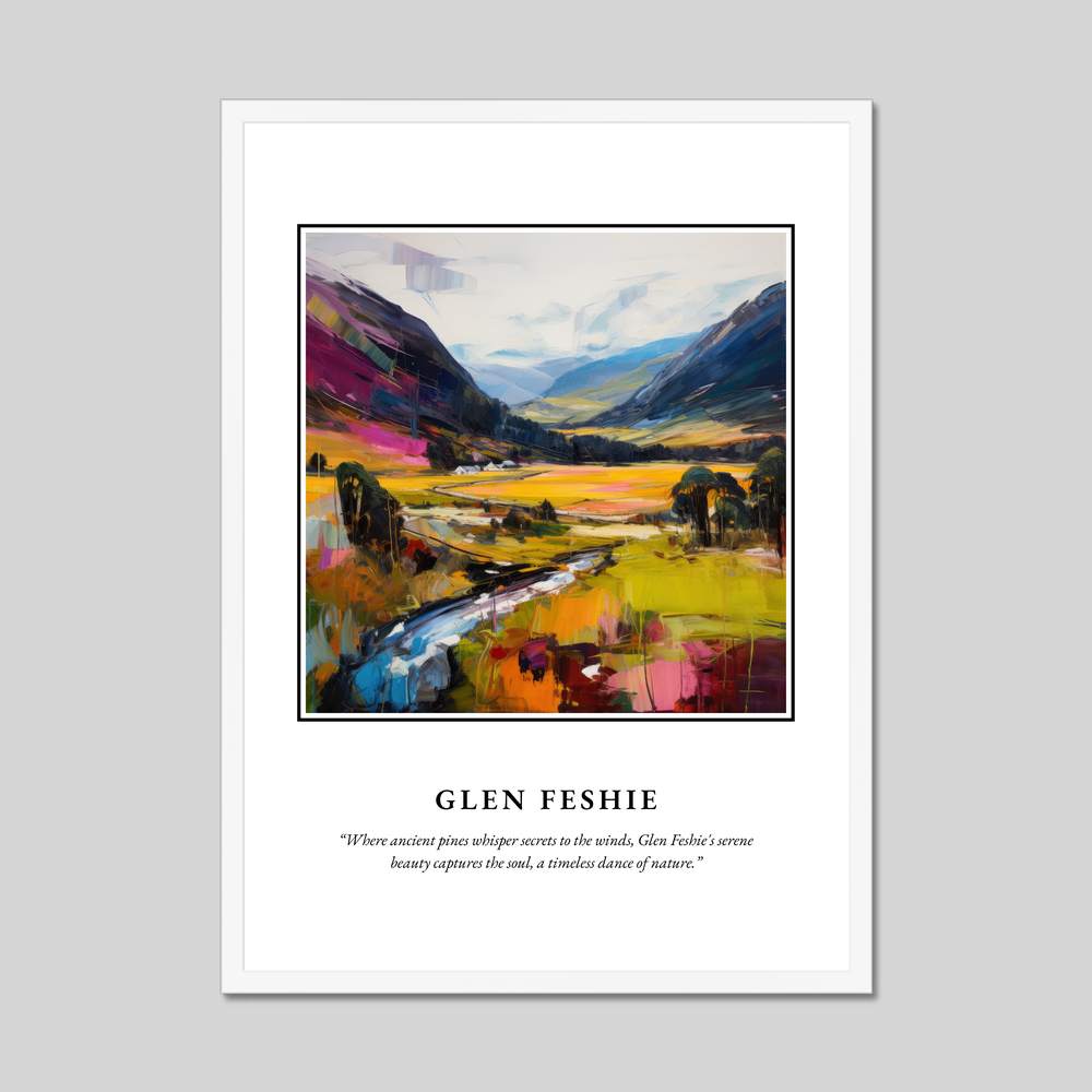 Immerse yourself in the breathtaking landscape of Glen Feshie with our captivating framed poster print from the "Scottish Glens" collection. Measuring a generous 50cm x 70cm, this piece commands attention, transforming any space into a gateway to Scotland's natural beauty without breaking the bank. The bold "SCOTLAND" at the top sets the scene, while the exquisite artwork beneath—a vibrant expressionist painting—brings to life the awe-inspiring hues and textures of Glen Feshie.