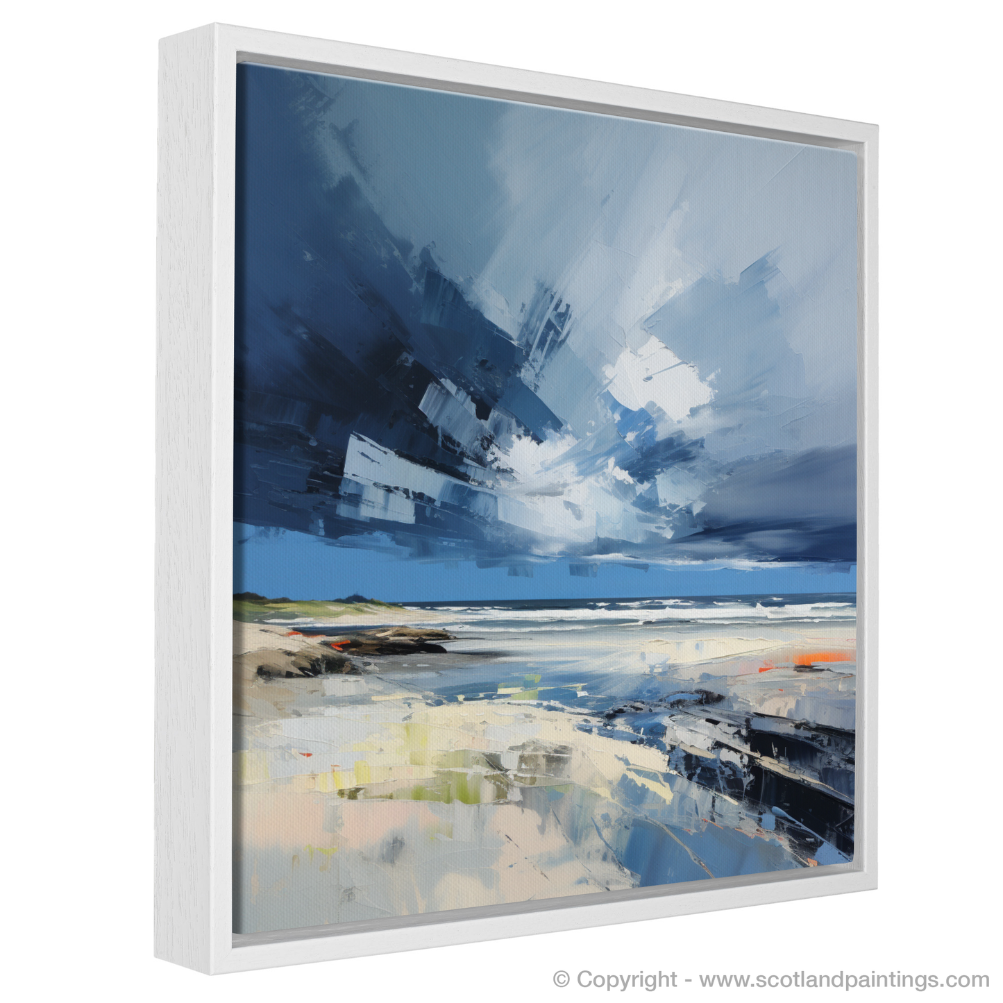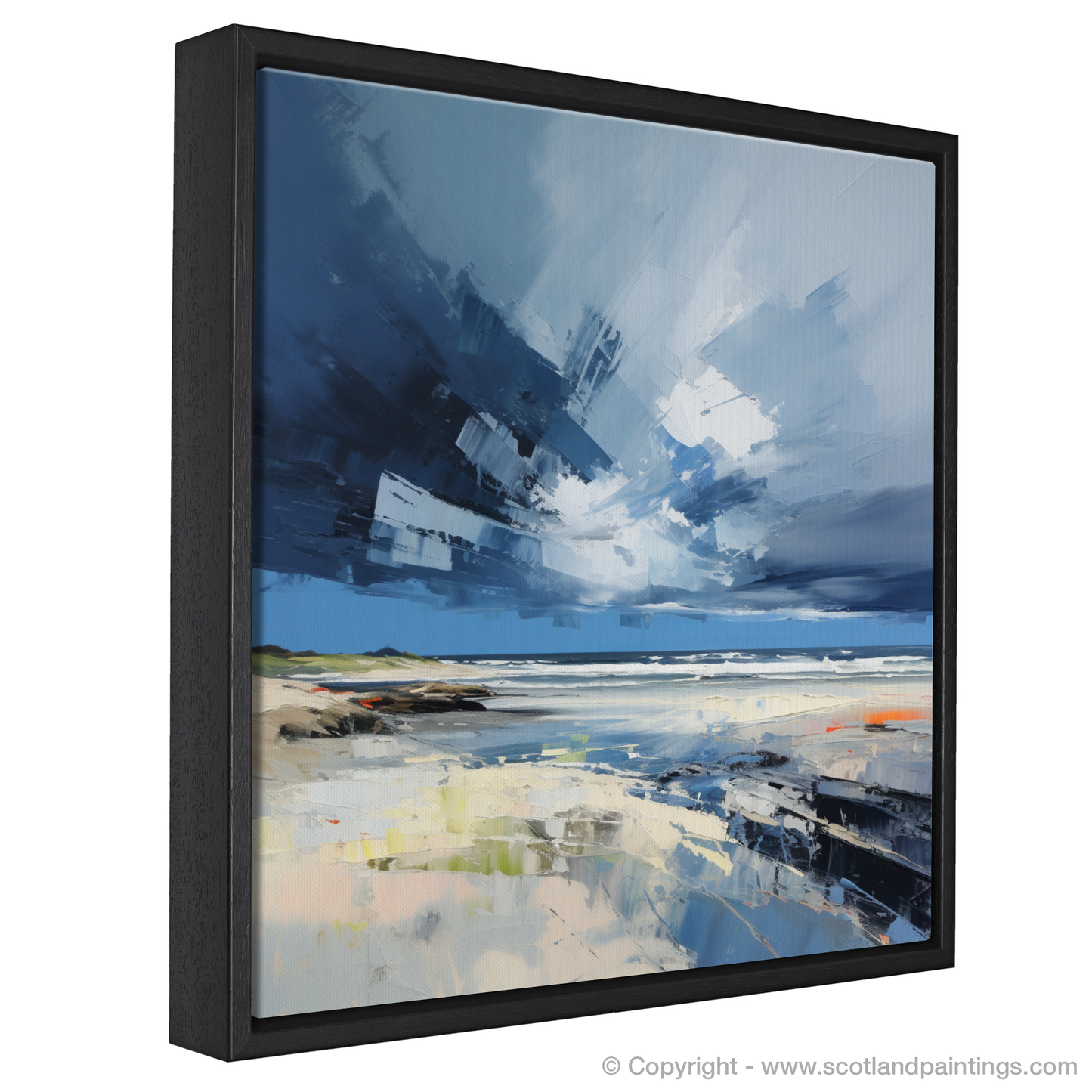 This expressive print captures the tumultuous beauty of St Cyrus Beach, rendered with the raw emotional power of the Expressionist style. The dynamic brushstrokes in varying shades of blues and greys create a brooding and dramatic stormy sky that dominates the scene, drawing the viewer into the atmospheric turbulence above the serene Scottish coastline. The interplay of light and dark hues expertly conveys the moment before a storm, where nature's unpredictability is both thrilling and beautifully ominous.