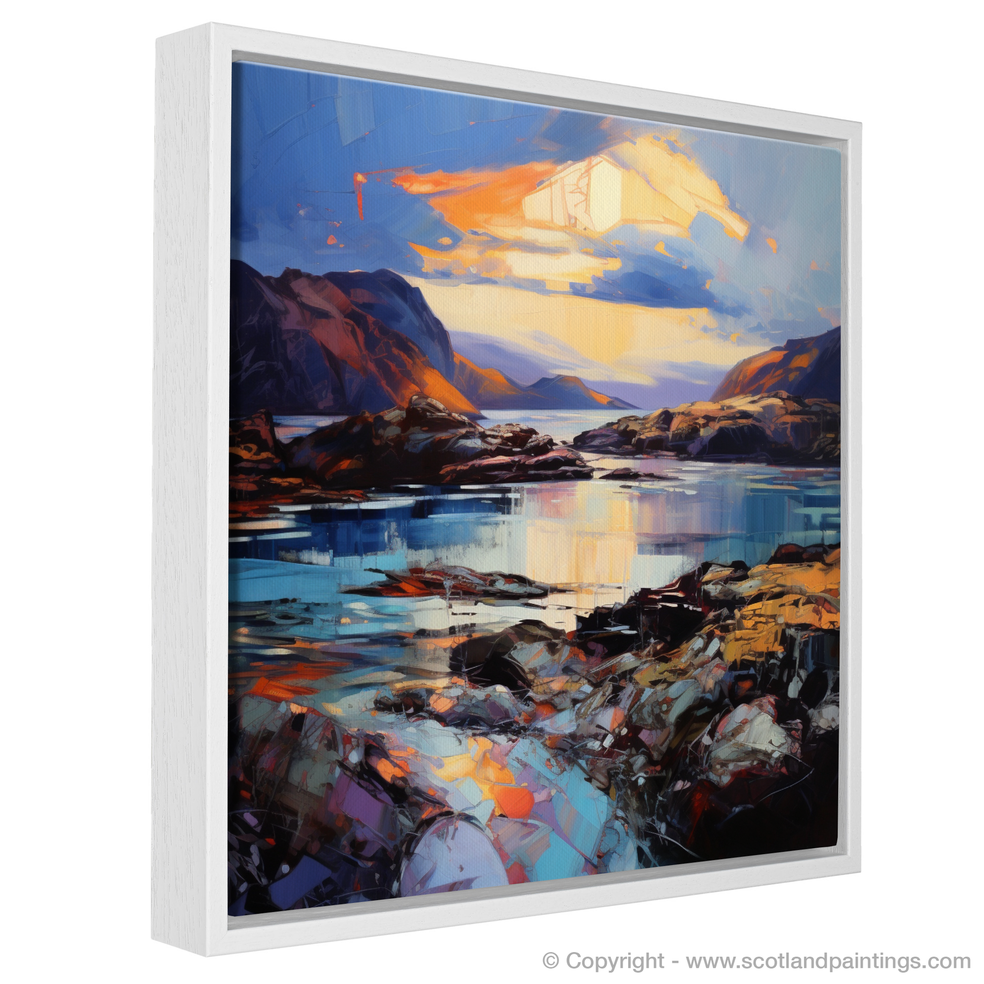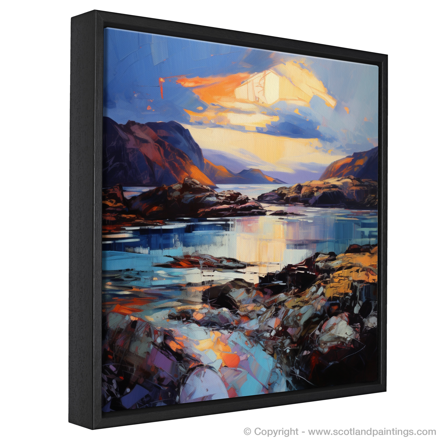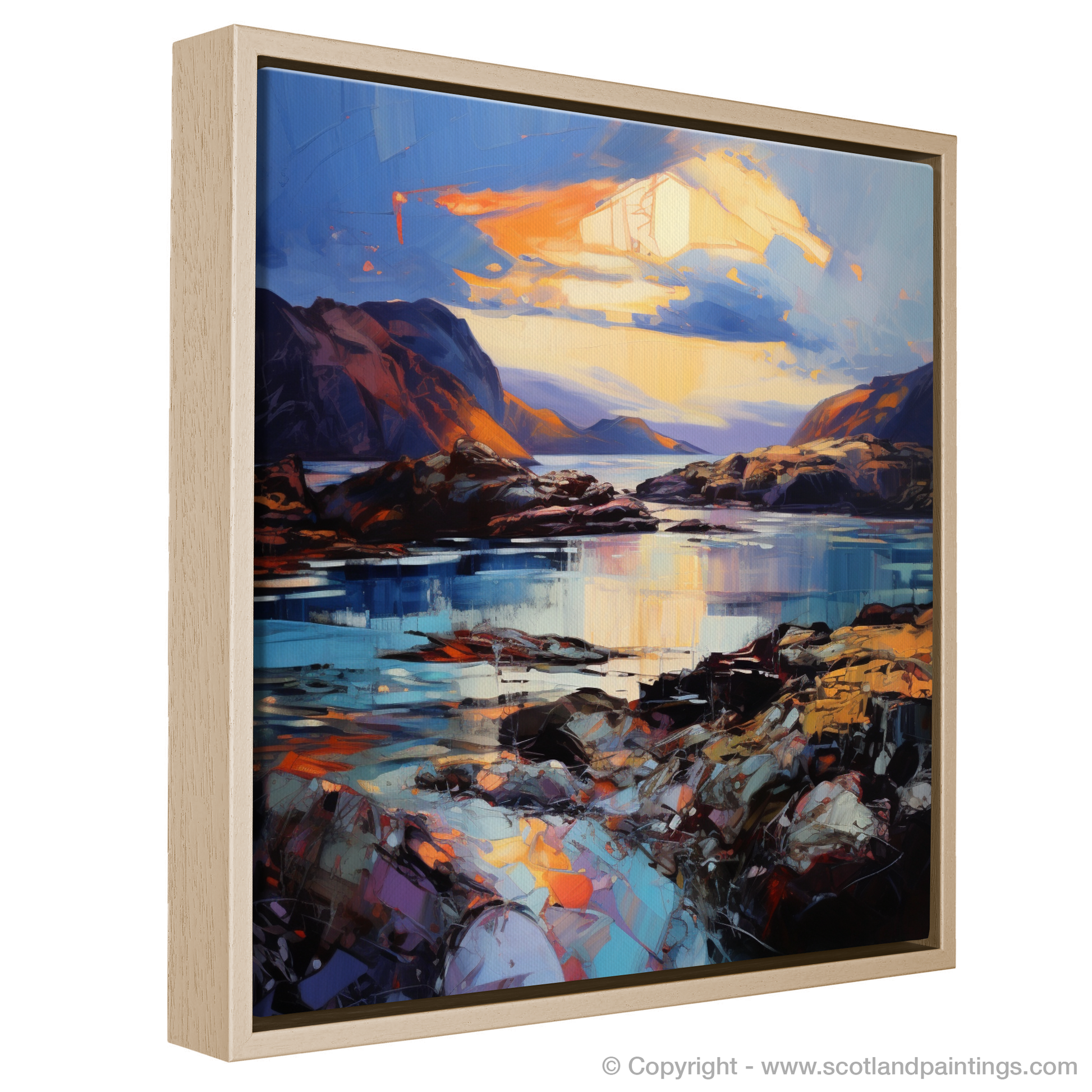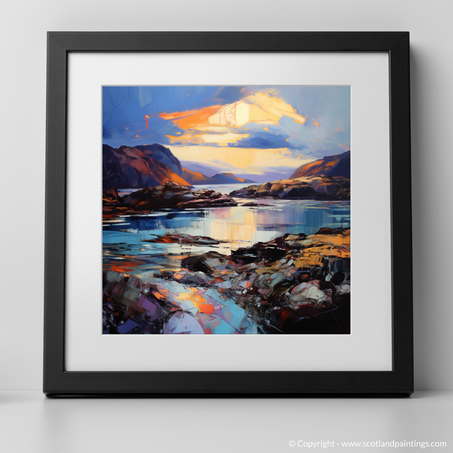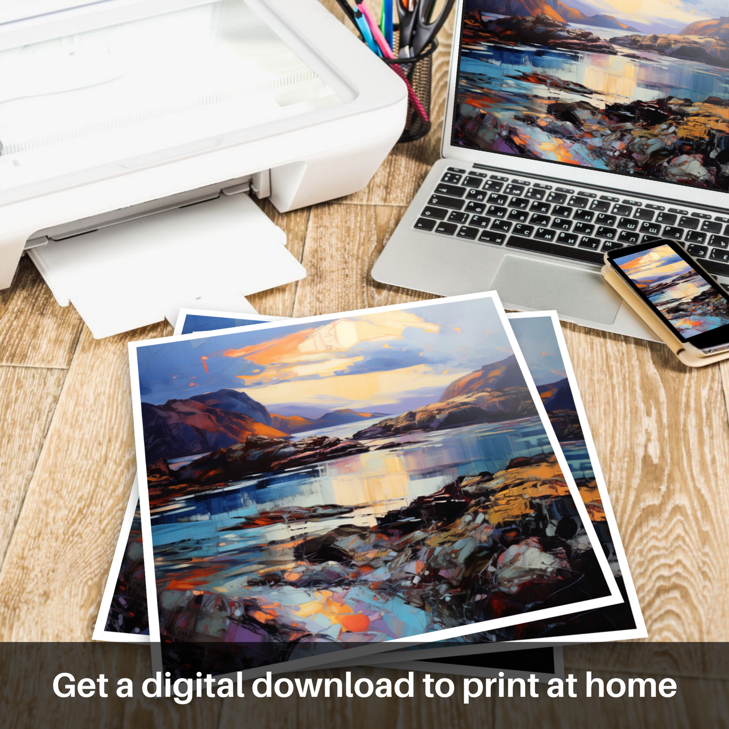 This print is a testament to nature's splendour, offering a glimpse into a timeless Scottish landscape that is both familiar and dreamlike. It is a celebration of the untamed beauty of Scotland's coastal enclaves, a reminder of the wild and wonderful interplay between land, sea, and sky at the day's end.