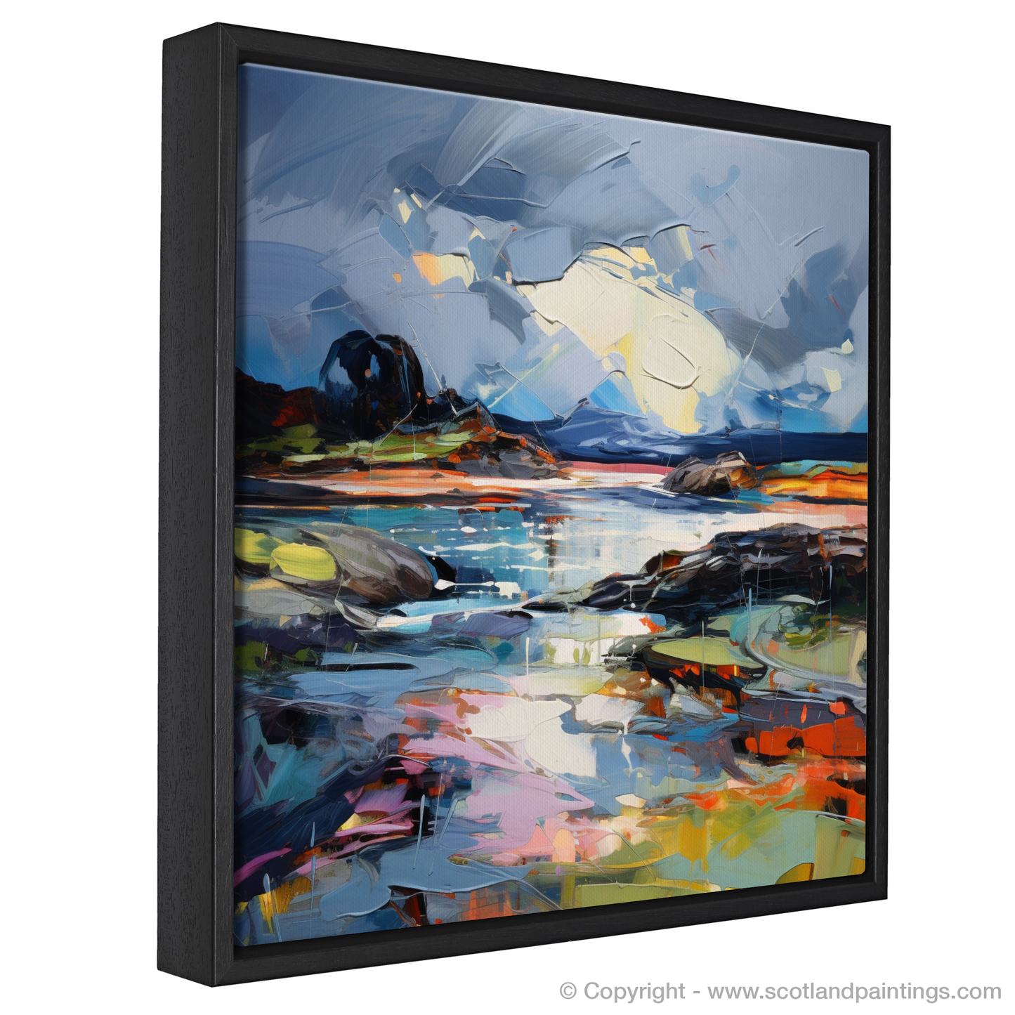 Below, the turbulent sea mirrors the sky's palette, with strokes of cobalt, indigo and pale blues colliding and blending, creating a reflection of the turmoil above. The land is tinged with vibrant hues of orange, red, and yellow, hinting at the untamed and raw Scottish landscape that inspired this piece. Black and deep brown formations of rock anchor the composition, their solidity providing a stark contrast to the fluidity of the surrounding elements.