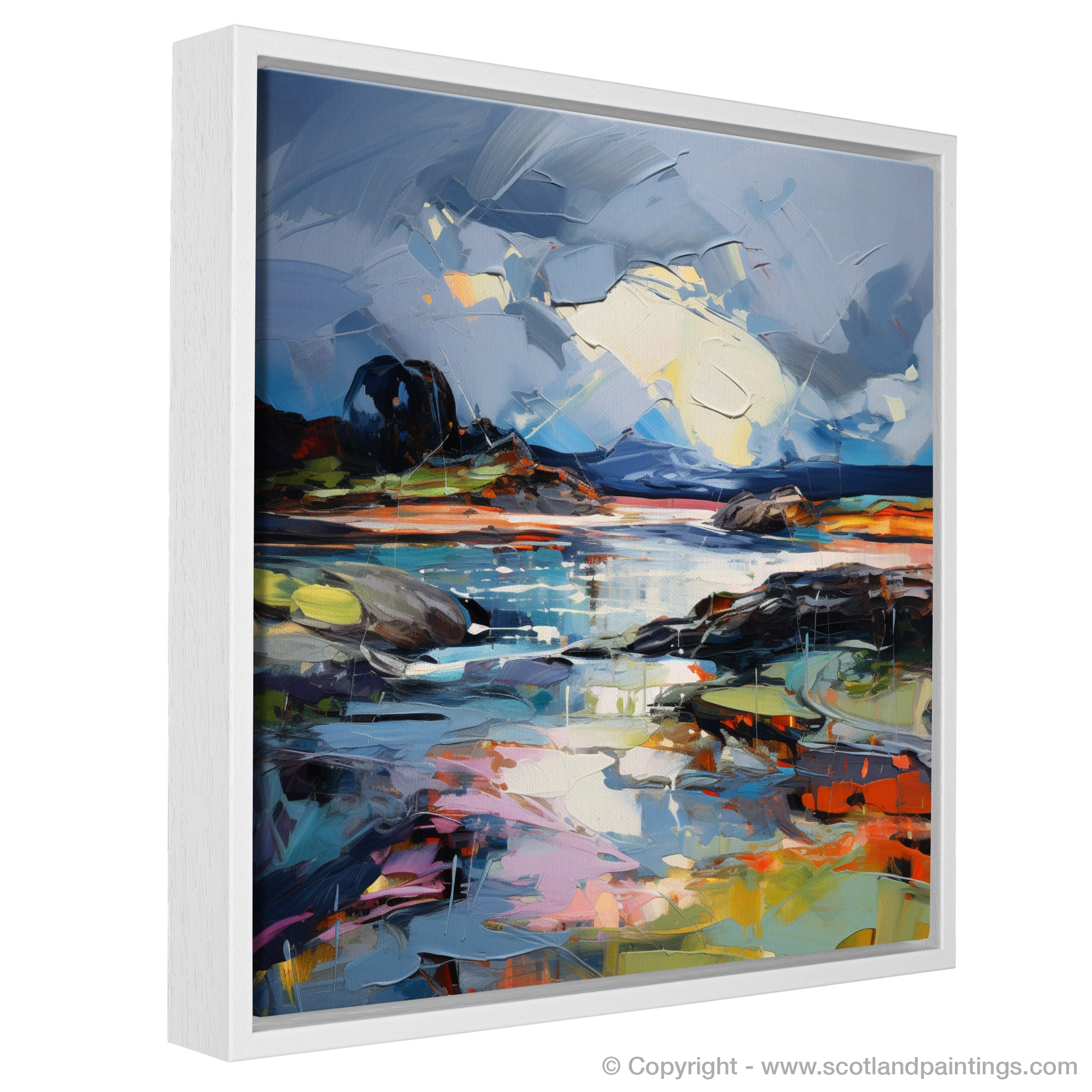 This captivating print depicts the raw beauty of Ardtun Bay under a tumultuous stormy sky, captured through the vivid and emotive brushwork characteristic of Expressionism. Swirling clouds in a dance of blues, greys, and pockets of bright white convey the movement of the tempest above, while the contrasts between light and shadow instil a sense of drama and immediacy.