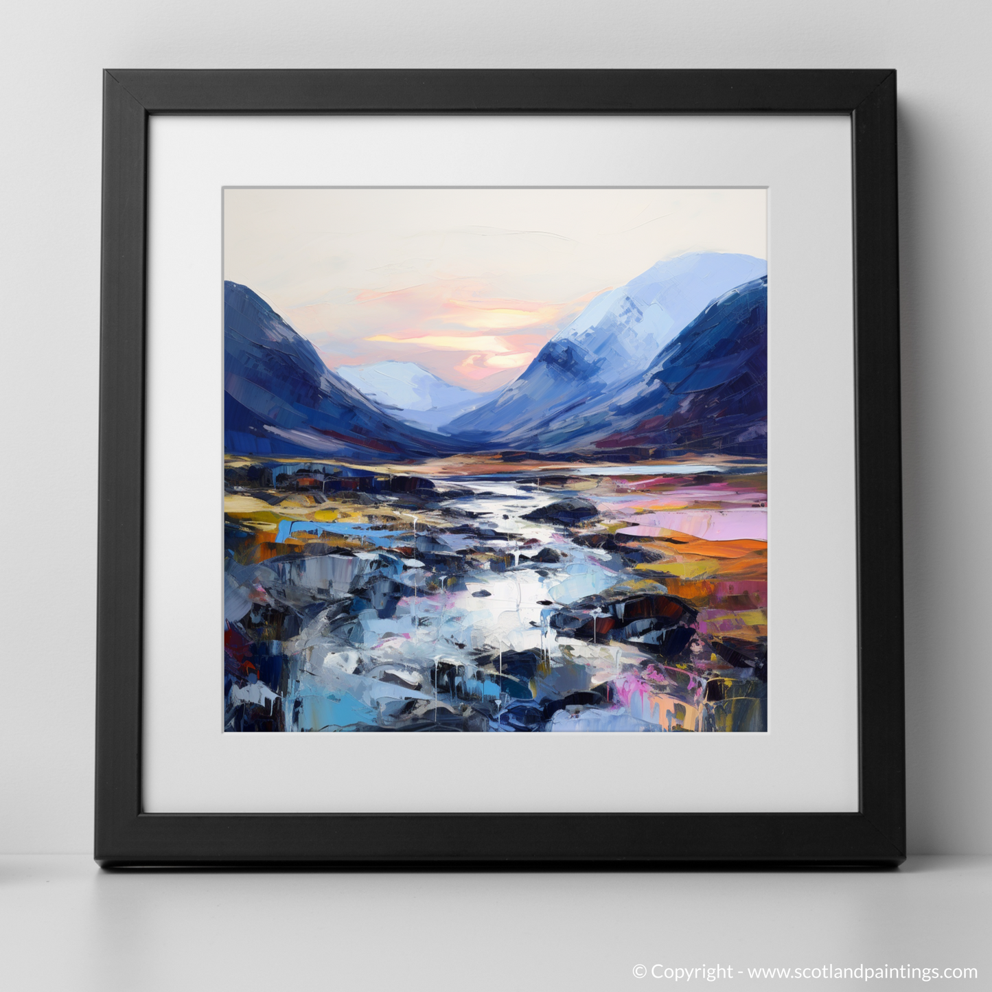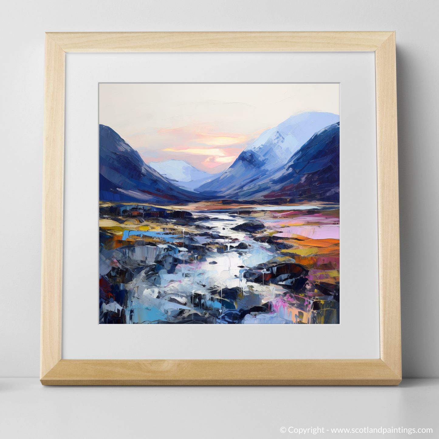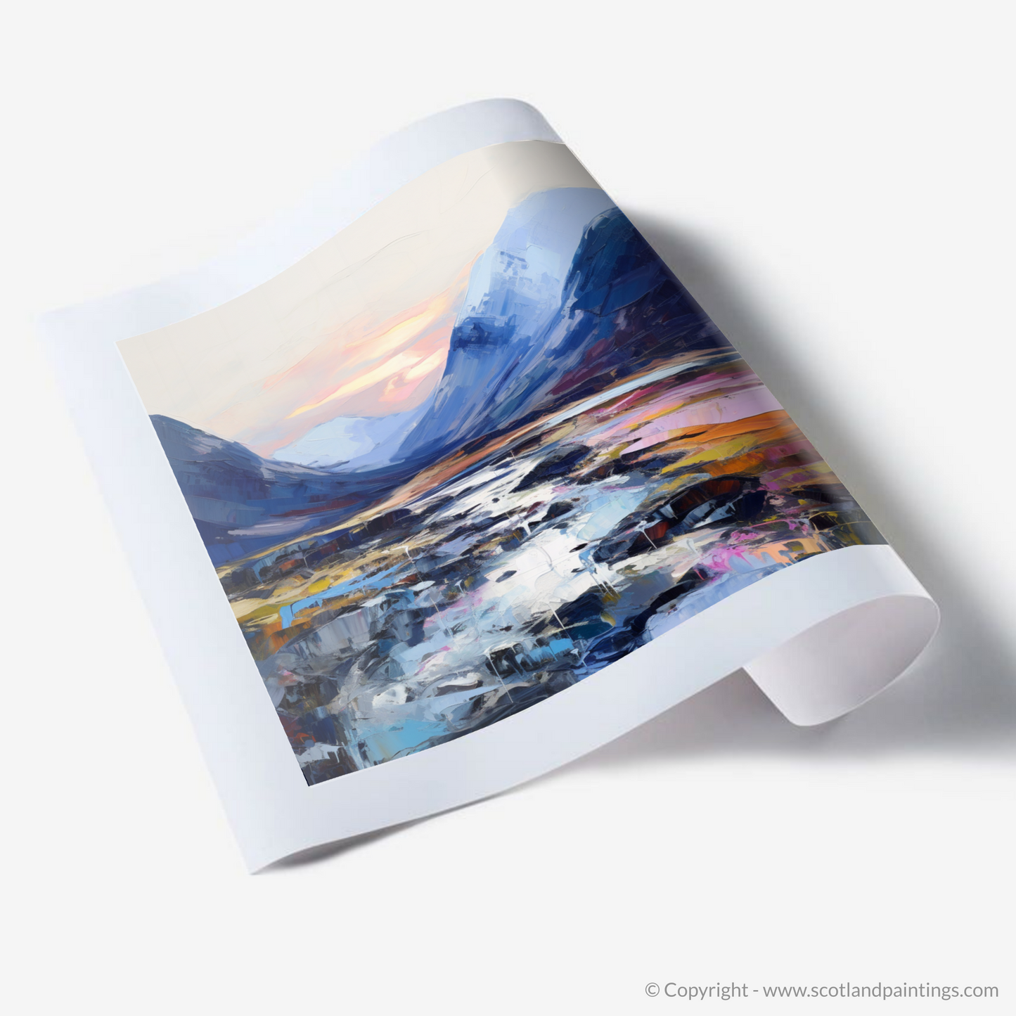 Captivating in its vibrant portrayal, this evocative print presents an artistic interpretation of the serene twilight hour on the slopes of Glencoe. Shades of dusky pinks and soft oranges meld harmoniously in the sky, hinting at the last light of day casting a warm glow over the majestic landscape. The mountains themselves are rendered with bold, impasto strokes in shades of deep blue and violet, suggesting their imposing presence as they rise dramatically on either side of the valley.