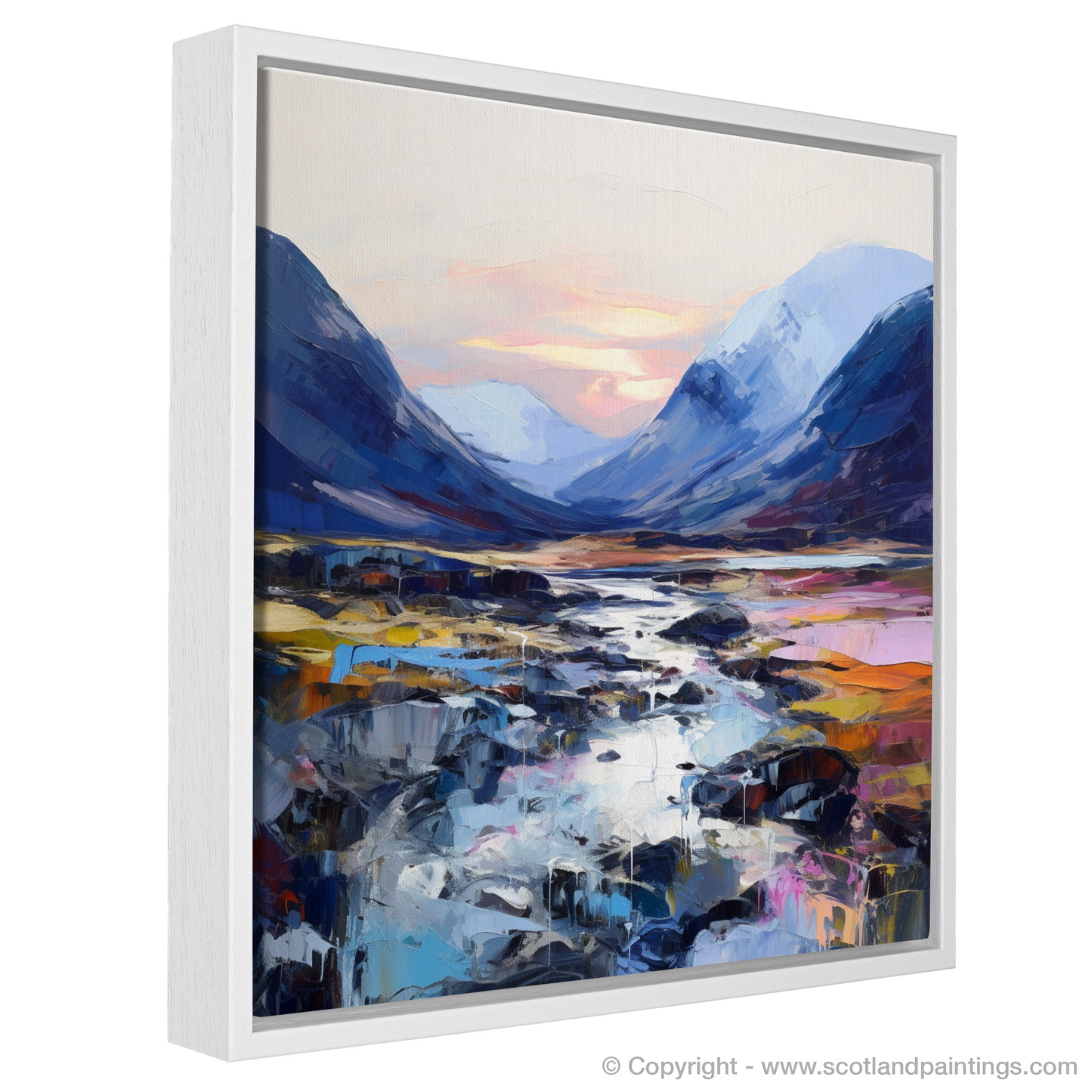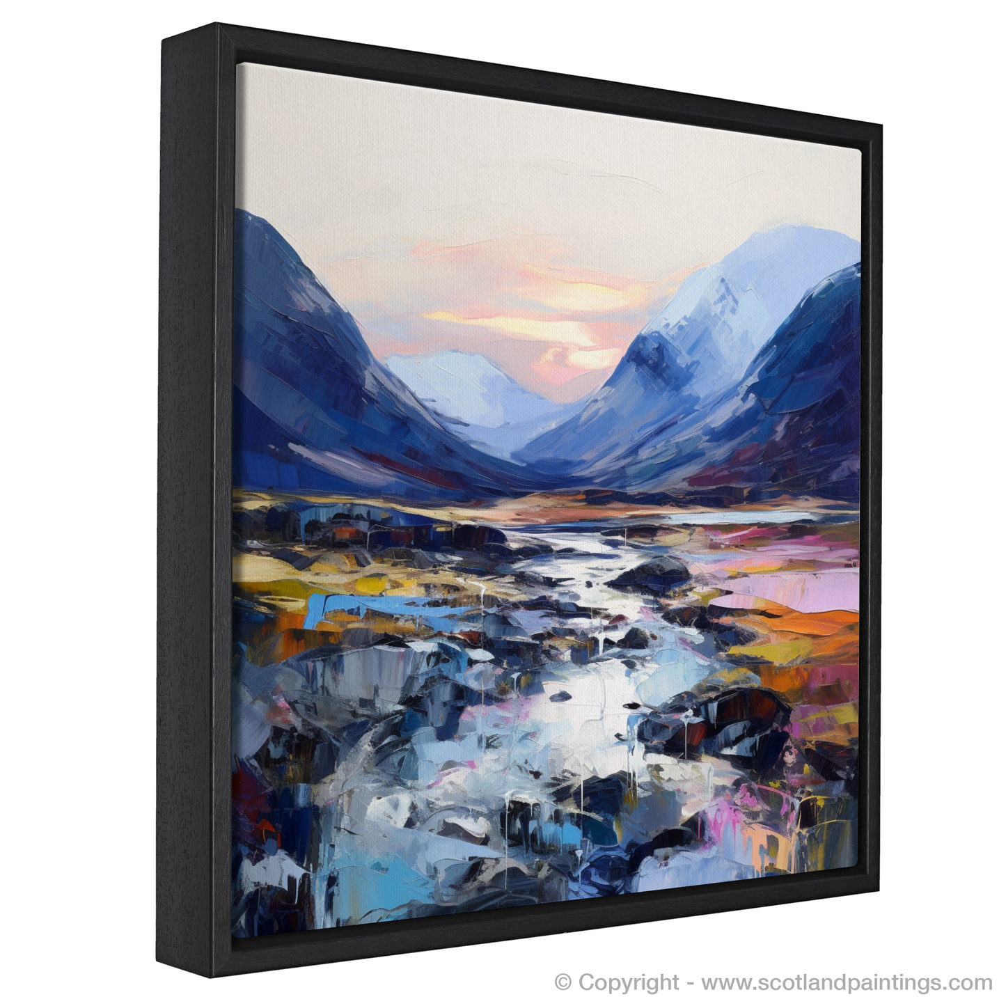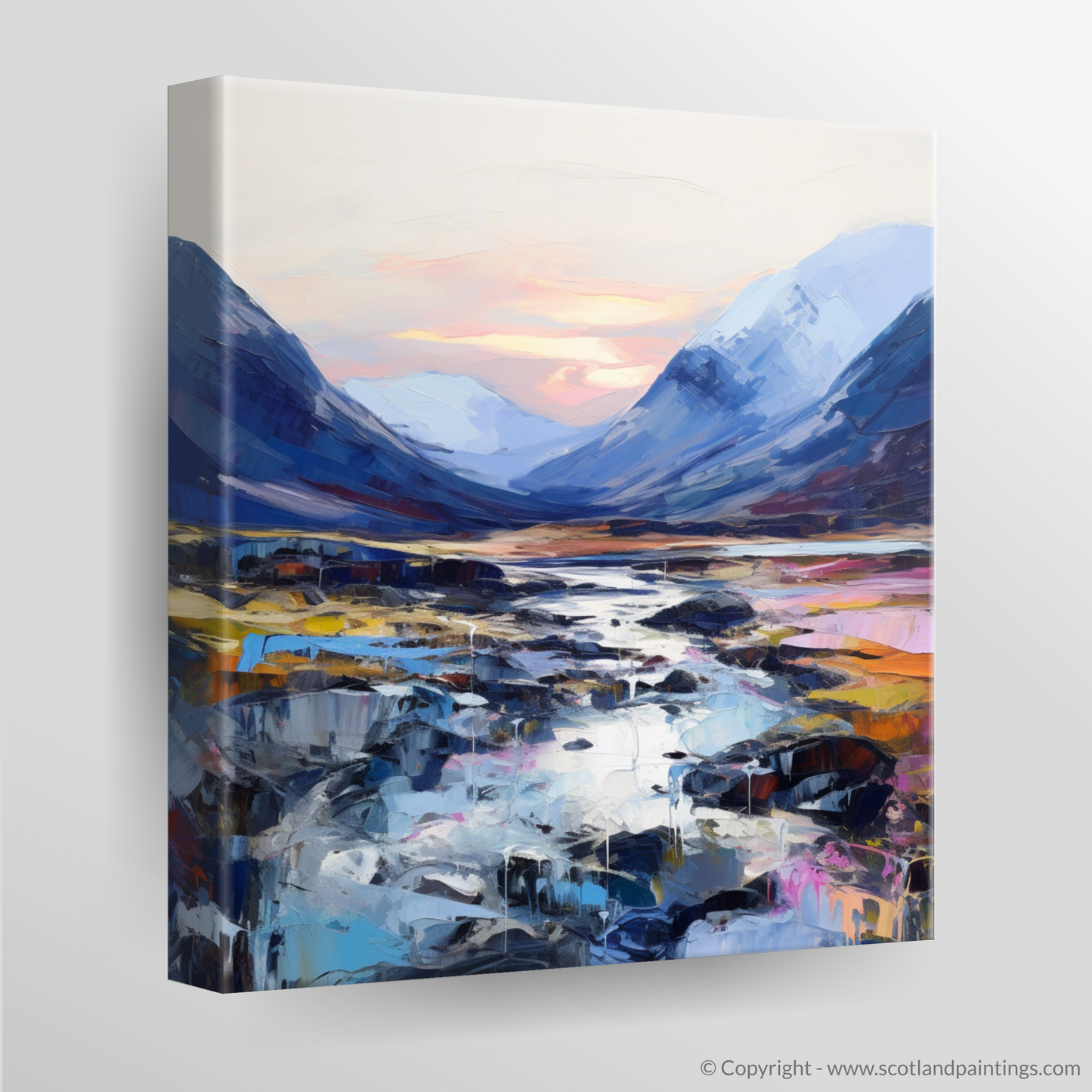 Captivating in its vibrant portrayal, this evocative print presents an artistic interpretation of the serene twilight hour on the slopes of Glencoe. Shades of dusky pinks and soft oranges meld harmoniously in the sky, hinting at the last light of day casting a warm glow over the majestic landscape. The mountains themselves are rendered with bold, impasto strokes in shades of deep blue and violet, suggesting their imposing presence as they rise dramatically on either side of the valley.