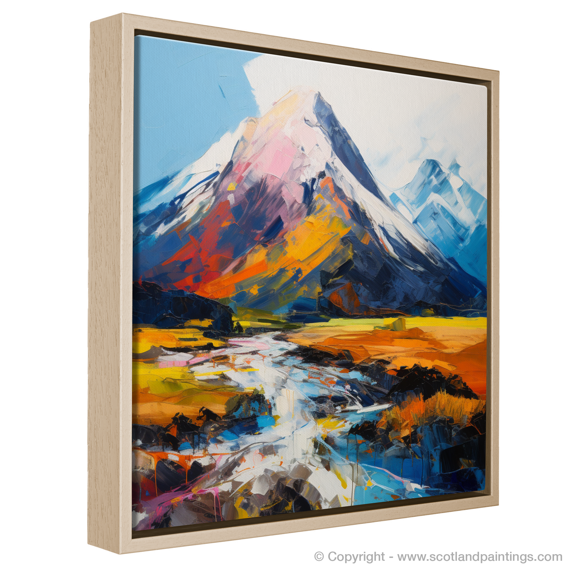 Capture the rugged grandeur of Scotland's most iconic peak with this vibrant expressionist interpretation of Ben Nevis. The towering presence of the majestic mountain is rendered with bold, impasto brushstrokes that convey a powerful sense of movement and emotion. Vivid hues of pink, orange, and blue collide in a dynamic palette, reflecting the mountain's ever-changing mood and the interplay of light across its craggy facade.