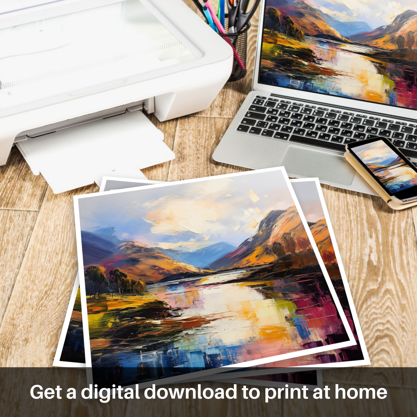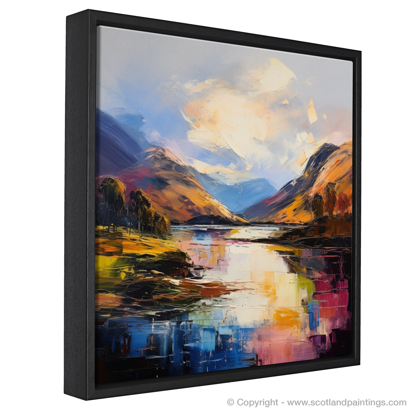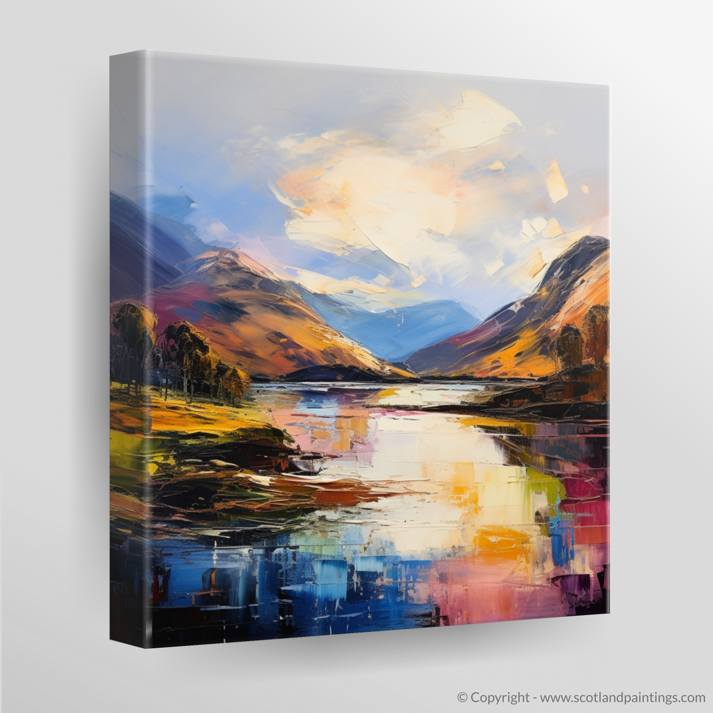 The rolling hills rise sharply from the banks of the loch, cloaked in a patchwork of earthy greens, fiery oranges, and deep purples, their rugged silhouettes a testament to the undying spirit of the wilds. Trees stand sentinel along the water's edge, their forms abstracted yet unmistakable, adding a sense of serene solidity to the fluid chaos of the surrounding landscape.