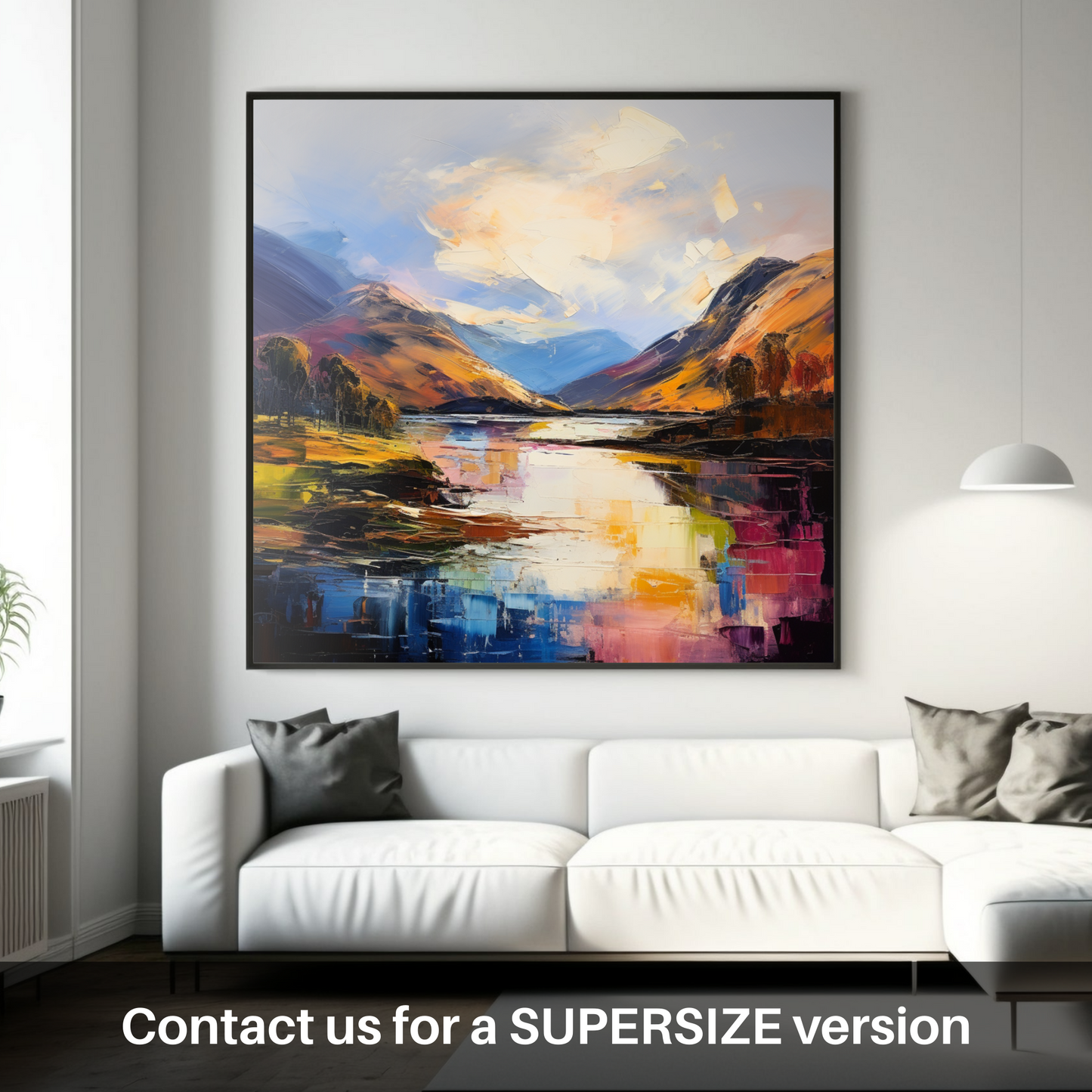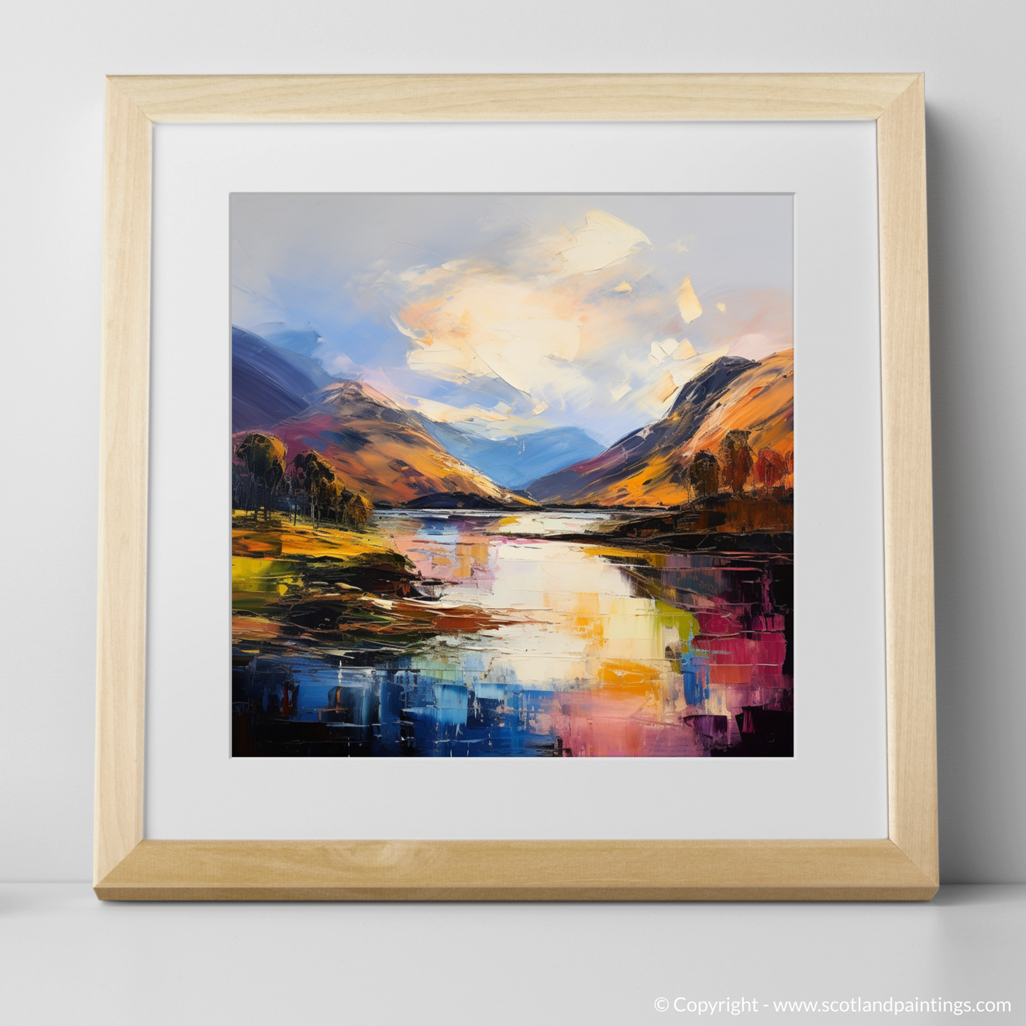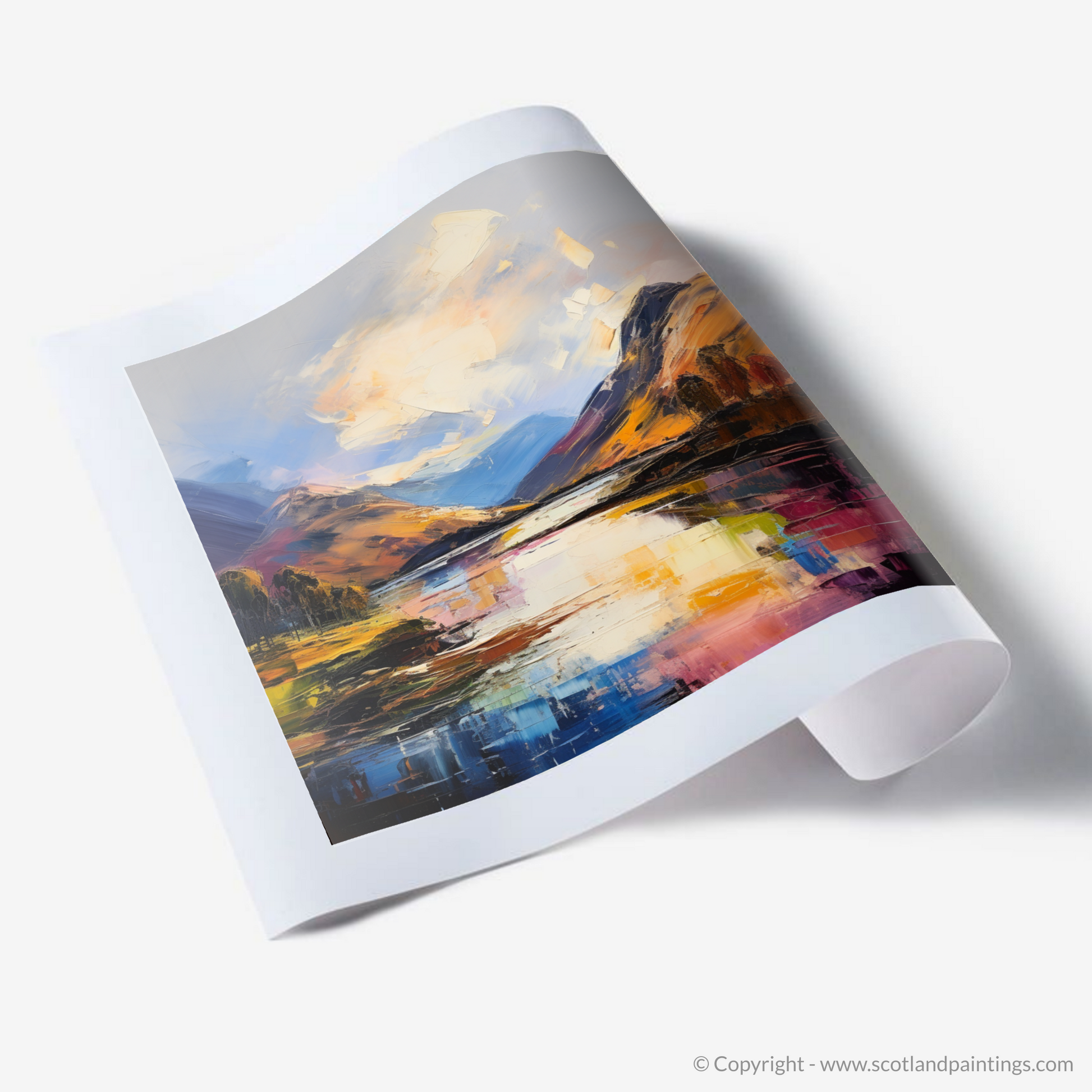 Captured within this evocative expressionist print is the enigmatic beauty of Loch Ness, nestled in the heart of the Scottish Highlands. The artwork draws you into a dynamic landscape alive with vivid brushstrokes and a tapestry of bold, emotive colours. The viewer's eye is drawn to the shimmering surface of the water, which mirrors the tumultuous sky above, in hues of creamy whites and serene blues that seem to dance with the amber glow of the setting or rising sun.