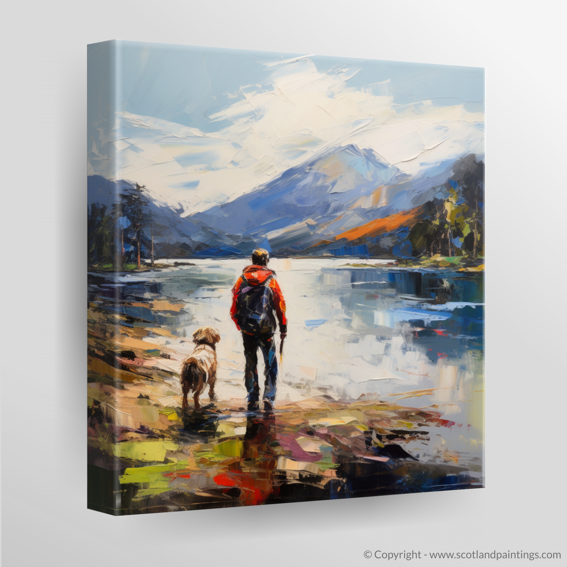 Behold a captivating rendition of a serene moment by Loch Lomond, where a solitary figure accompanied by a loyal canine companion saunters along the water's edge. This expressive piece captures the raw beauty of the Scottish landscape, infused with a vivid interplay of light and texture that evoke the spirit of the Expressionist movement.