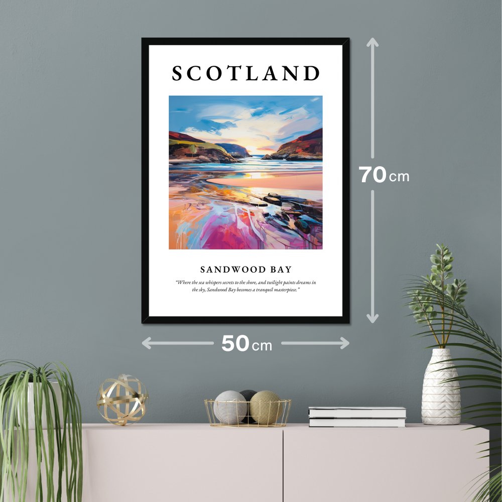 The poster captures the essence of Sandwood Bay with the word “SCOTLAND” emblazoned boldly across the top, inviting you to embrace the spirit of this enchanting locale. Below, in an evocative Expressionist style, the painting of Sandwood Bay mesmerises with its vivid hues and dynamic brushstrokes. The artwork’s portrayal of sunset over the bay, with waves gently caressing the shore, is a sensory feast of colours—from the vibrant blues and pinks of the sky to the warm, earthy tones reflected in the sand. It's for anyone who cherishes art, has a connection to Scotland, or favours the emotional depth of Expressionism.