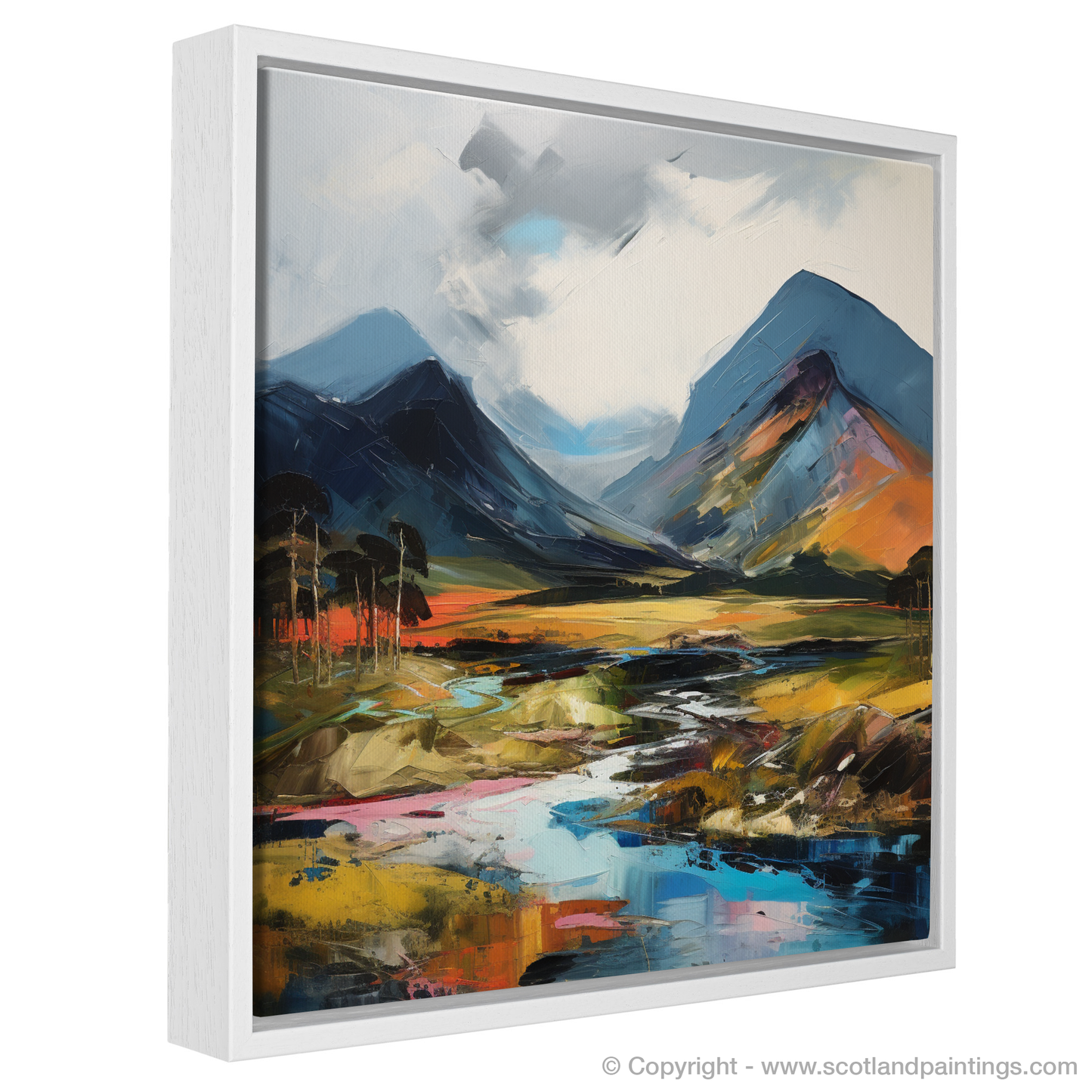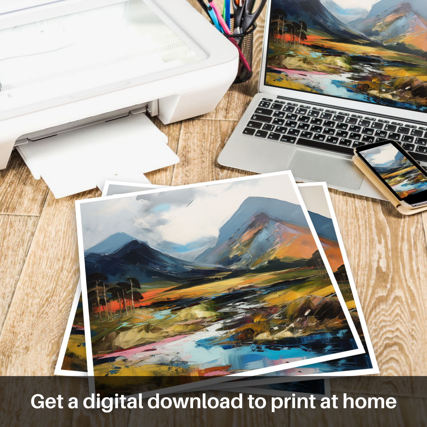 Capturing the untamed spirit of Meall Corranaich, a proud member of the Scottish Munros, this vibrant print brings the raw emotion of Expressionism to the fore. Broad, impulsive brushstrokes deliver an energy that pulsates through the majestic highland scenery. The artwork masterfully conveys the formidable presence of the mountain, with shadows and light playing off its rugged slopes, suggesting the fleeting and changeable weather that often cloaks these peaks.