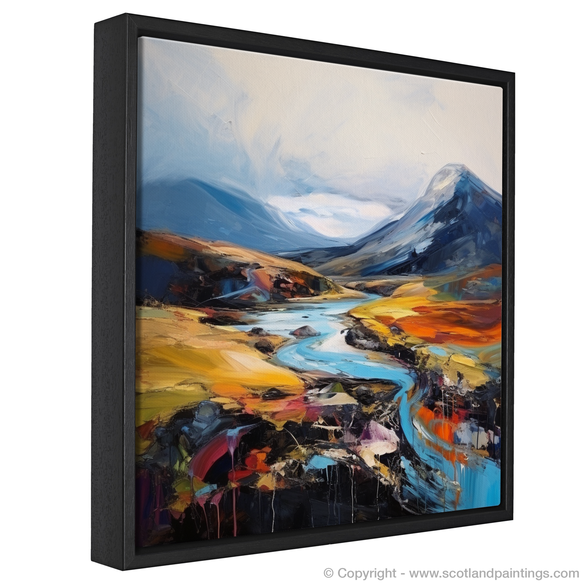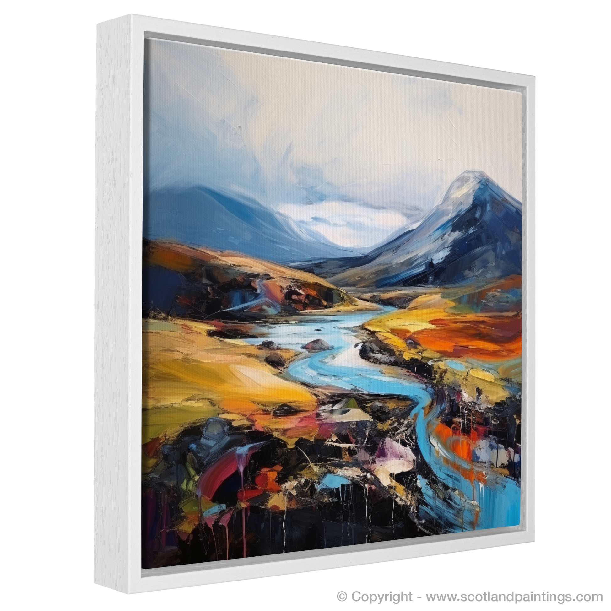 As your gaze falls upon this piece, it is drawn along a sinuous river that meanders through the heart of the landscape, its cerulean blue tones a vivid contrast to the fiery oranges and yellows that represent the heather-clad moorland. Surging strokes of white and azure suggest a dynamic sky, where the tumult of the Scottish weather plays out in an ever-changing display.