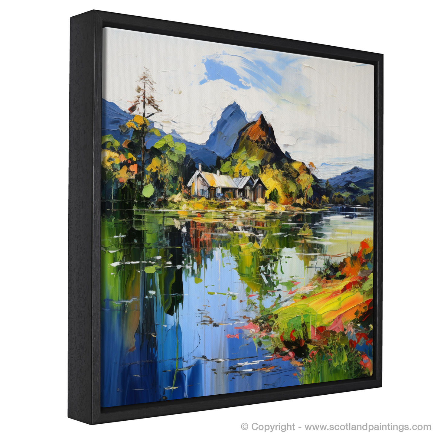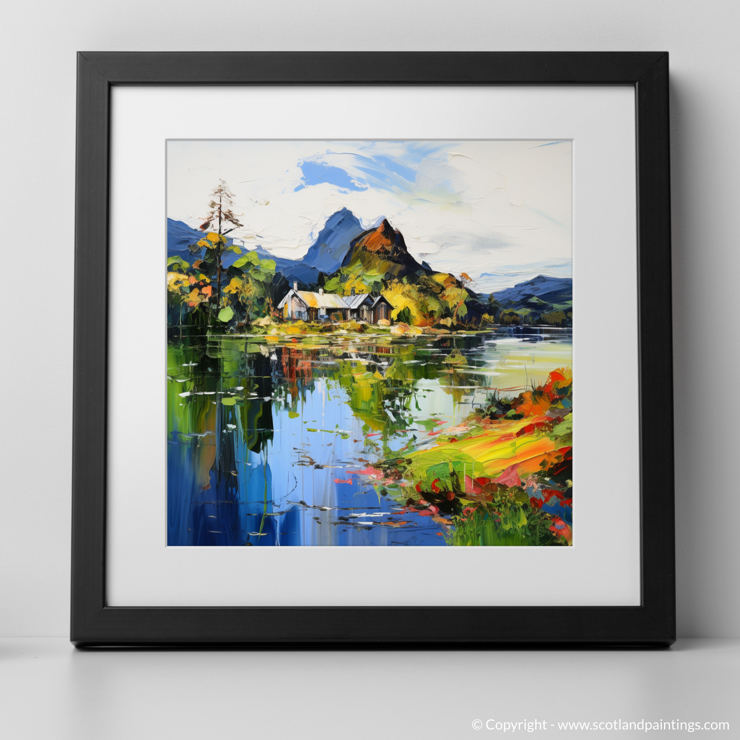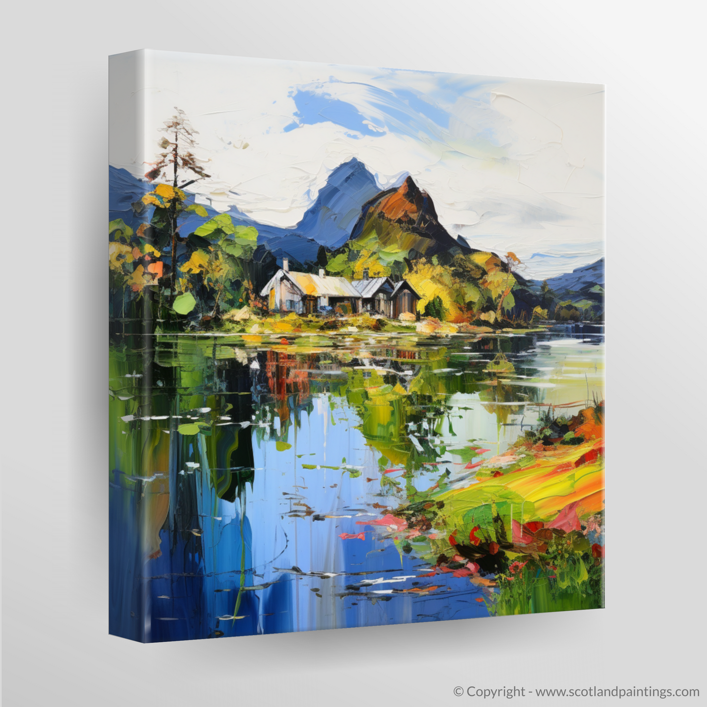 Captured in a vibrant array of colours, this expressionist piece transports viewers to the serene beauty of Loch Ard in Stirling, nestled within the heart of the Scottish landscape. Buoyant brushstrokes and a dynamic palette convey the natural splendour, as the painting depicts an idyllic scene where rustic buildings perch quietly by the water's edge.