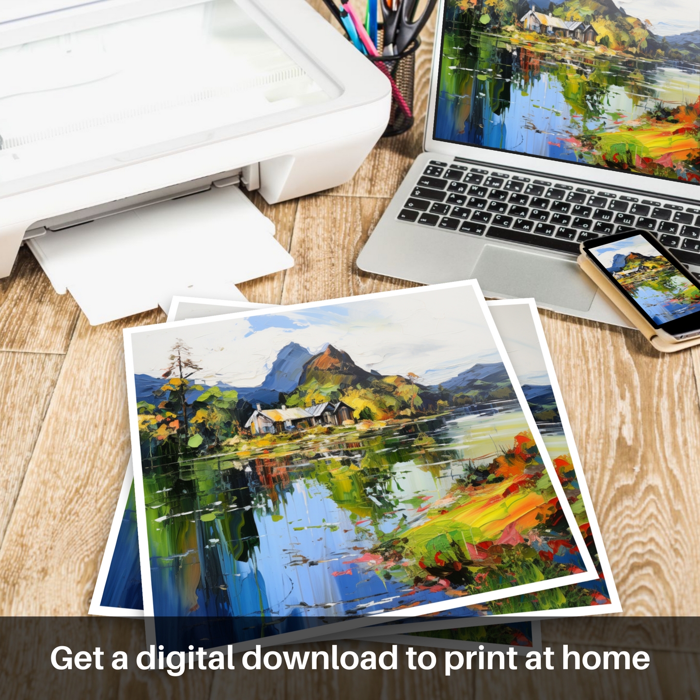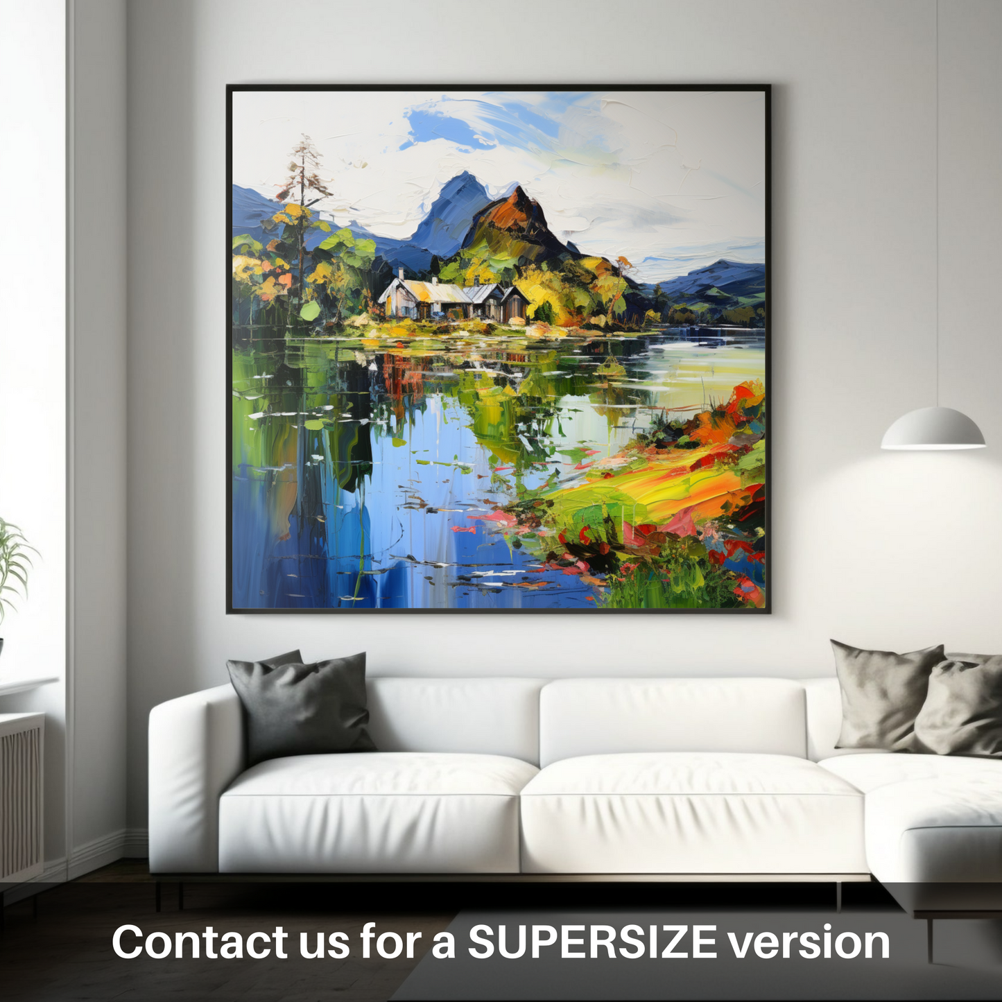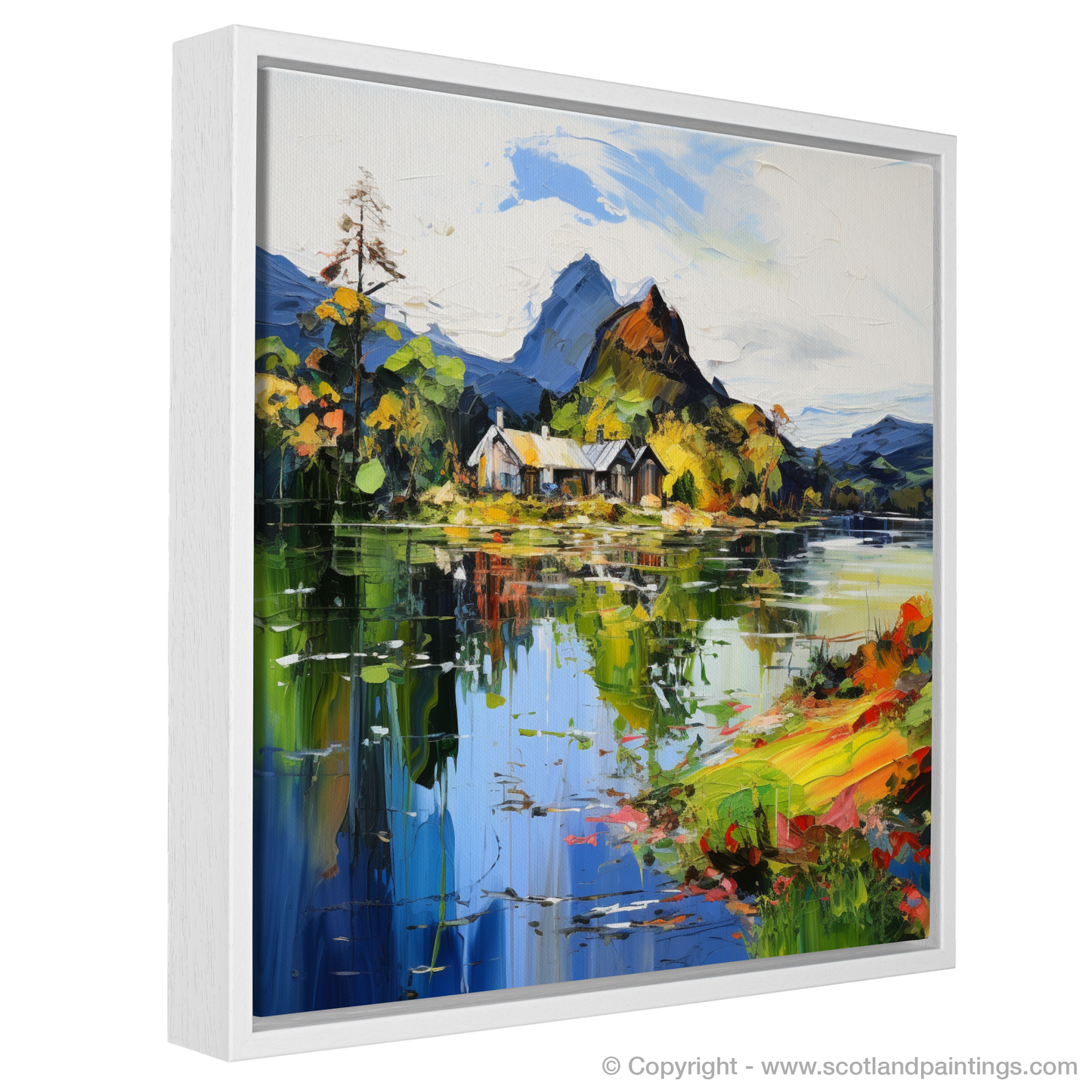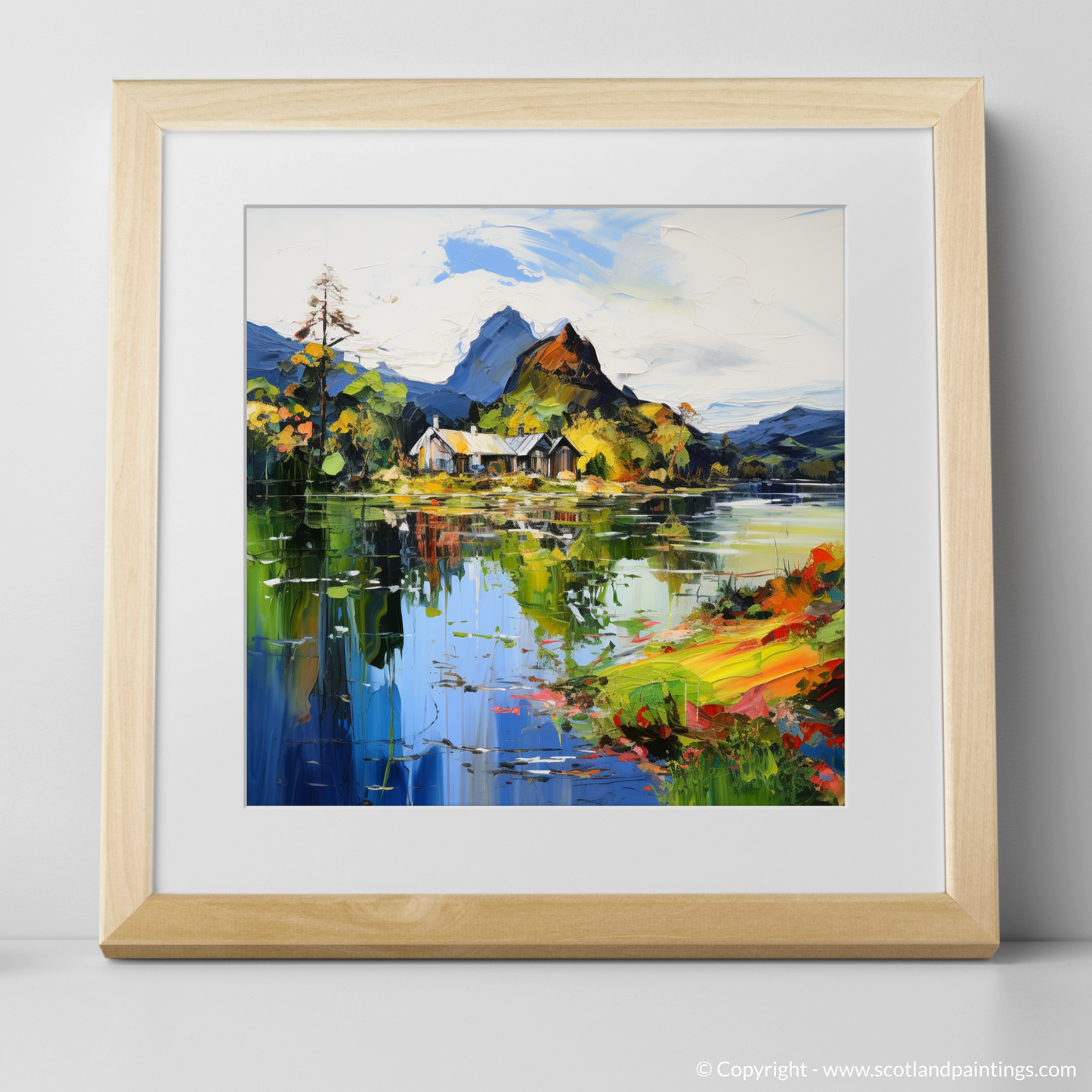 Captured in a vibrant array of colours, this expressionist piece transports viewers to the serene beauty of Loch Ard in Stirling, nestled within the heart of the Scottish landscape. Buoyant brushstrokes and a dynamic palette convey the natural splendour, as the painting depicts an idyllic scene where rustic buildings perch quietly by the water's edge.