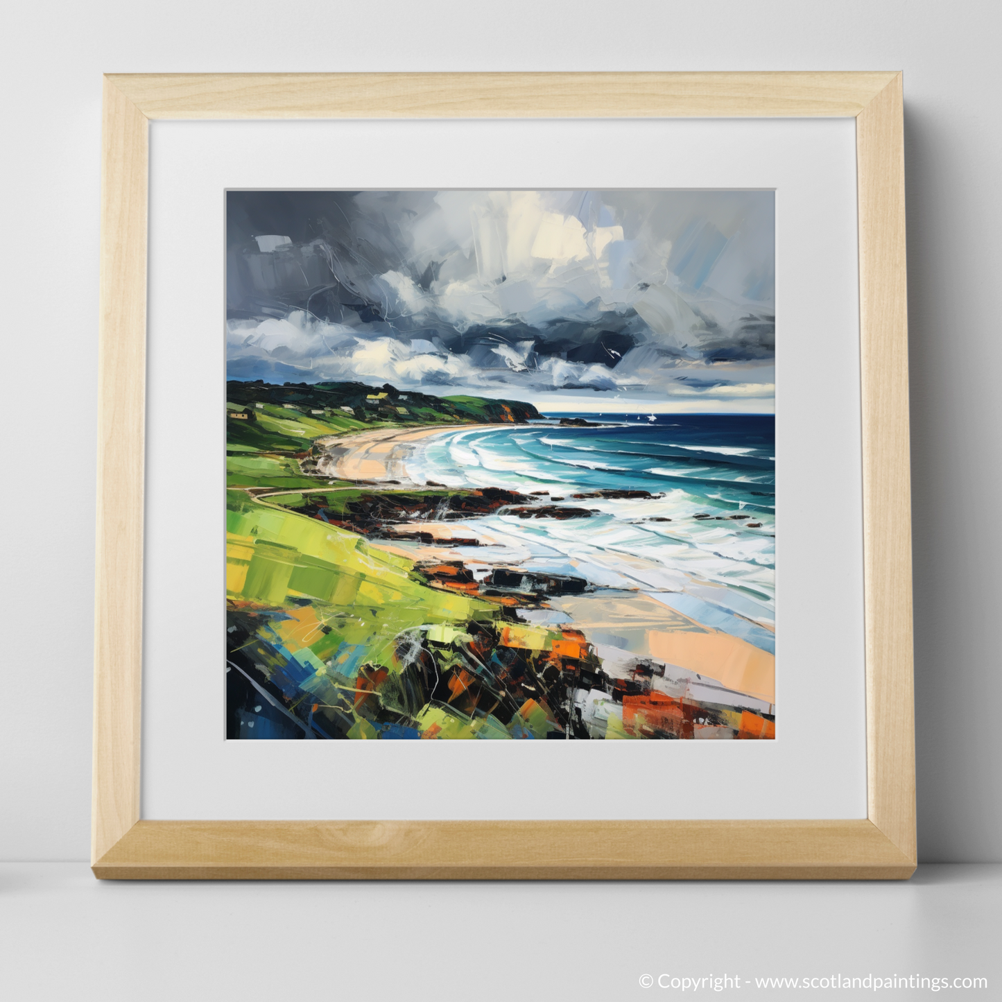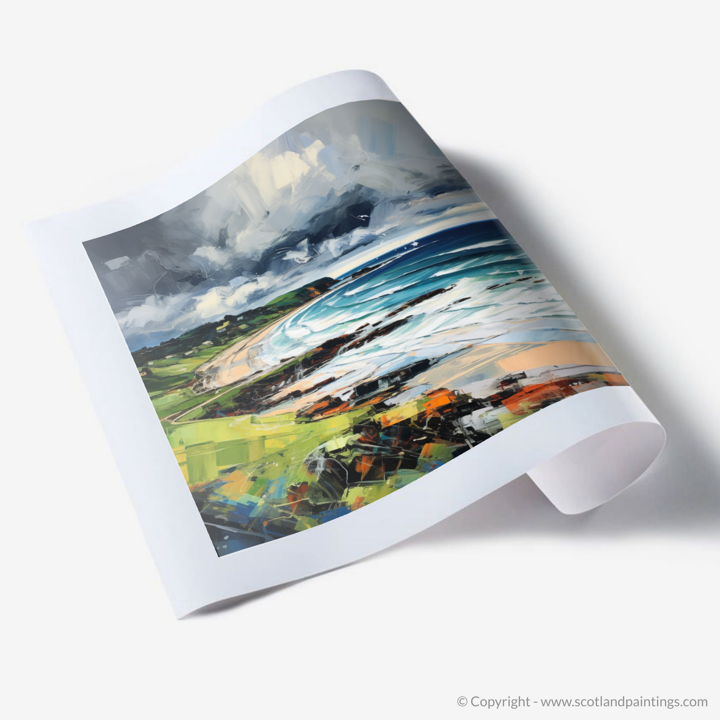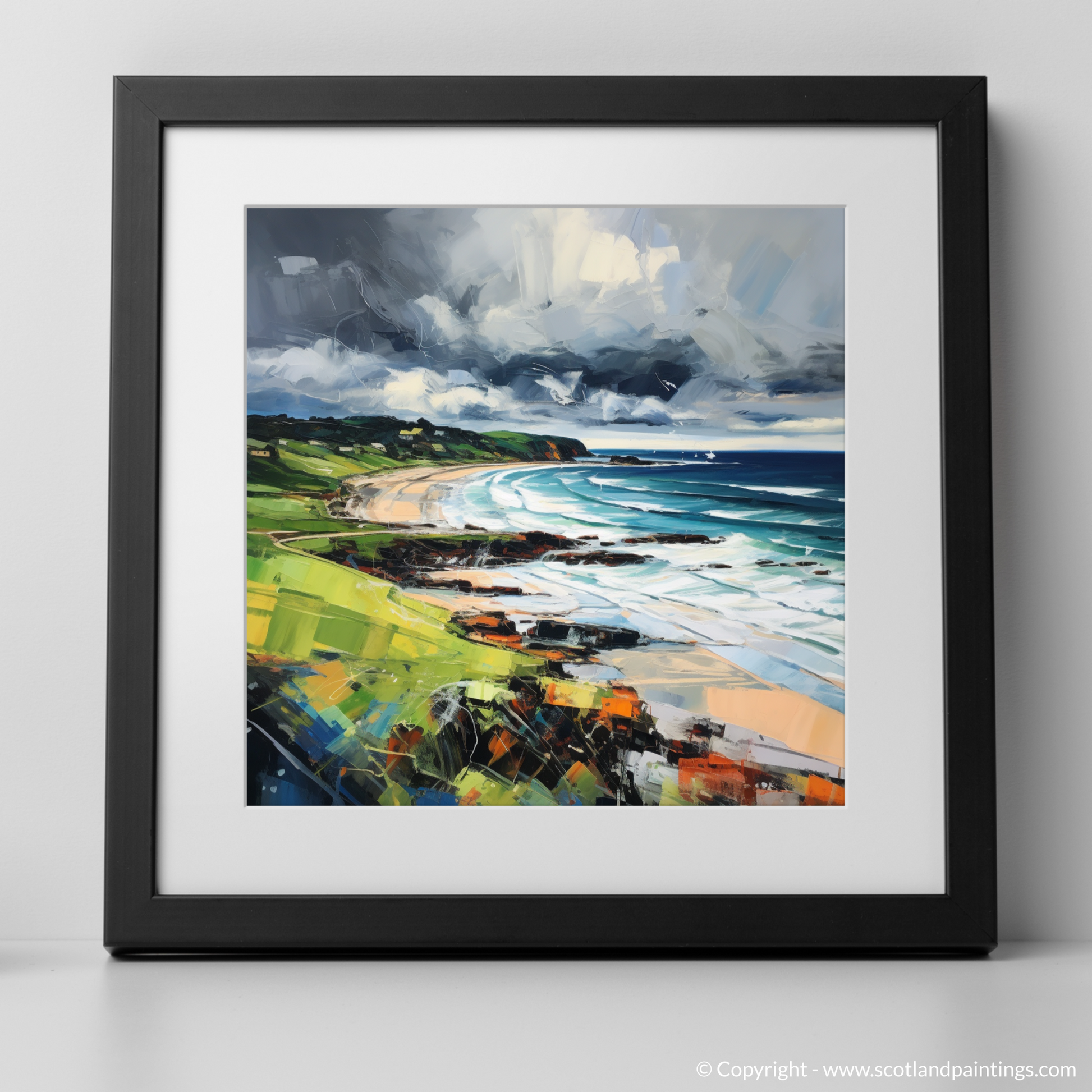 The artwork exemplifies the vigour of expressionism, using bold, impasto strokes that bring a tactile sense of the elements to life. Shades of deep grey and white clash overhead, an omen of the capricious weather so characteristic of Scottish beaches, while the horizon maintains a crisp clarity, a fleeting moment of calm in the midst of nature's fury.