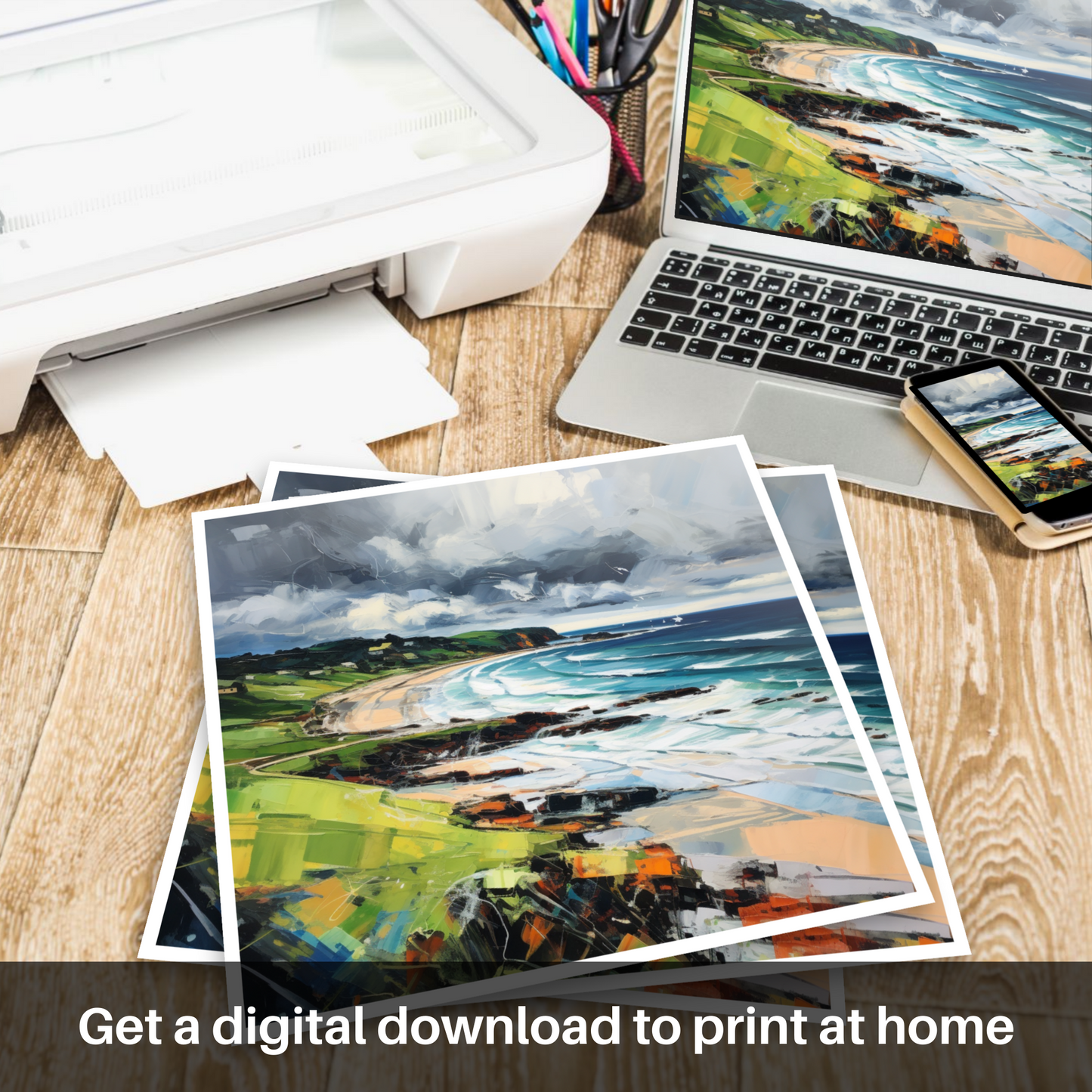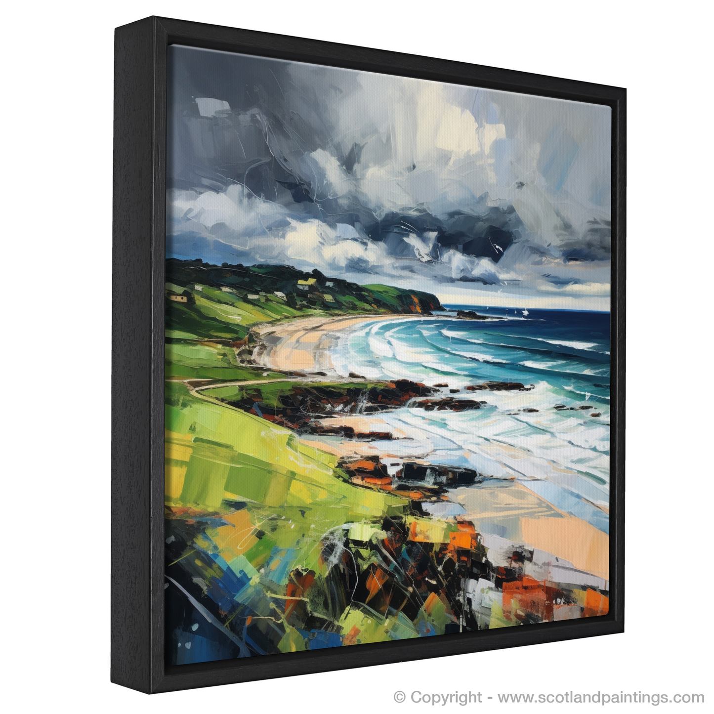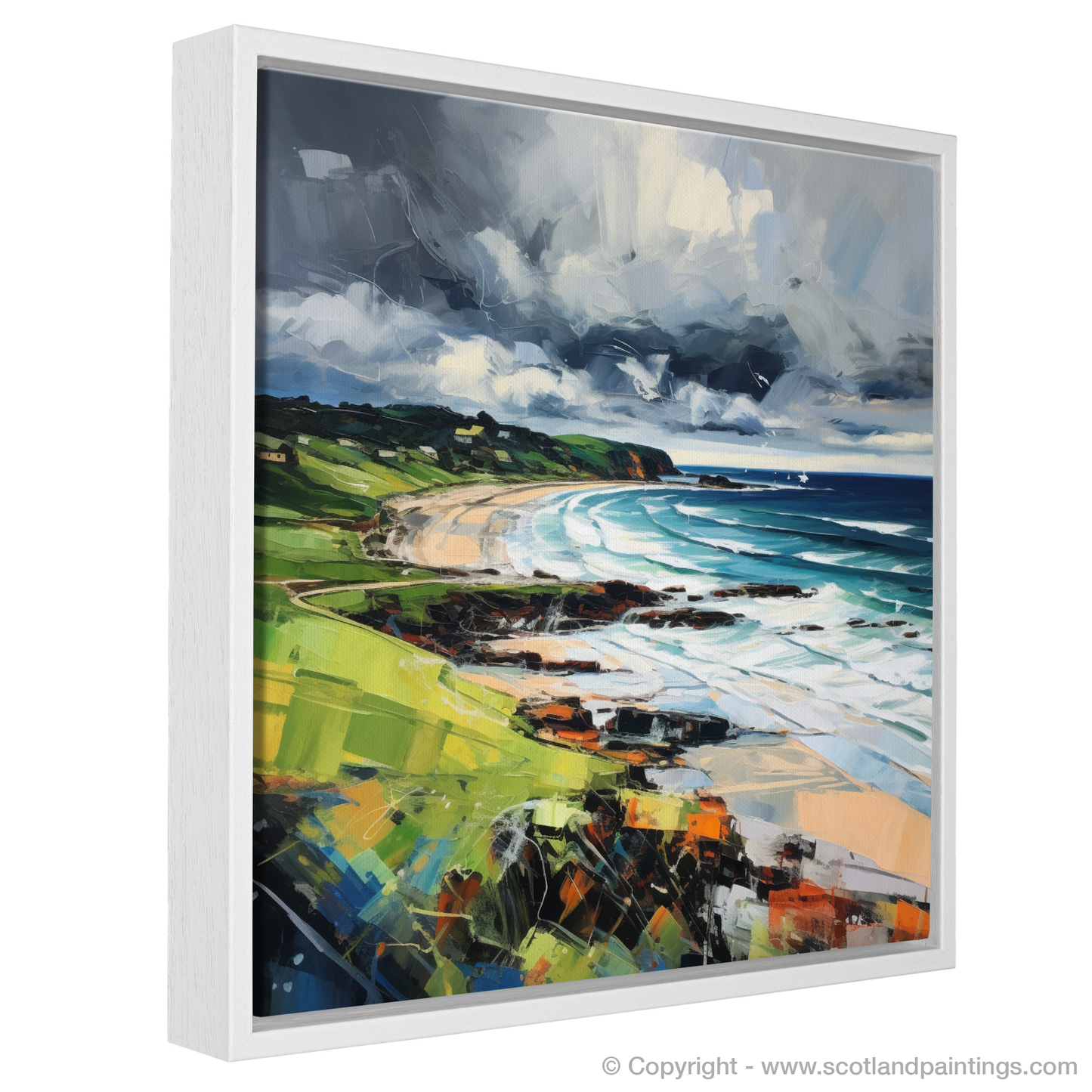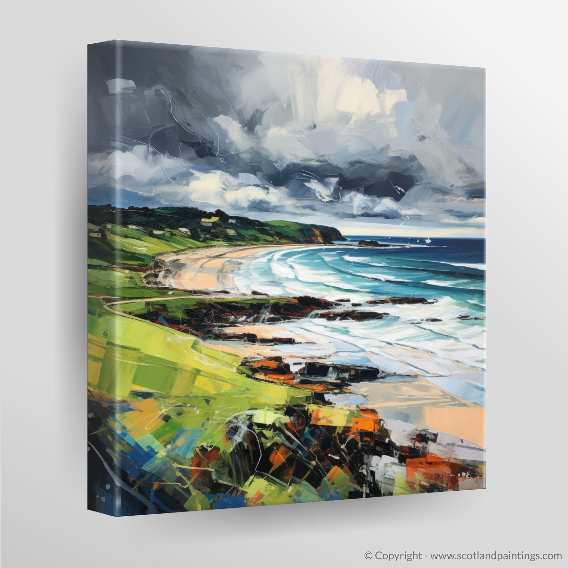 The artwork exemplifies the vigour of expressionism, using bold, impasto strokes that bring a tactile sense of the elements to life. Shades of deep grey and white clash overhead, an omen of the capricious weather so characteristic of Scottish beaches, while the horizon maintains a crisp clarity, a fleeting moment of calm in the midst of nature's fury.