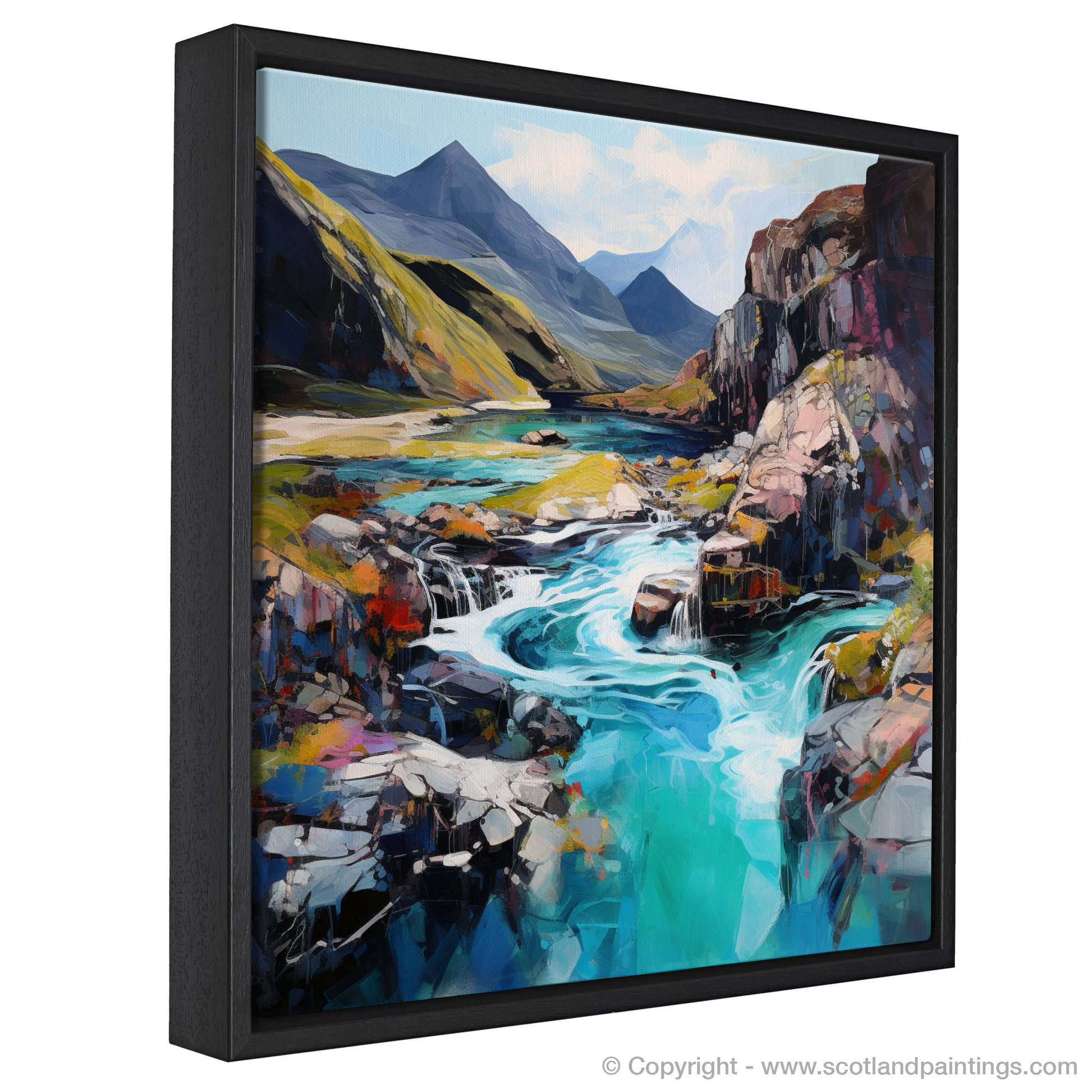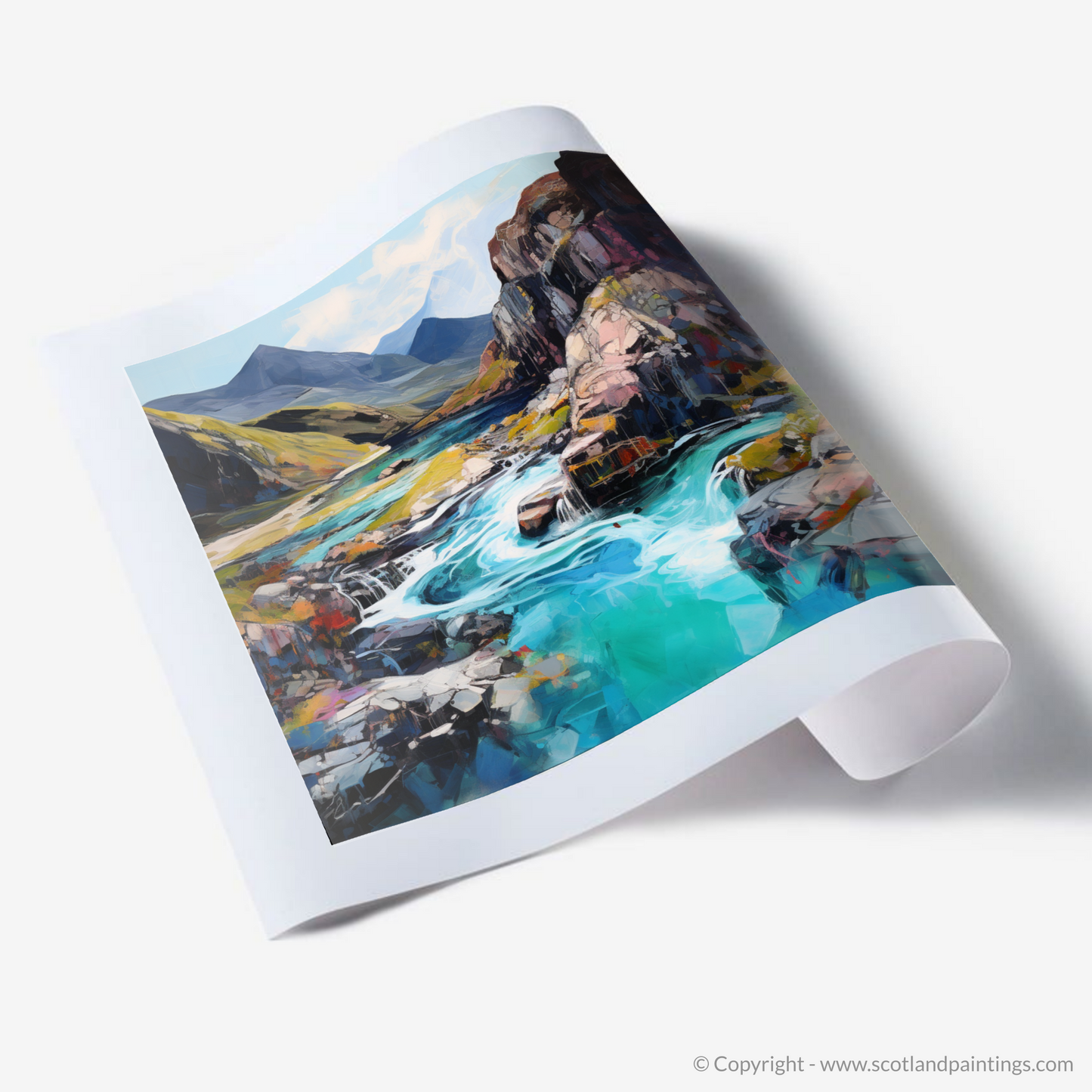Capturing the rugged beauty of the Scottish landscape, this expressive print draws inspiration from the enchanting Fairy Pools of the Isle of Skye. The artwork is infused with a vibrant palette and bold brushstrokes, characteristic of the Expressionist style, rendering the scene with emotion and energy that transcends literal representation.