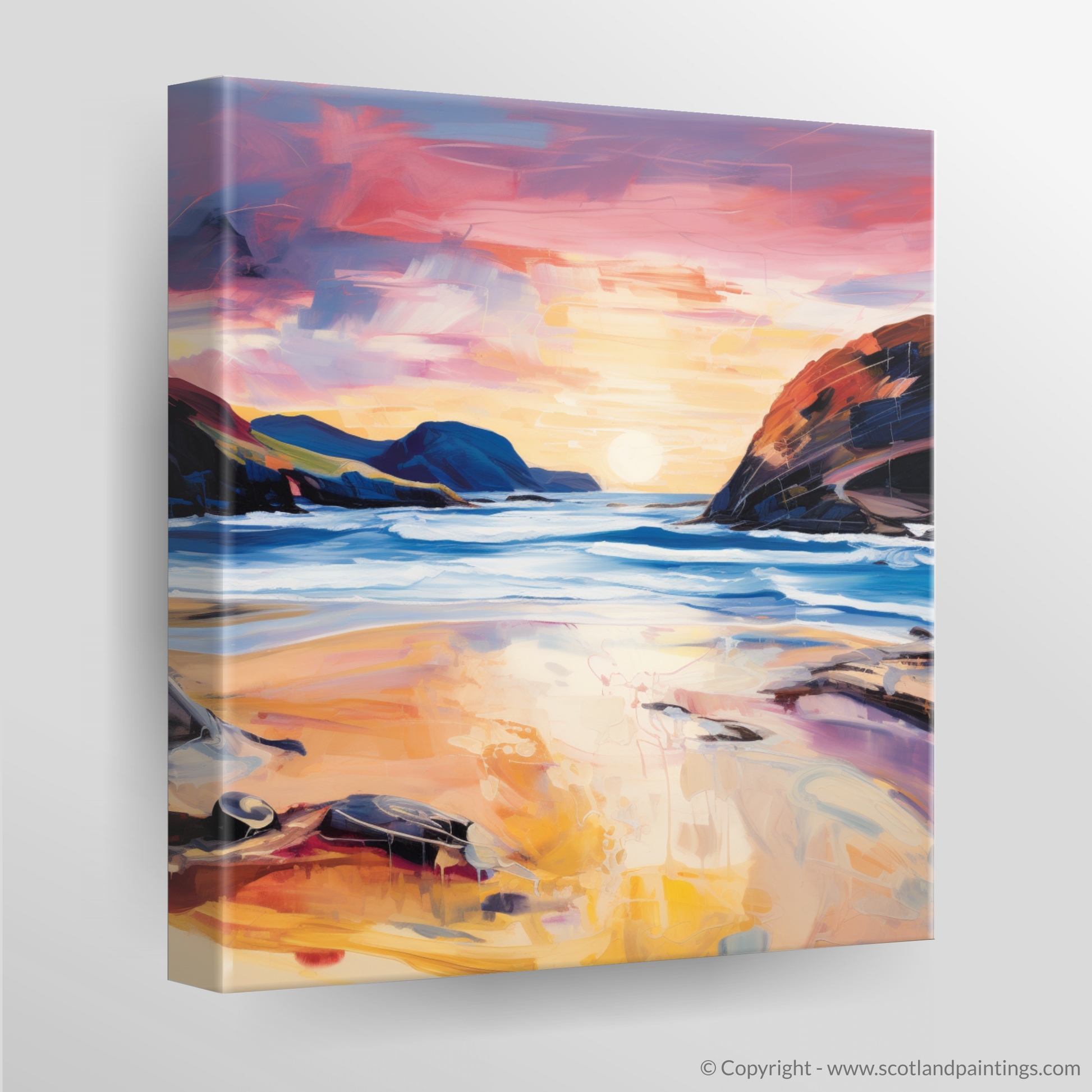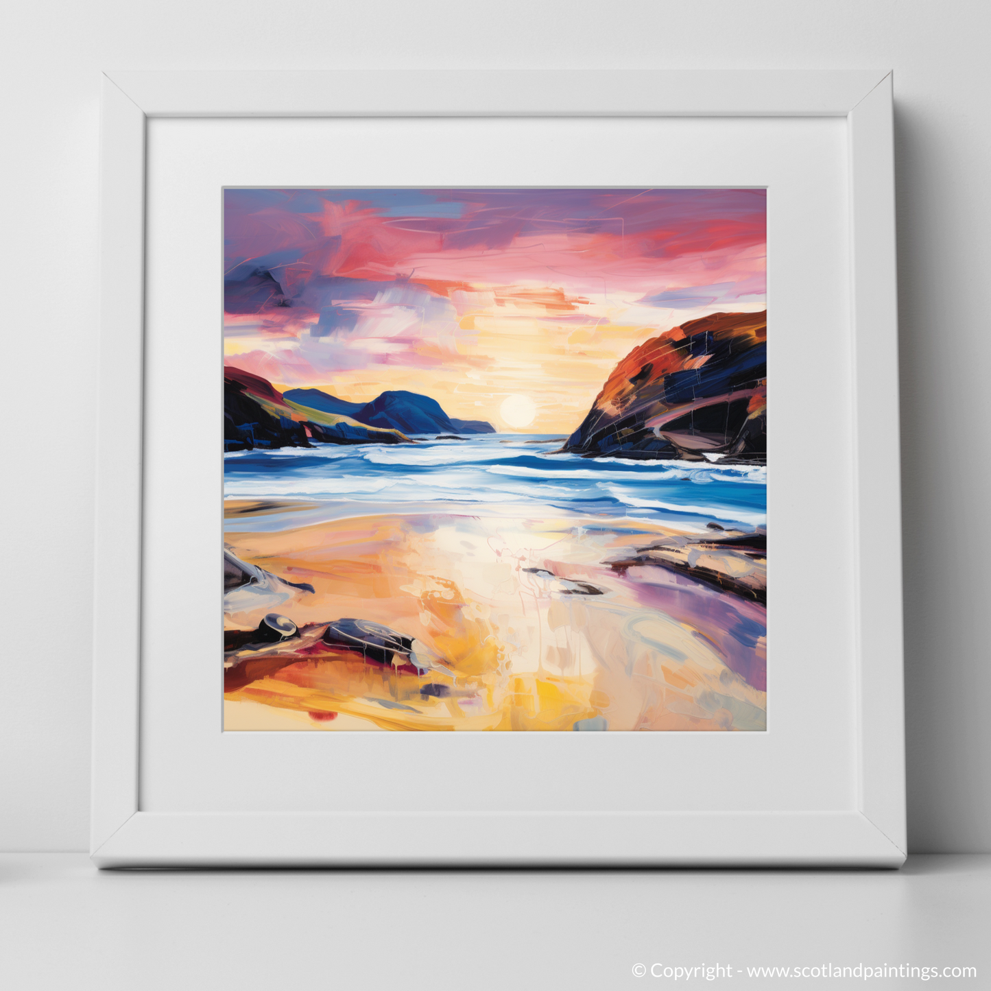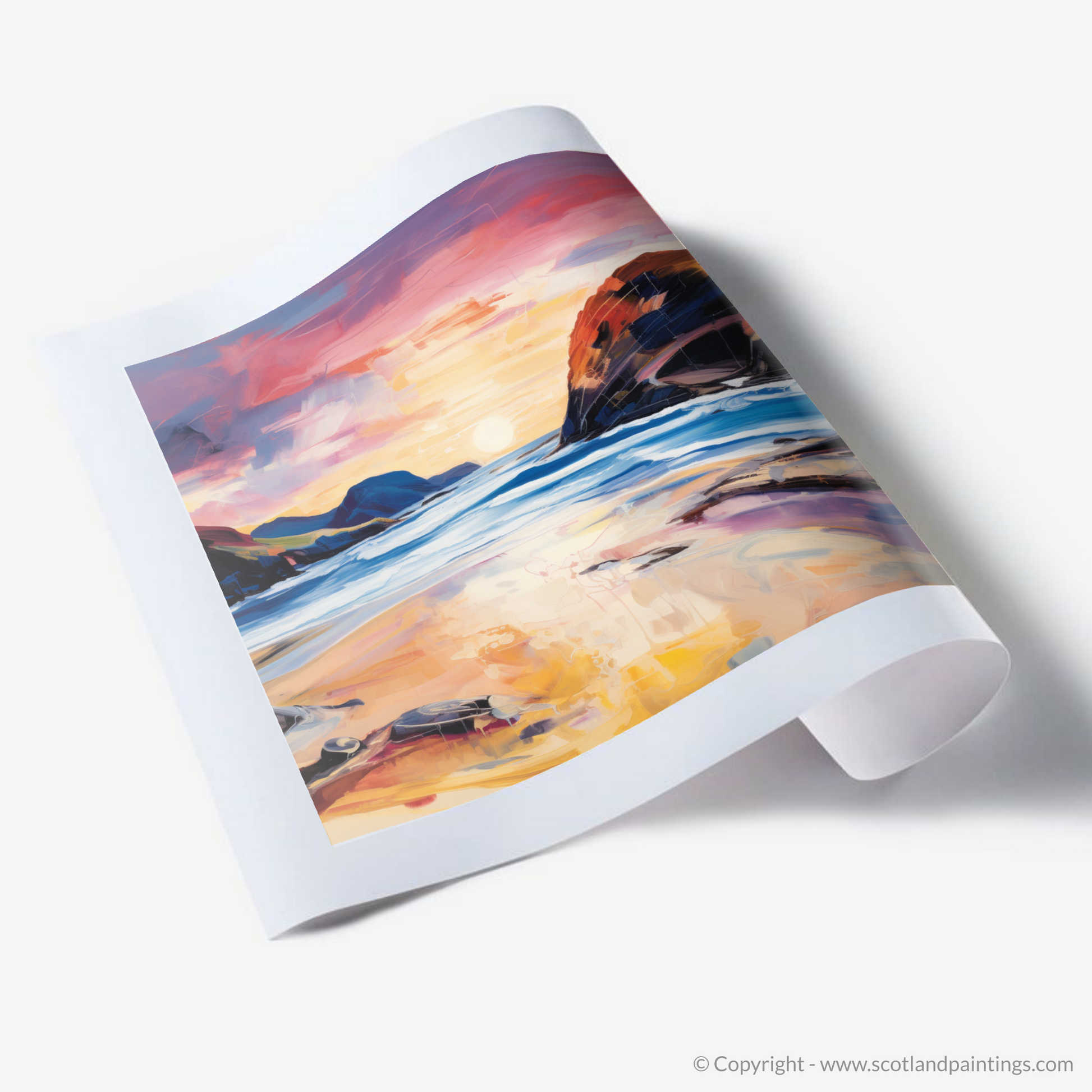 Captured within this visual masterpiece is the evocative beauty of Sandwood Bay at the waning hours of daylight. The swirls of vibrant colours dance across the canvas, encapsulating the fading glow of the sun as it sinks towards the horizon. A symphony of fiery reds and oranges blends with the cooler purples and blues, evoking the ephemeral transition from day to night.