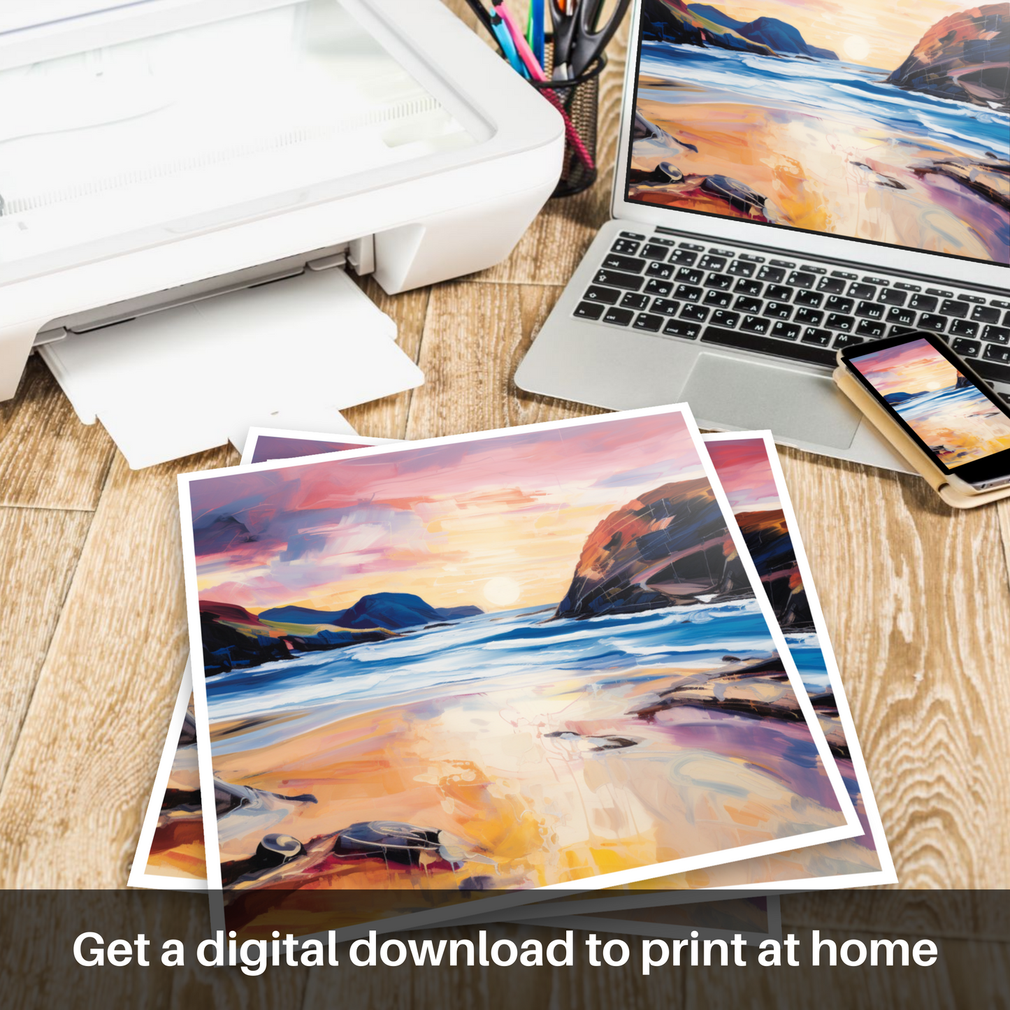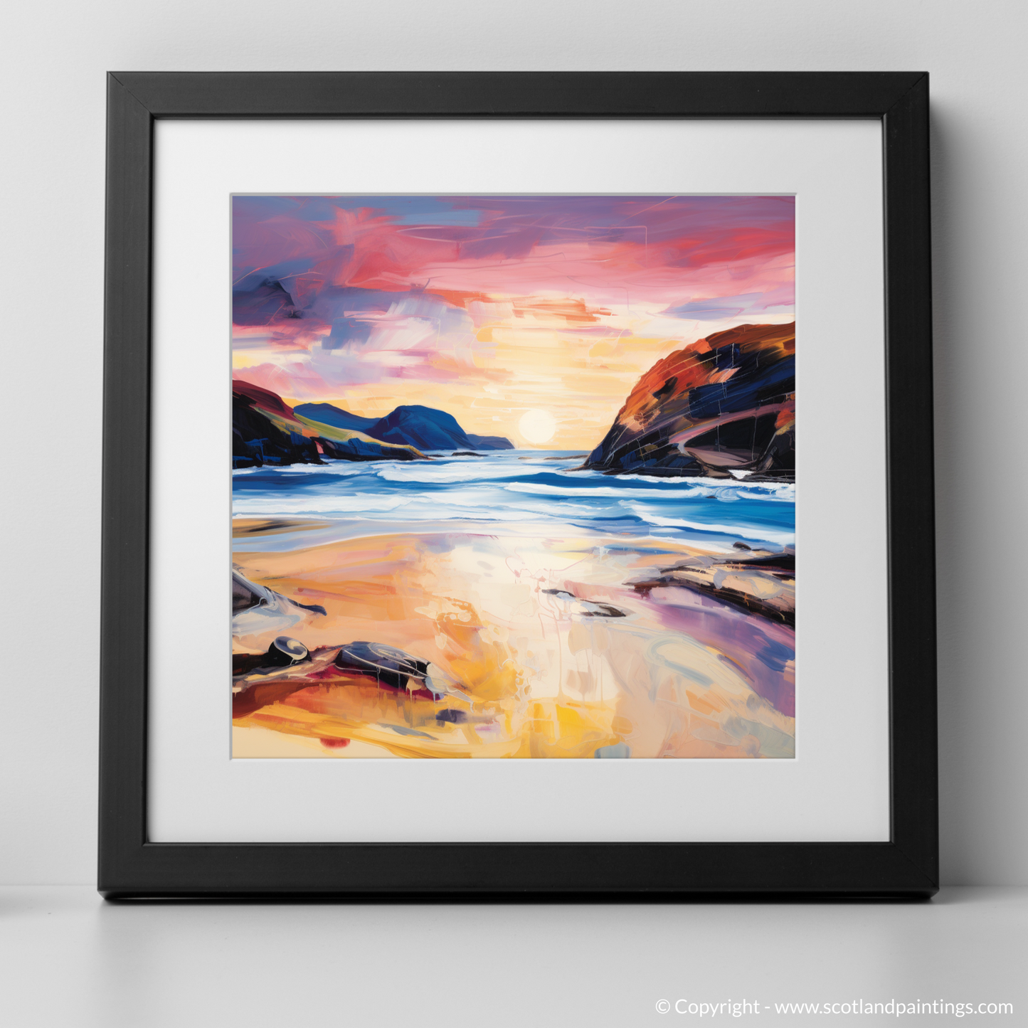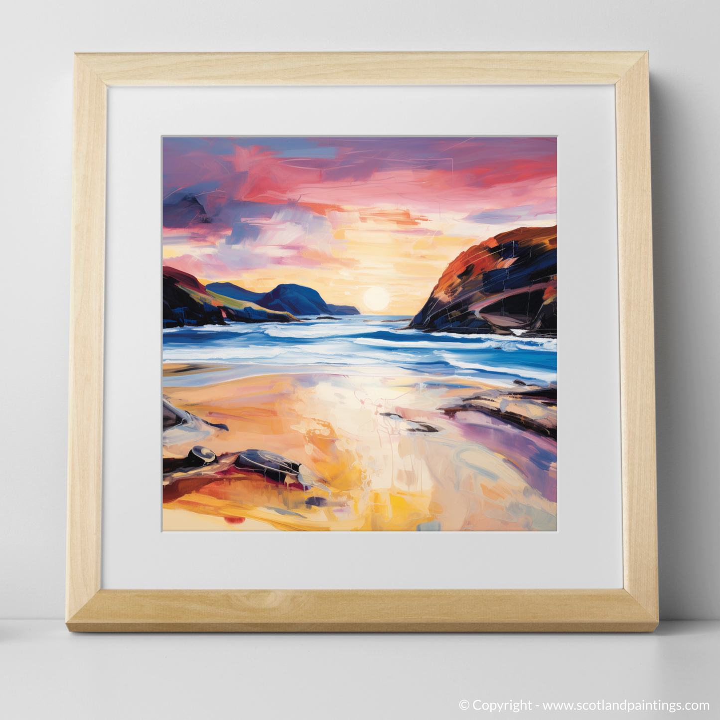 Captured within this visual masterpiece is the evocative beauty of Sandwood Bay at the waning hours of daylight. The swirls of vibrant colours dance across the canvas, encapsulating the fading glow of the sun as it sinks towards the horizon. A symphony of fiery reds and oranges blends with the cooler purples and blues, evoking the ephemeral transition from day to night.