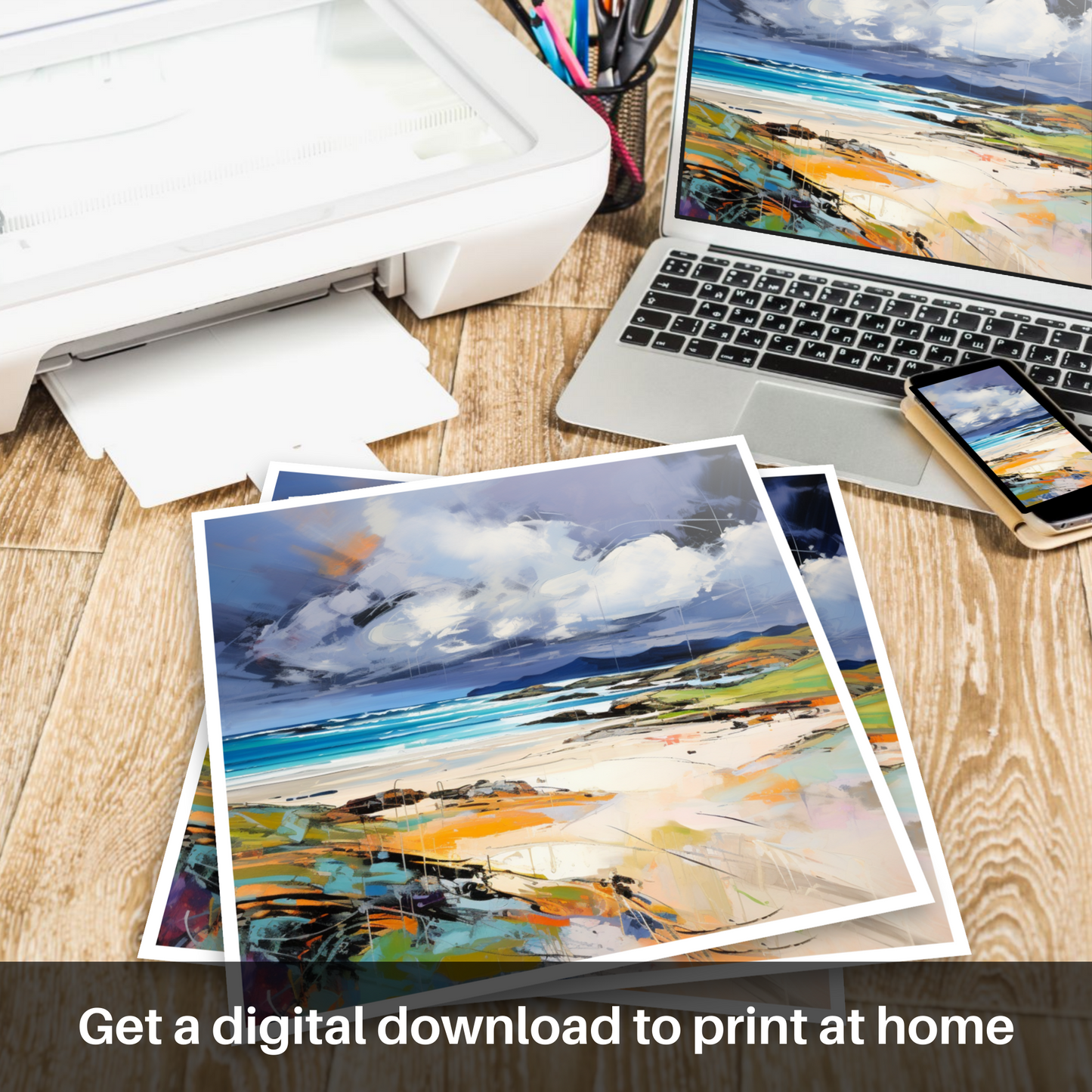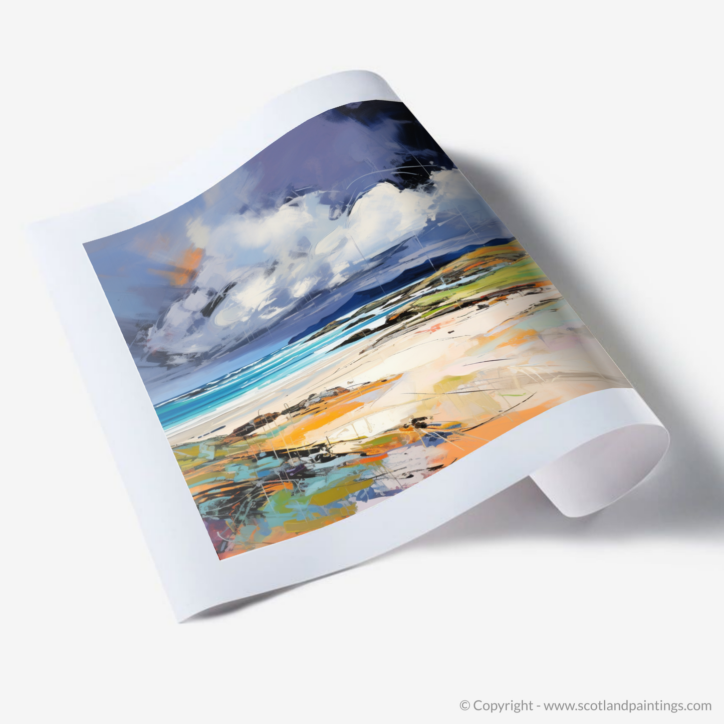 Captivating with its dynamic interplay of colour and form, this striking print captures the untamed beauty of Traigh Mhor under a tempestuous sky that churns with energy. The artwork showcases the rawness of the Scottish landscape, with the storm's power reflected in the bold, swirling brushstrokes of greys, whites, and a hint of fiery orange that burn through the brooding heavens.