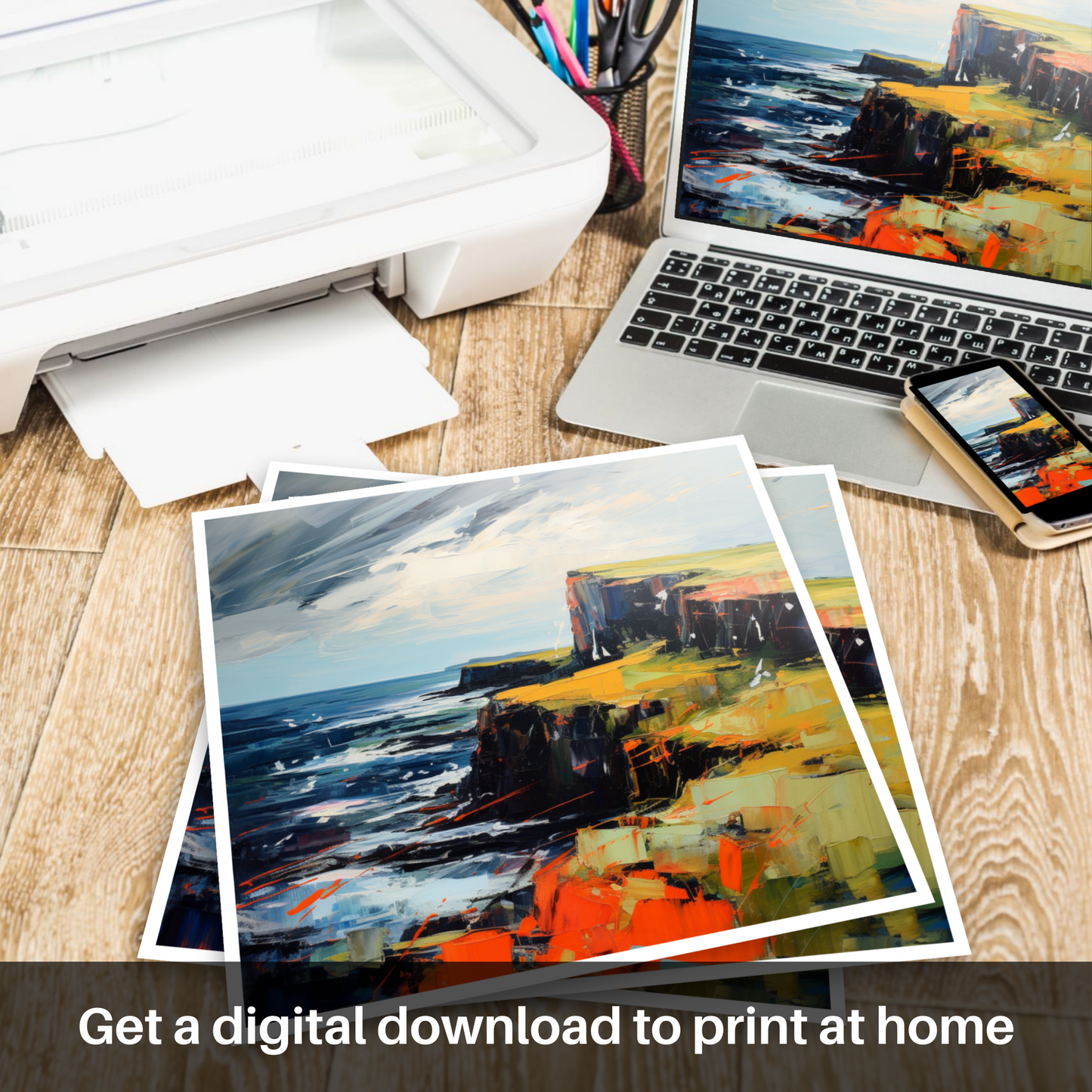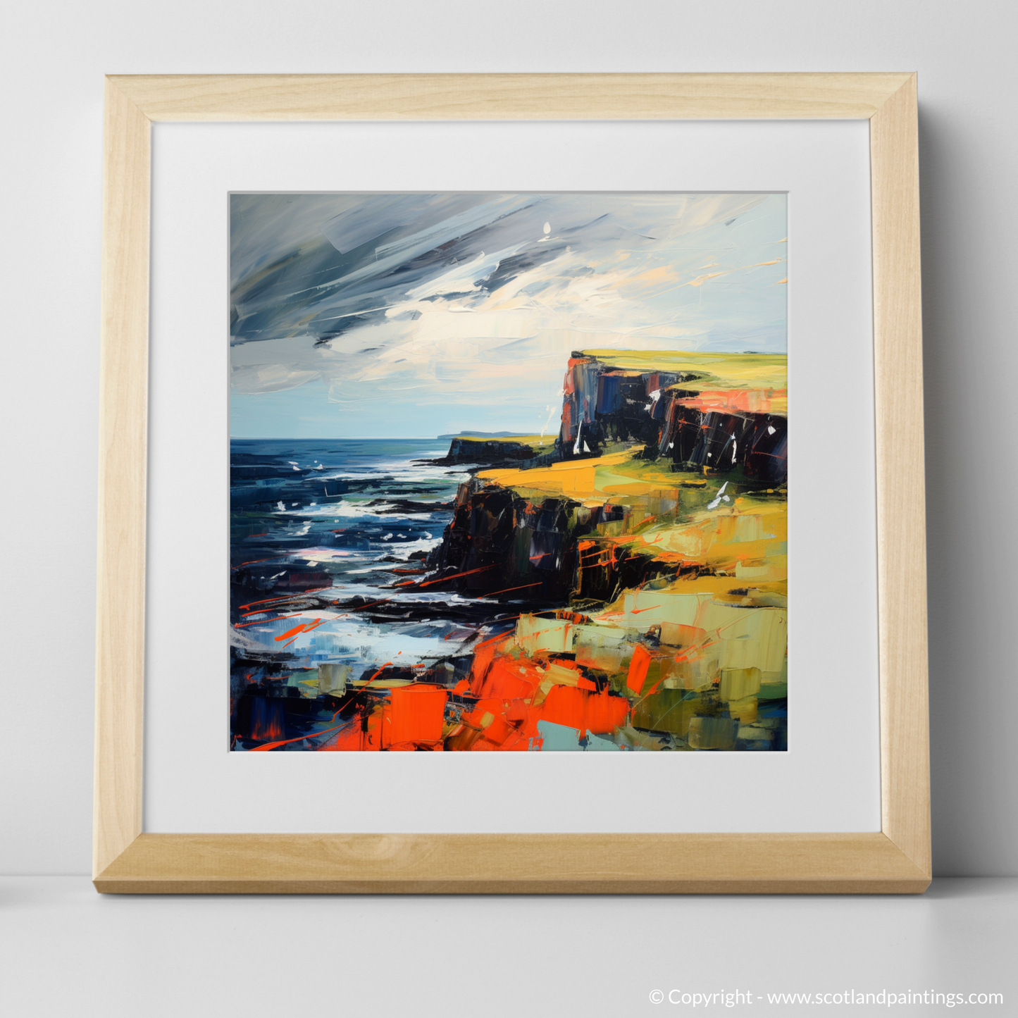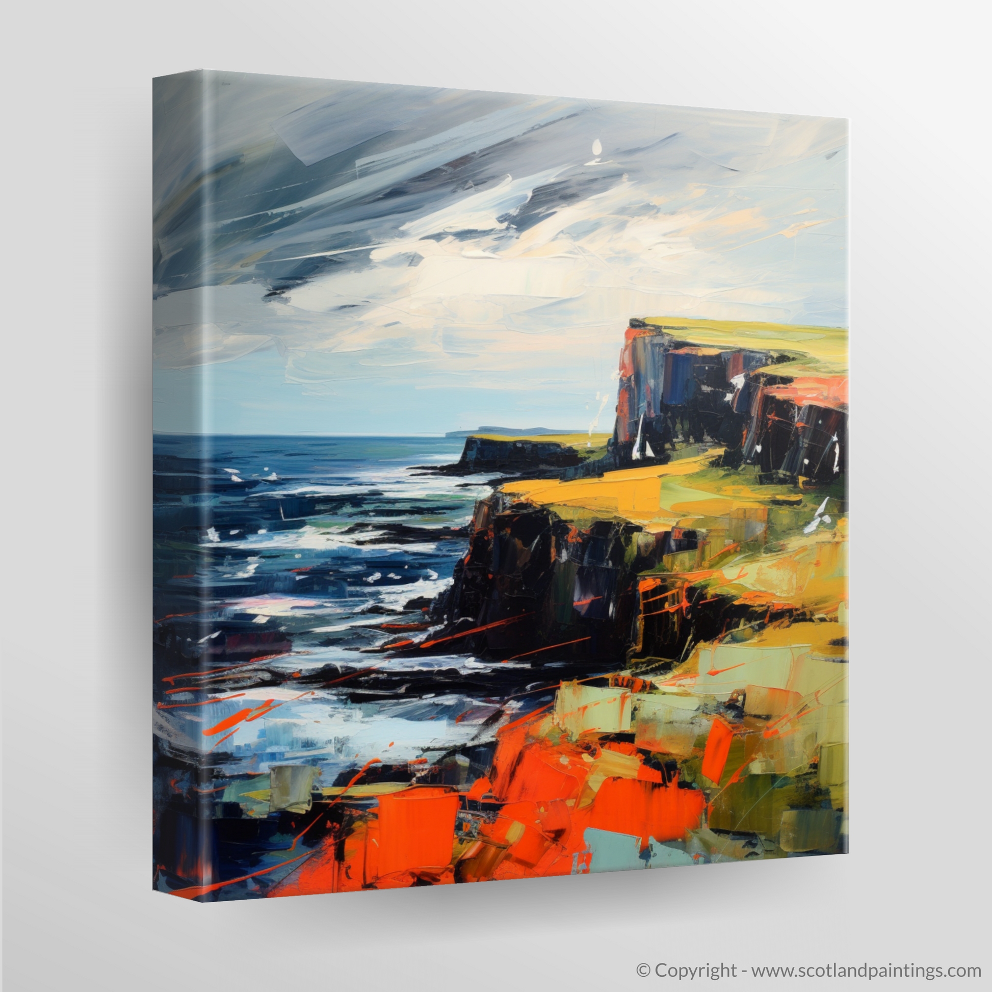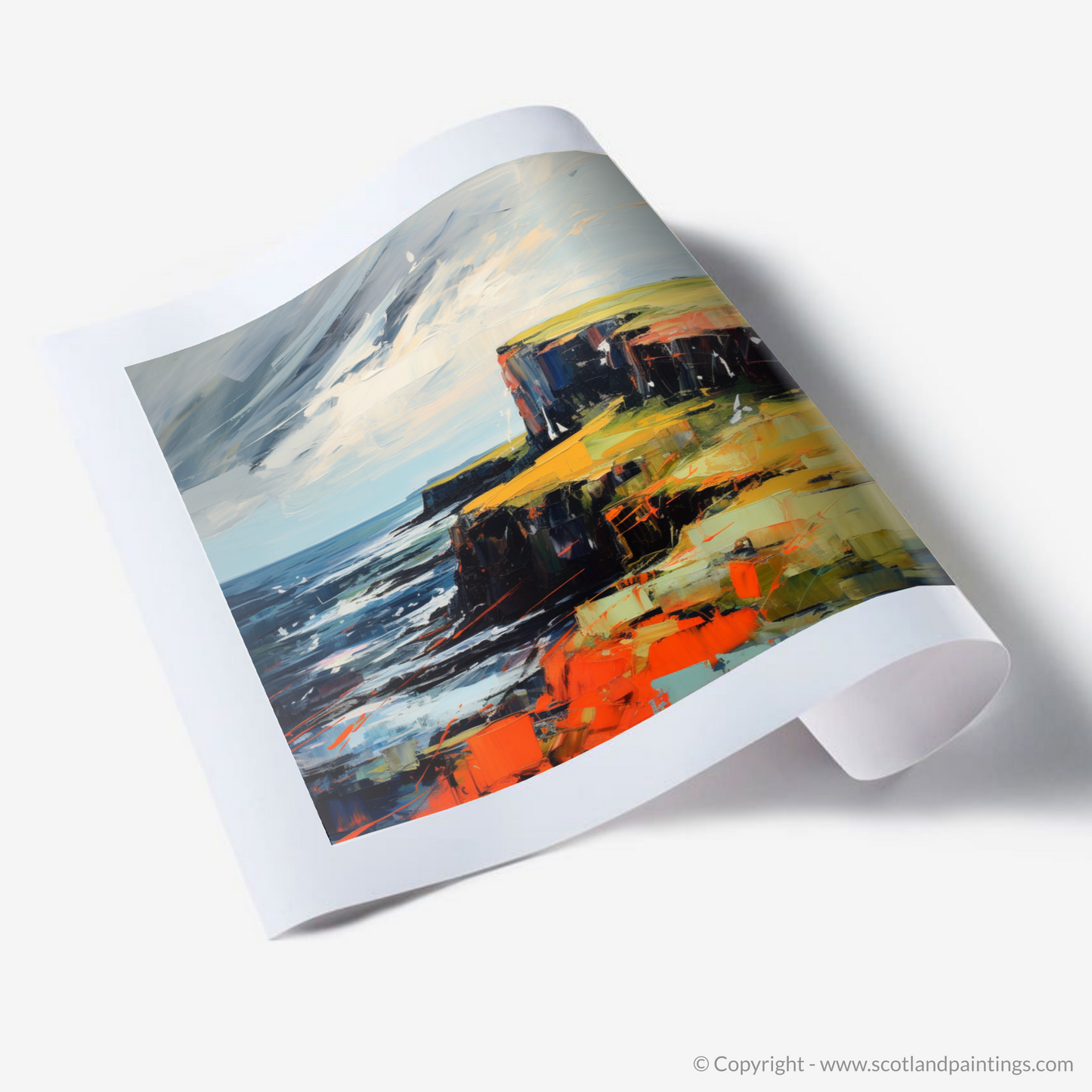 Capturing the rugged beauty and untamed spirit of Orkney, this evocative print invites you to experience the raw, natural splendour of Scotland's northern archipelago. Dynamic brushstrokes and a bold palette convey the tumultuous mood of the sea as it meets the ancient, rocky cliffs. Deep blues and tumultuous waves suggest the powerful currents of the North Sea, while the sky, a whirl of greys and whites, seems to echo the ceaseless movement of the tides.