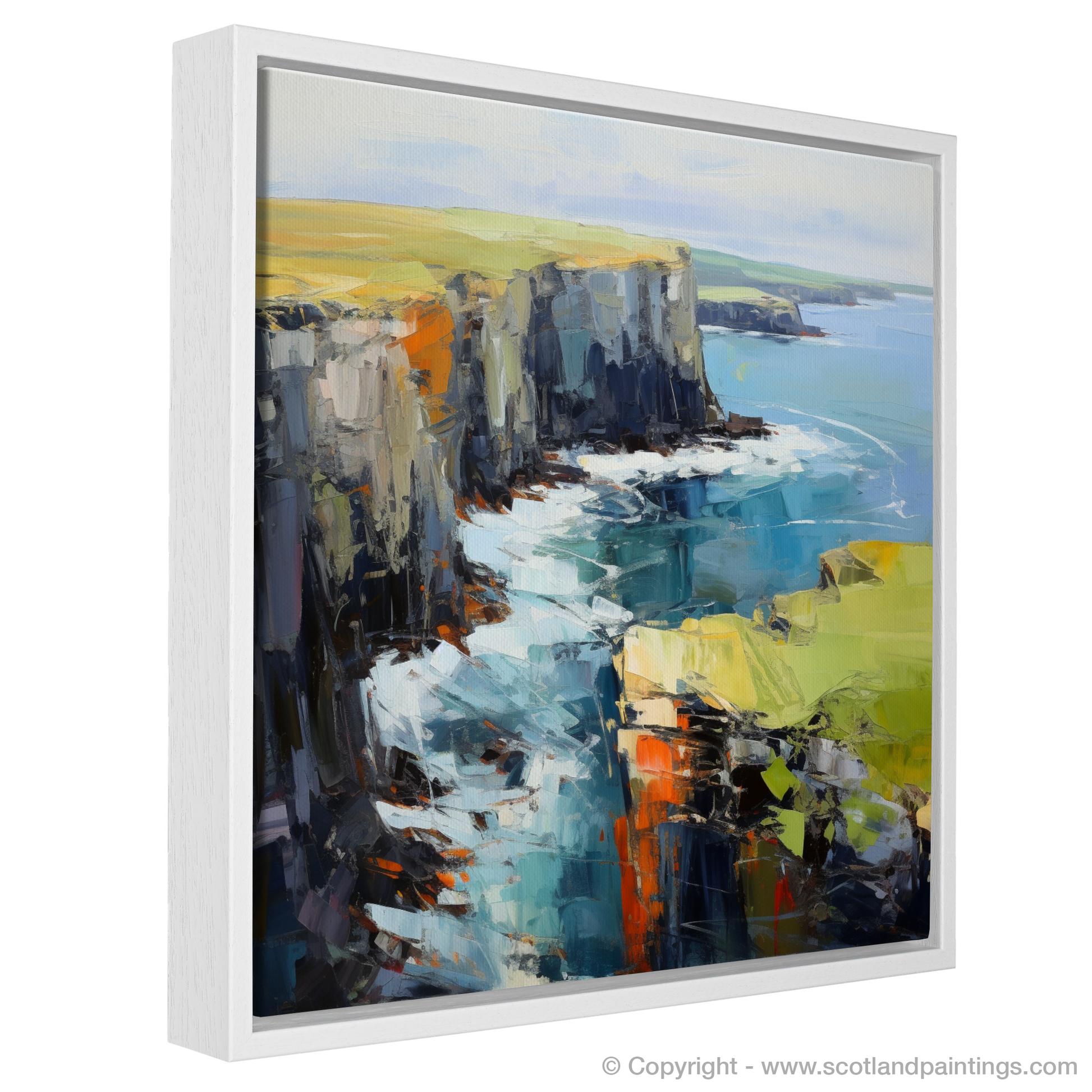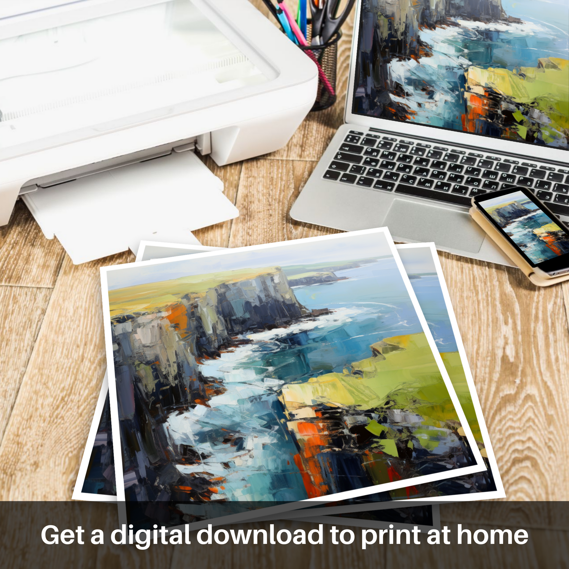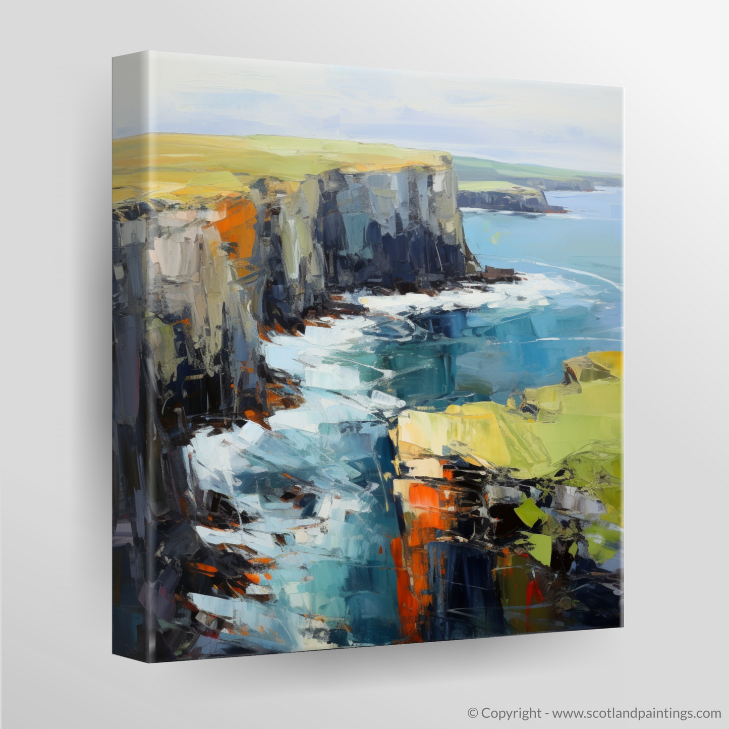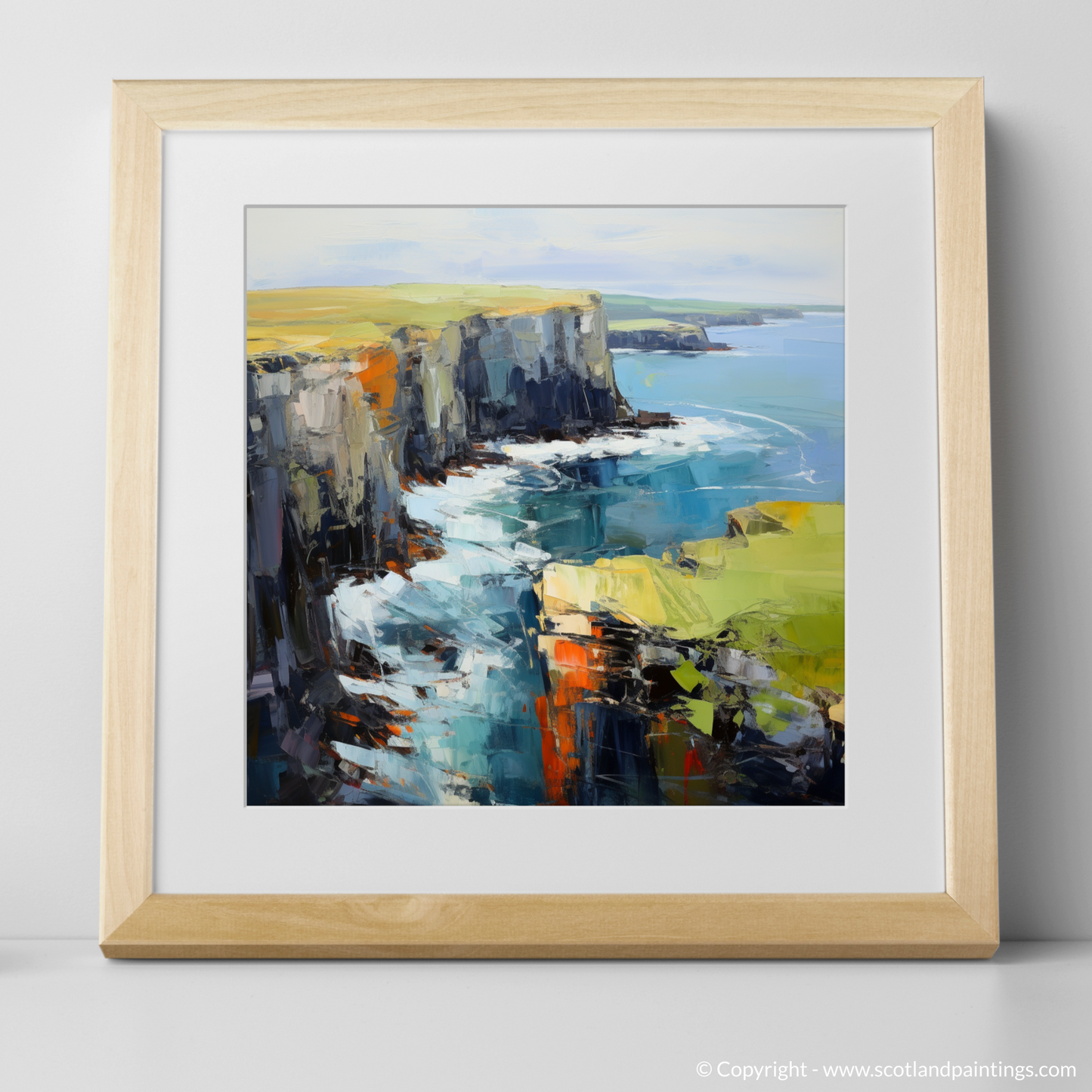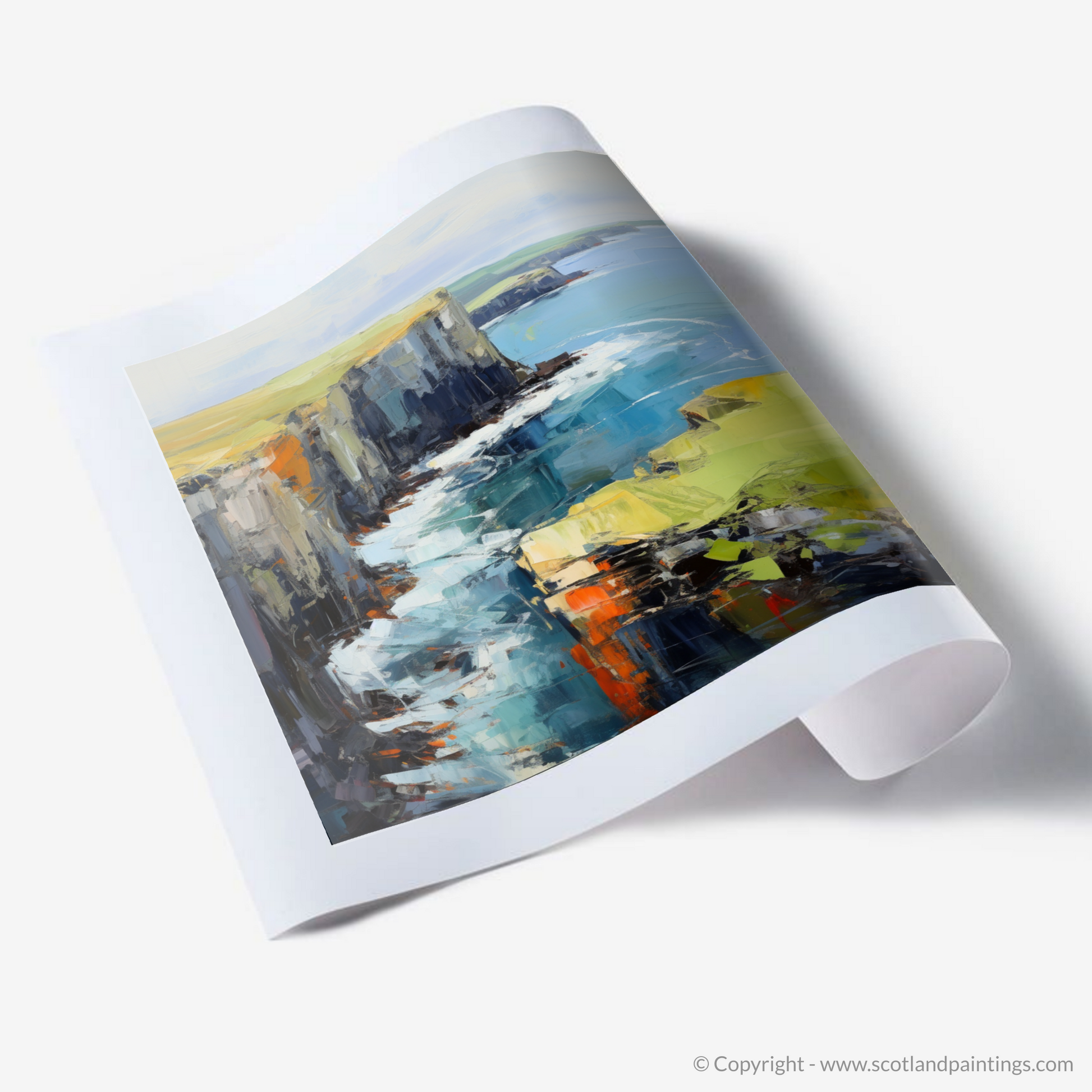 Capturing the rugged beauty of the Orkney archipelago, this vibrant print brings to life the untamed charm of Scotland's northern isles. Bold strokes and a dynamic palette evoke the raw energy of the cliffs, where shades of ochre and amber meet the crisp blues of the surrounding waters. The vivid, almost tangible textures suggest the movement of the waves crashing against the steadfast rock formations.