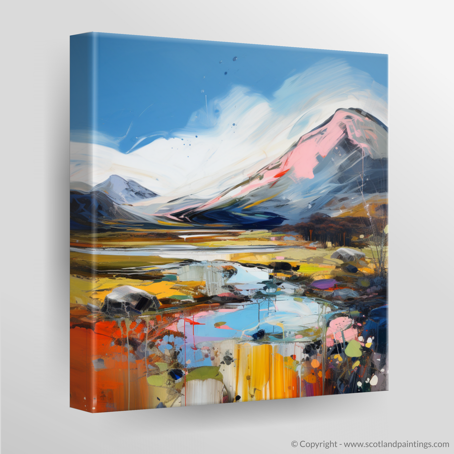 Capture a piece of Scotland's rugged natural beauty with this vibrant expressionist rendition of Geal-chàrn, one of the esteemed Scottish Munros. The artwork pulsates with dynamic brushstrokes, encapsulating the tumultuous spirit of the Highlands. Vivid splashes of crimson and azure dance across the snow-capped peak, suggesting a sky awash with the soft glow of dawn or the fiery tints of dusk.