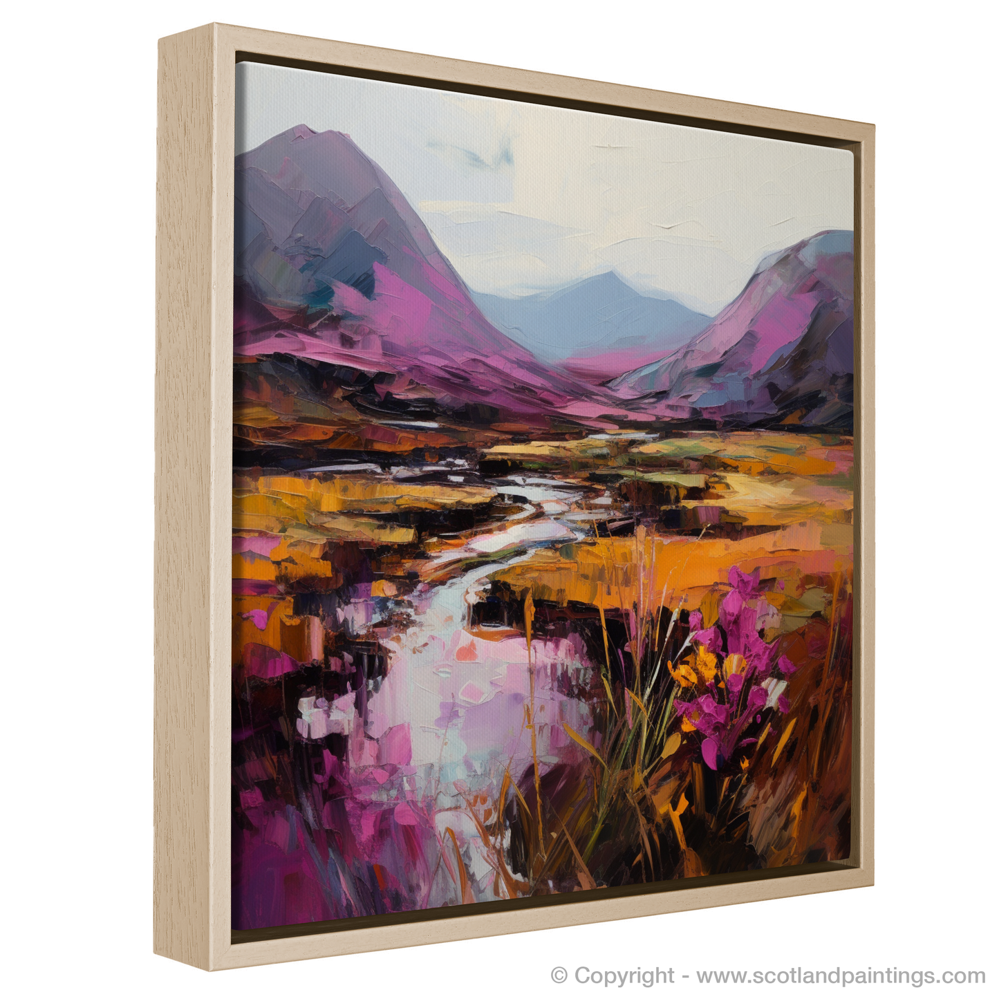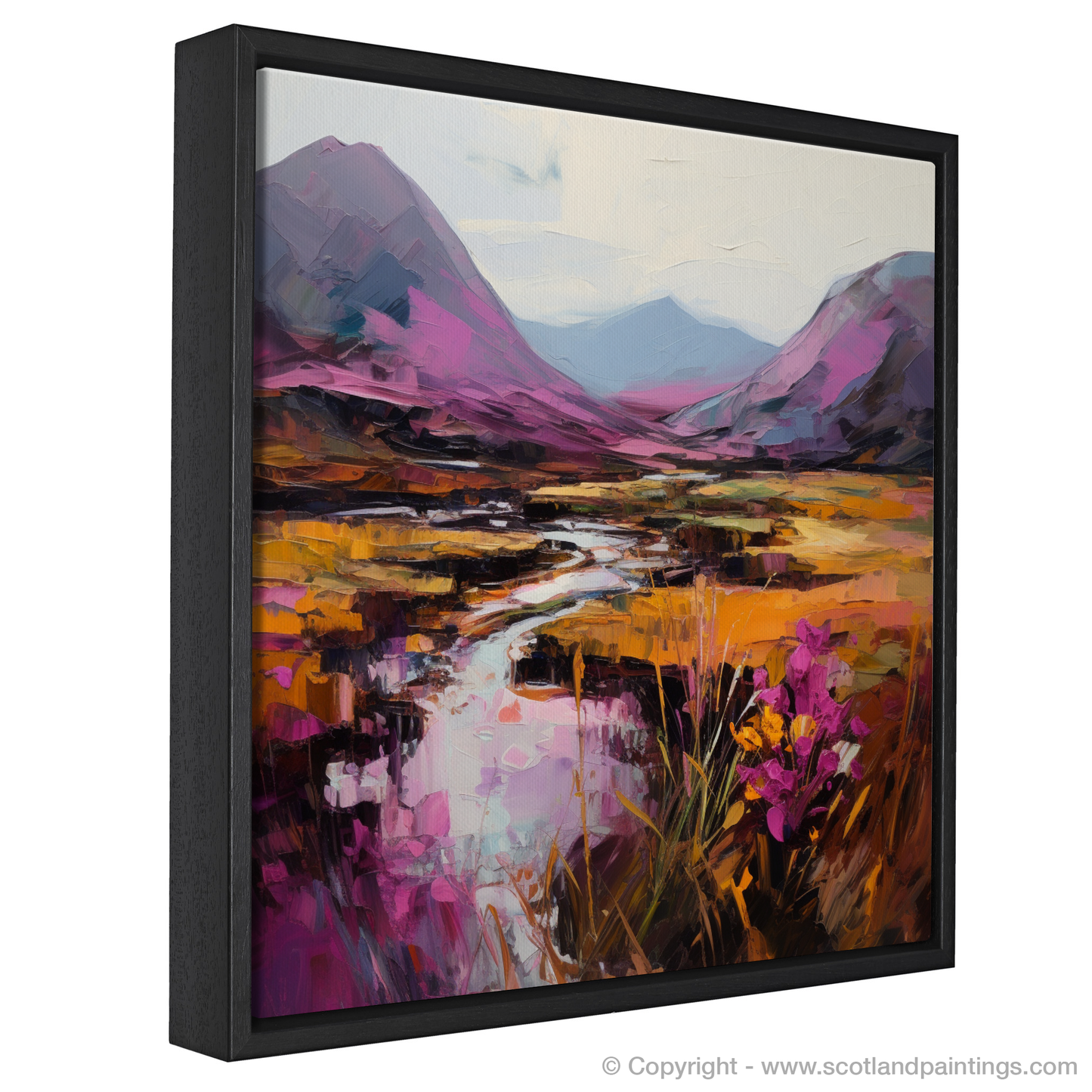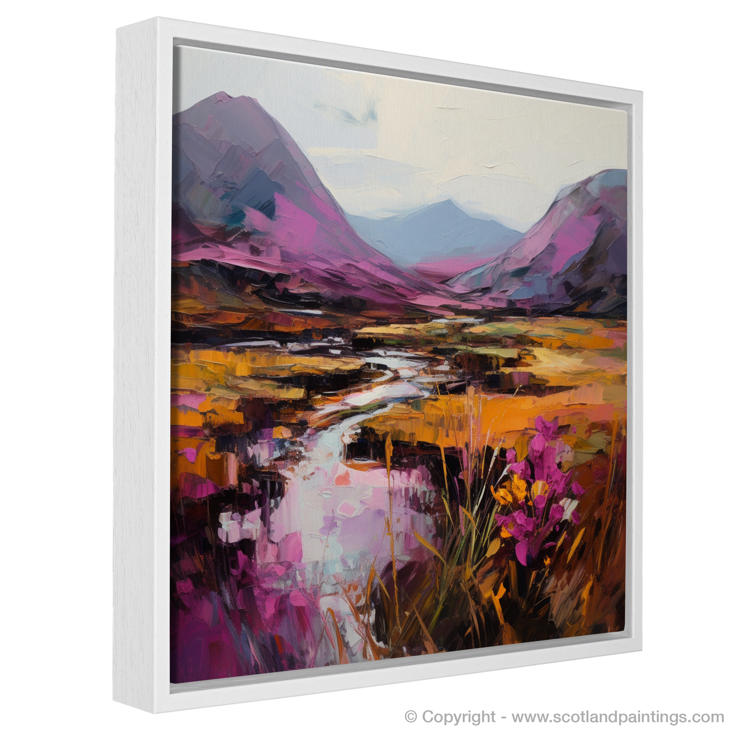 Capturing the raw beauty of the Scottish Highlands, this expressive print translates the untamed charm of Glencoe into a visual symphony. At the forefront, an eye-catching cluster of purple heather commands attention, its vibrant hues a celebration of nature's palette. These wildflowers, synonymous with the rugged landscape of Scotland, are rendered with bold, impasto strokes that convey a sense of depth and texture.