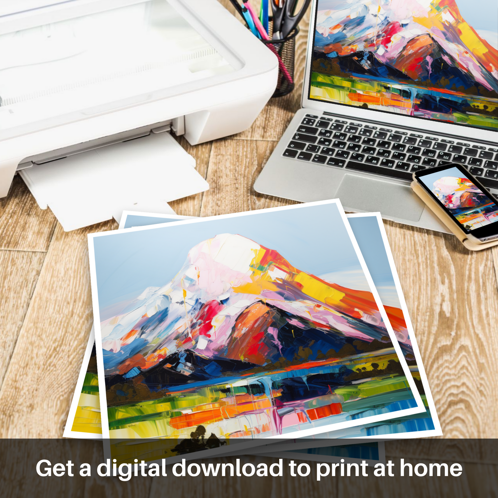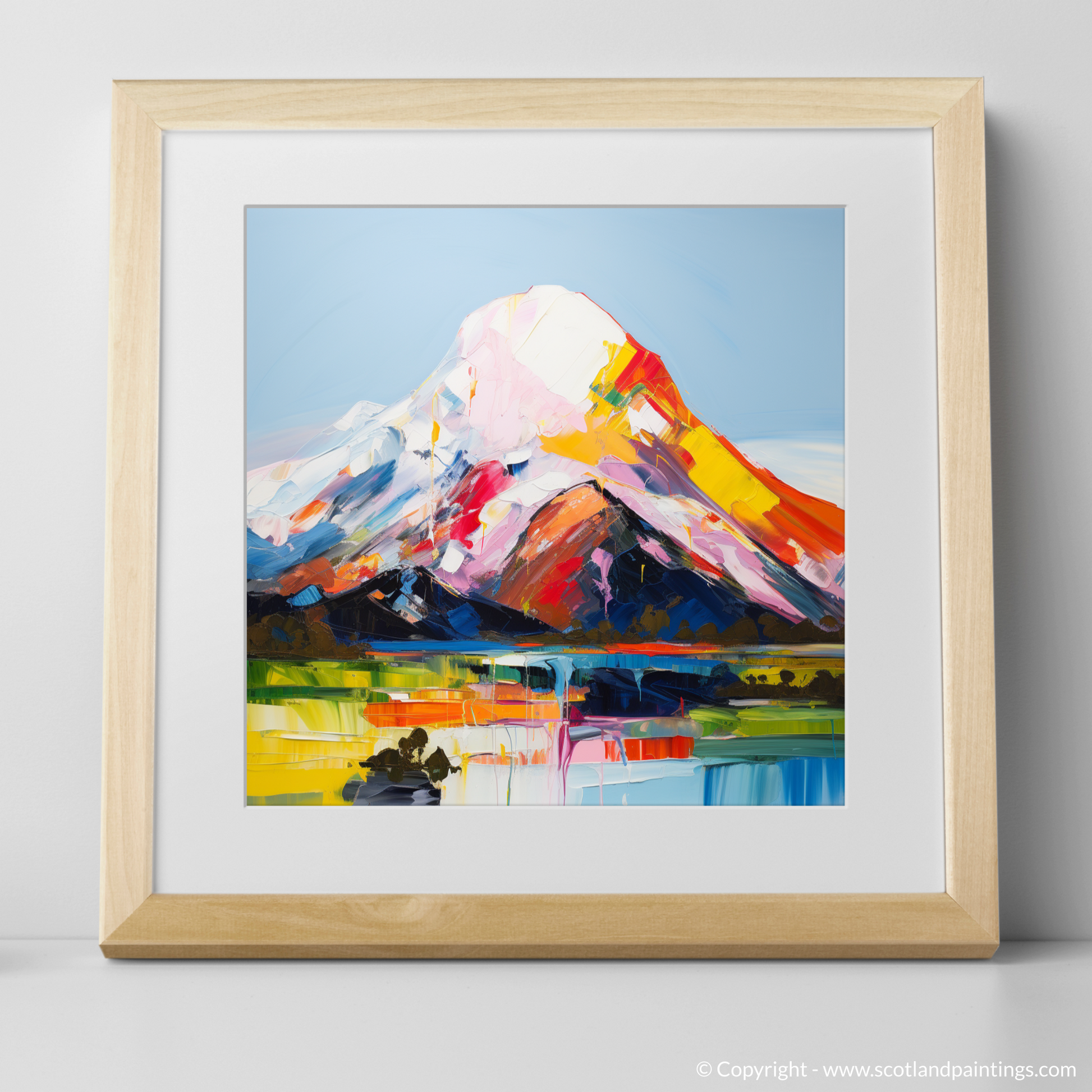 Capturing the rugged spirit of the Scottish landscape, this vibrant expressionistic interpretation of Mount Keen offers a swirling tapestry of colour and emotion. Bold strokes of red, orange, and yellow converge on the mountain's peak, giving the sense of a sunrise infusing the scene with warmth and vitality. The stark contrasts with the cool blues and purples suggest the shadowy valleys and the chilly breath of high altitudes.