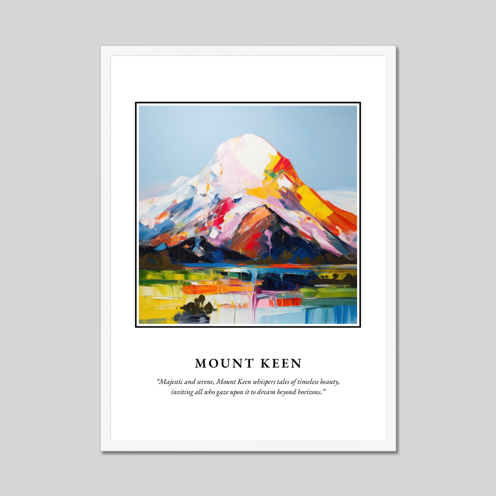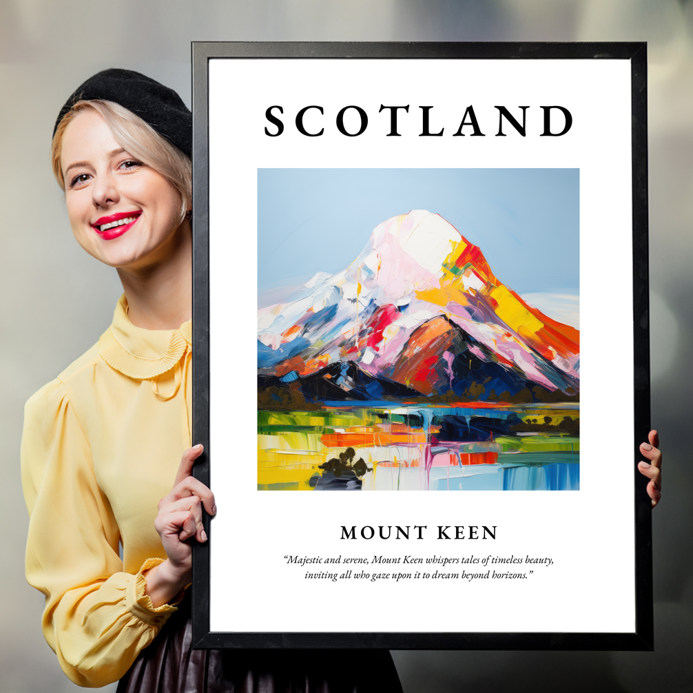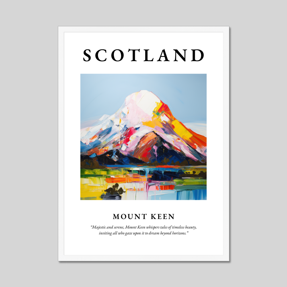 Dominating the design, the word "SCOTLAND" stands proudly in bold lettering, setting the stage for the vivid Expressionist painting of Mount Keen. This vibrant depiction bursts with an array of colours, capturing the mountain’s grandeur and emotive essence. The dramatic brushstrokes and vivid hues invite you to explore the mystique and majesty of Mount Keen, offering an imaginative look at one of Scotland's most beloved natural wonders. Beneath this evocative artwork lies an equally stirring quote: “Majestic and serene, Mount Keen whispers tales of timeless beauty, inviting all who gaze upon it to dream beyond horizons.”