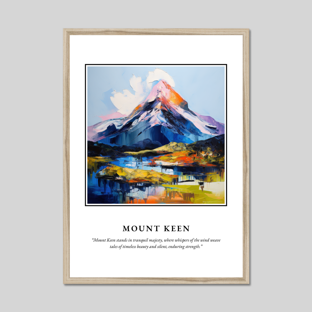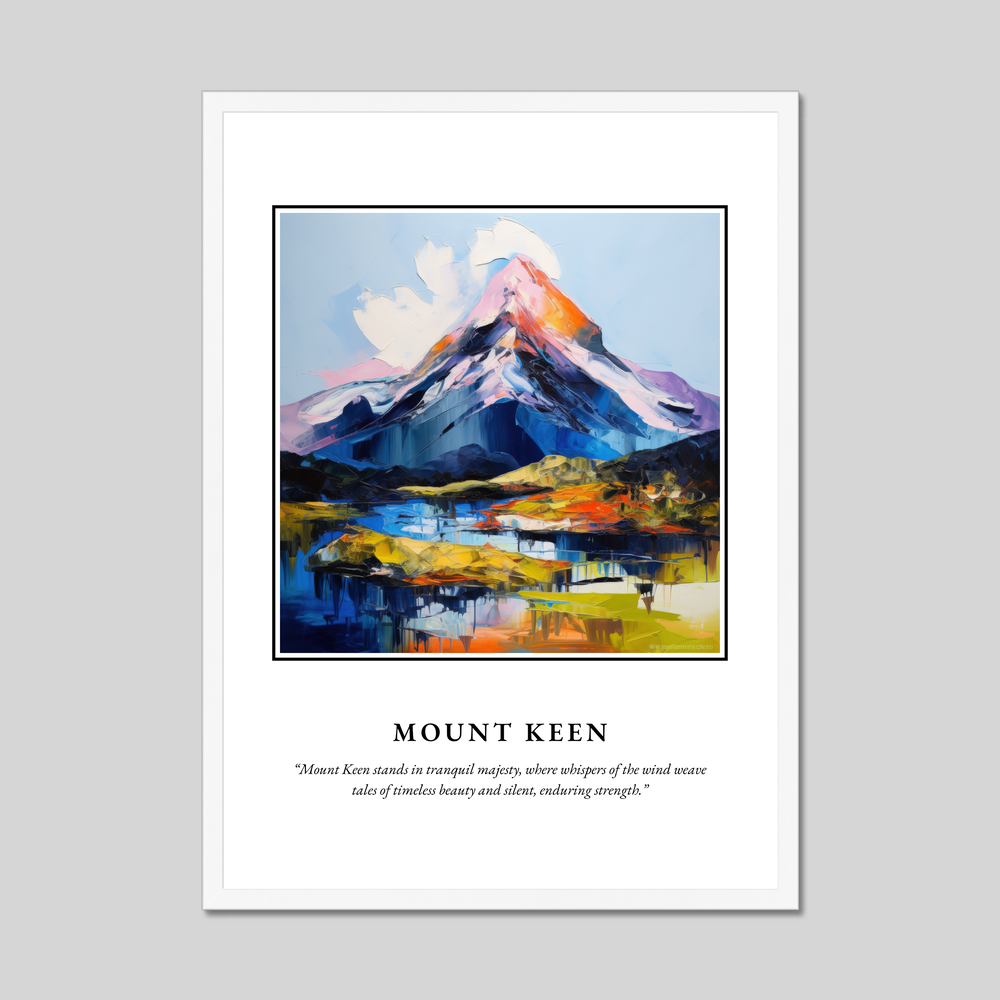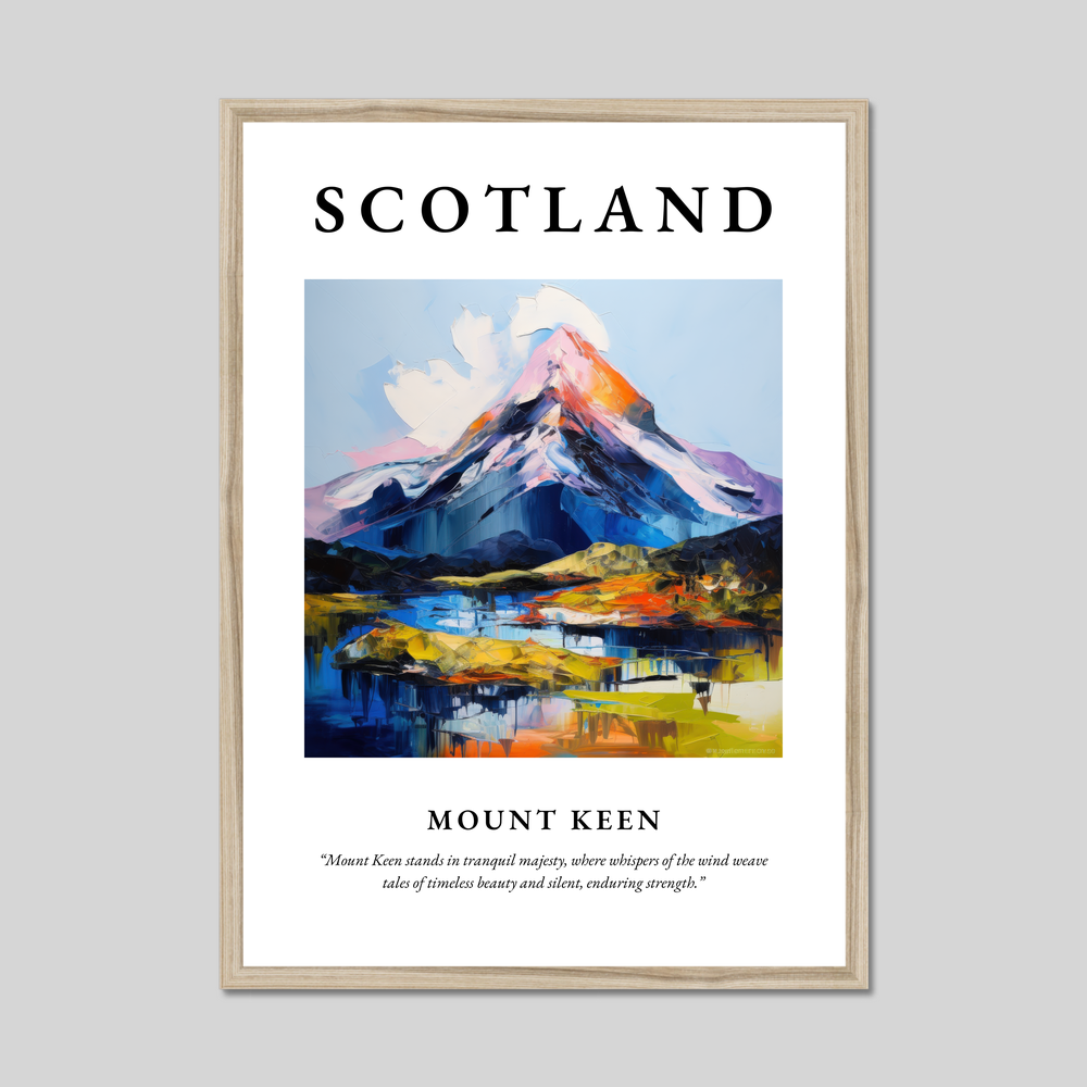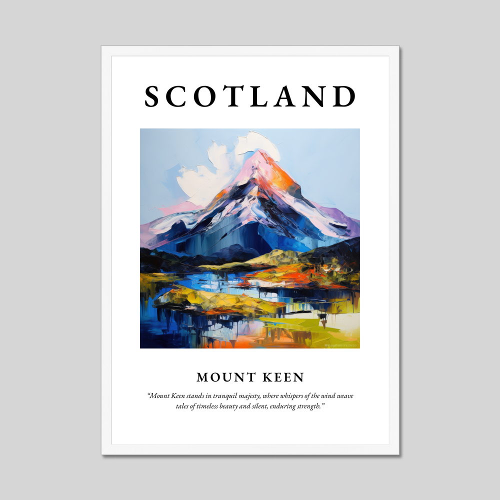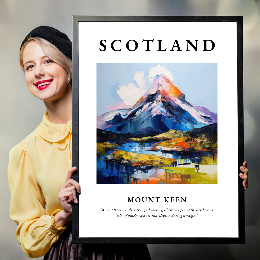 The word “SCOTLAND” dominates the top in bold lettering, heralding the magnificent Expressionist painting of Mount Keen below. This vivid artwork captures the mountain’s untamed spirit, where the artist's bold brushwork and dynamic colour palette evoke the untold stories and storied winds that sweep across its ethereal peaks and valleys. Beneath the painting, the words “Mount Keen stands in tranquil majesty, where whispers of the wind weave tales of timeless beauty and silent, enduring strength” invite reflection and connection to this timeless landscape.