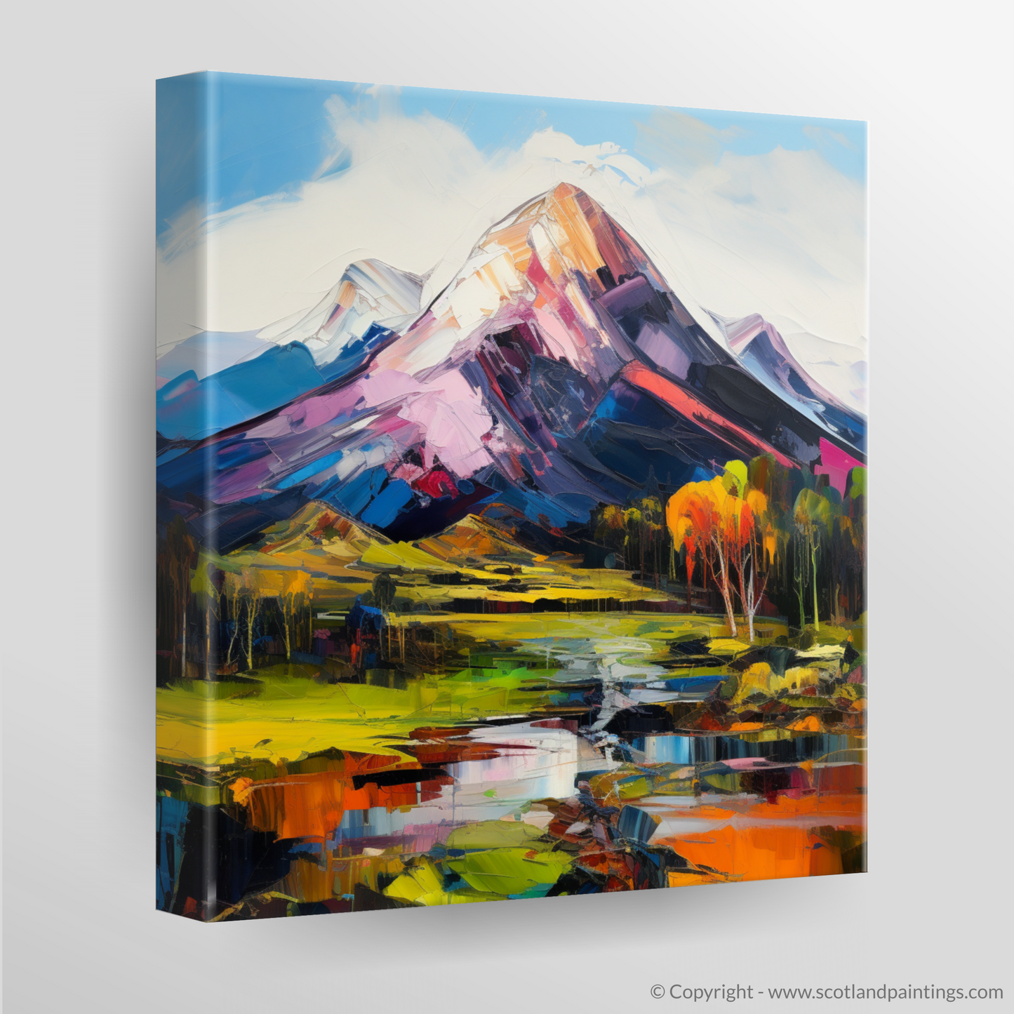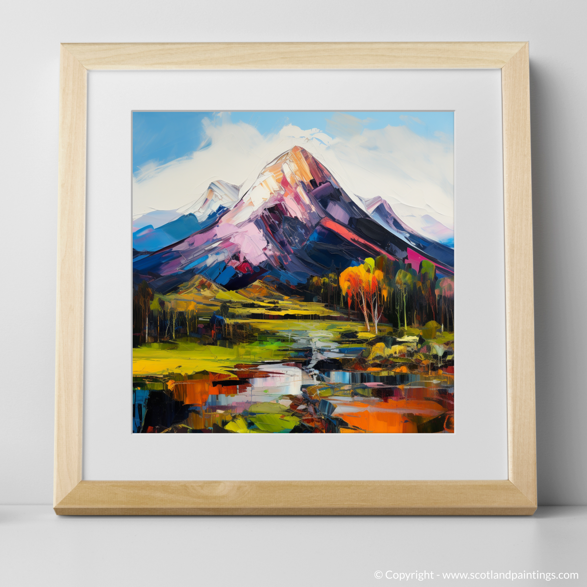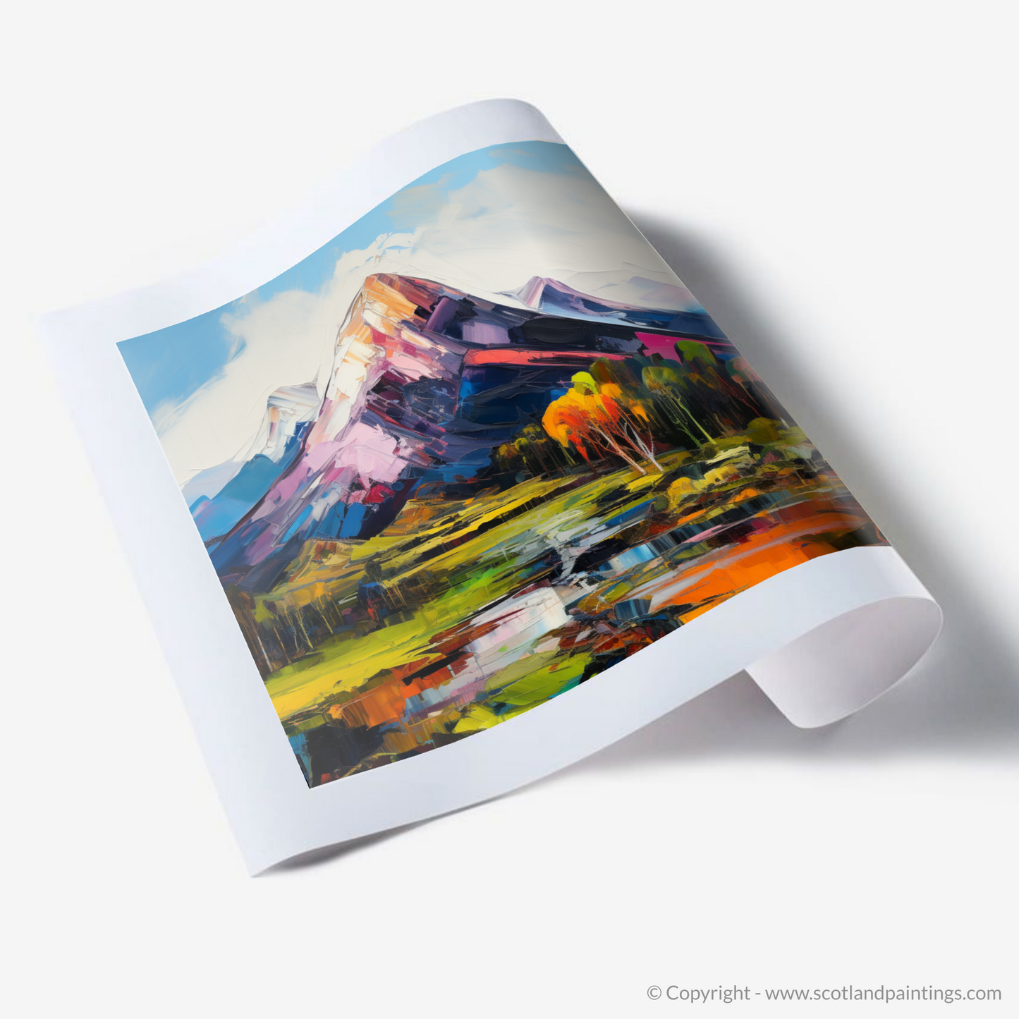 Capturing the rugged beauty of the Scottish Highlands, this vibrant print showcases the majestic Ben Lomond in an awe-inspiring blend of colour and dynamic brushwork intrinsic to Expressionism. The print's foreground is adorned with a vivid, reflective body of water, mirroring the fiery hues of the landscape and sky. Fluorescent yellows and greens compose the undulating fields, leading to a middle ground punctuated by autumnal trees in shades of burnt orange, signalling the changing of seasons.