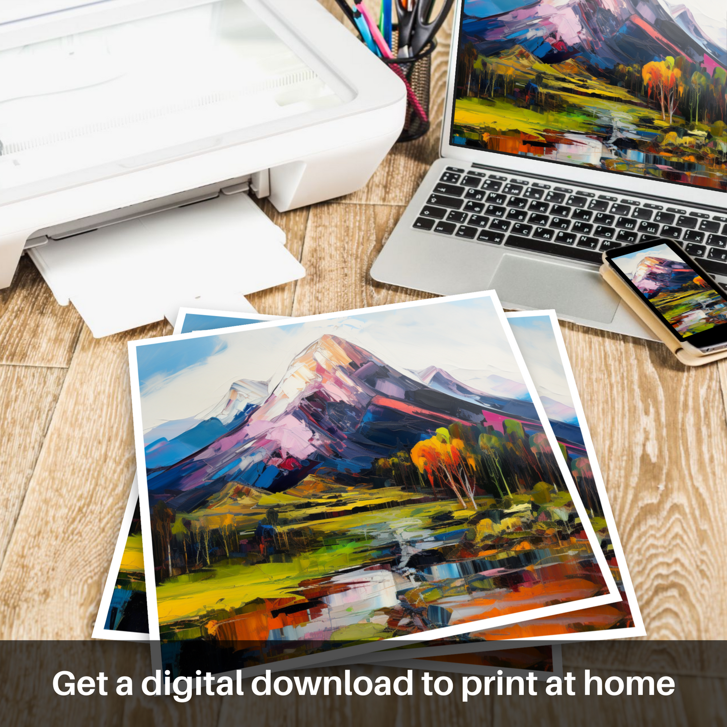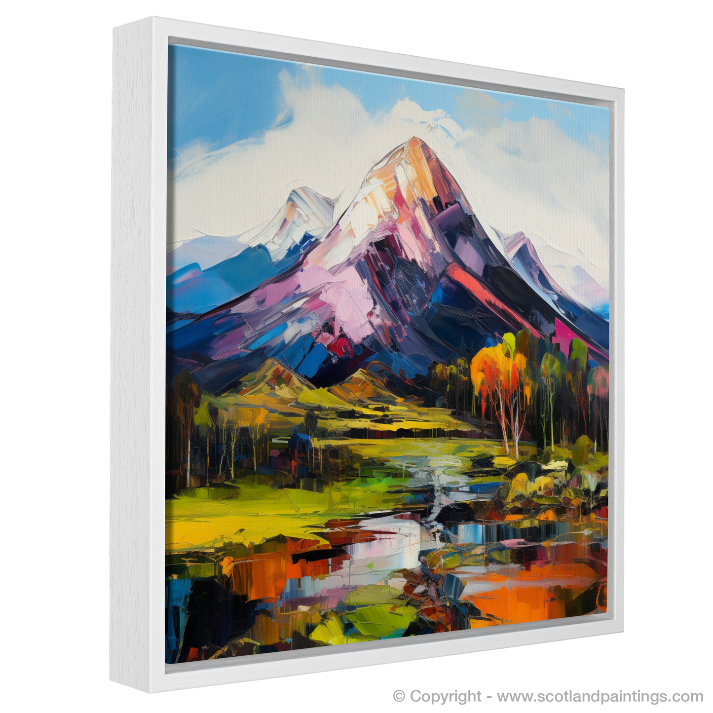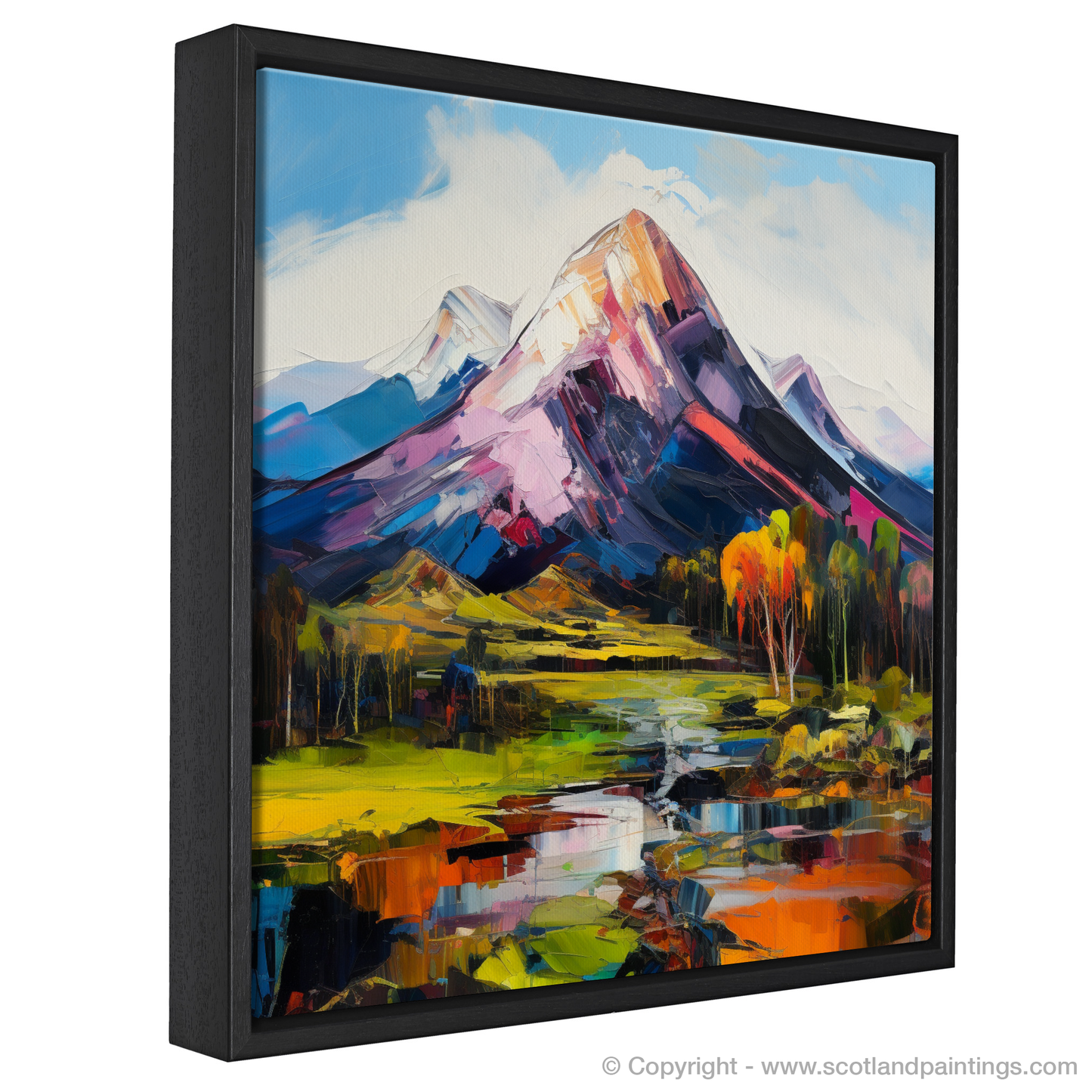 Capturing the rugged beauty of the Scottish Highlands, this vibrant print showcases the majestic Ben Lomond in an awe-inspiring blend of colour and dynamic brushwork intrinsic to Expressionism. The print's foreground is adorned with a vivid, reflective body of water, mirroring the fiery hues of the landscape and sky. Fluorescent yellows and greens compose the undulating fields, leading to a middle ground punctuated by autumnal trees in shades of burnt orange, signalling the changing of seasons.
