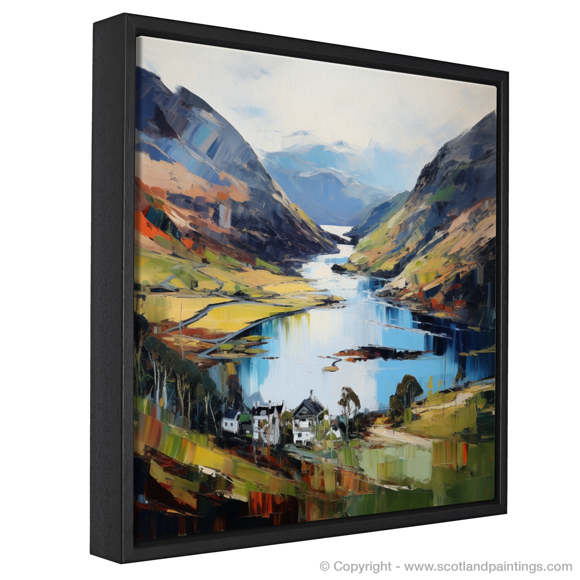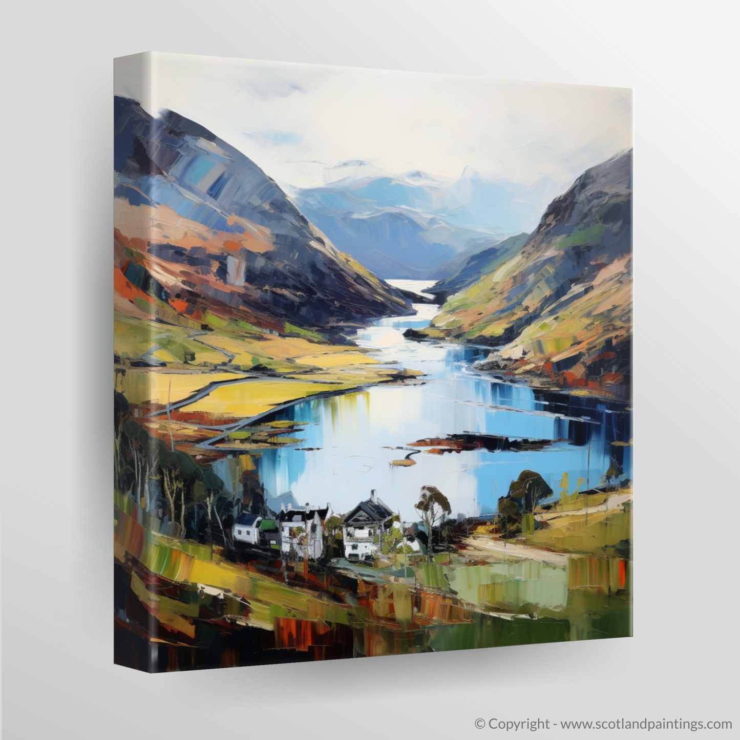 Small clusters of white-washed cottages nestle at the water's edge, intimate human imprints within the vast natural expanse. The composition masterfully balances the grandeur of the Scottish Glens with a touch of humanity's synergy with nature. Every brushstroke in this piece is deliberate, contributing to an overall impression that is both turbulent and serene, echoing the temperamental weather for which Scotland is well-known.